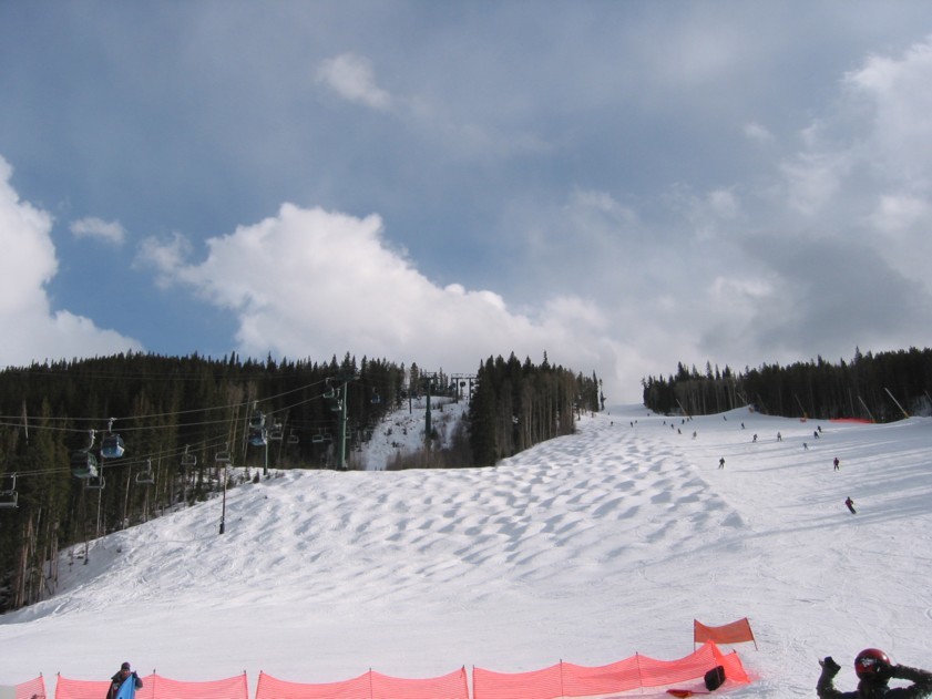 Die Südseite des North Peak bietet zwei super Abfahrten „Spillway“ und „Anticipation“, beide mittelsteil, unten dann ziehwegähnlich den Taleinschnitt zwischen North Peak und dem Outback nutzend zur Talstation der 4SB Wayback (1991, DM), dem Rückbringer auf den North Peak. Das ist übrigens die einzige fixgeklemmte Sesselbahn die man in Keystone benutzen muss.