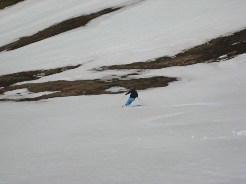 Zum Mittagstal natürlich aber auch. Man fährt ja von der Pordoi-Bahn erstmal in die Scharte rein und muss dann bis zum Felsrand der Boe-Spitze ca. 120Hm aufsteigen. Im Winter ist dort ja ein Wanderweg ausgetreten, jetzt macht man's aber viel leichter mit Tourenski, weil man sonst mangels Spur im Tiefschnee stapfen müsste...