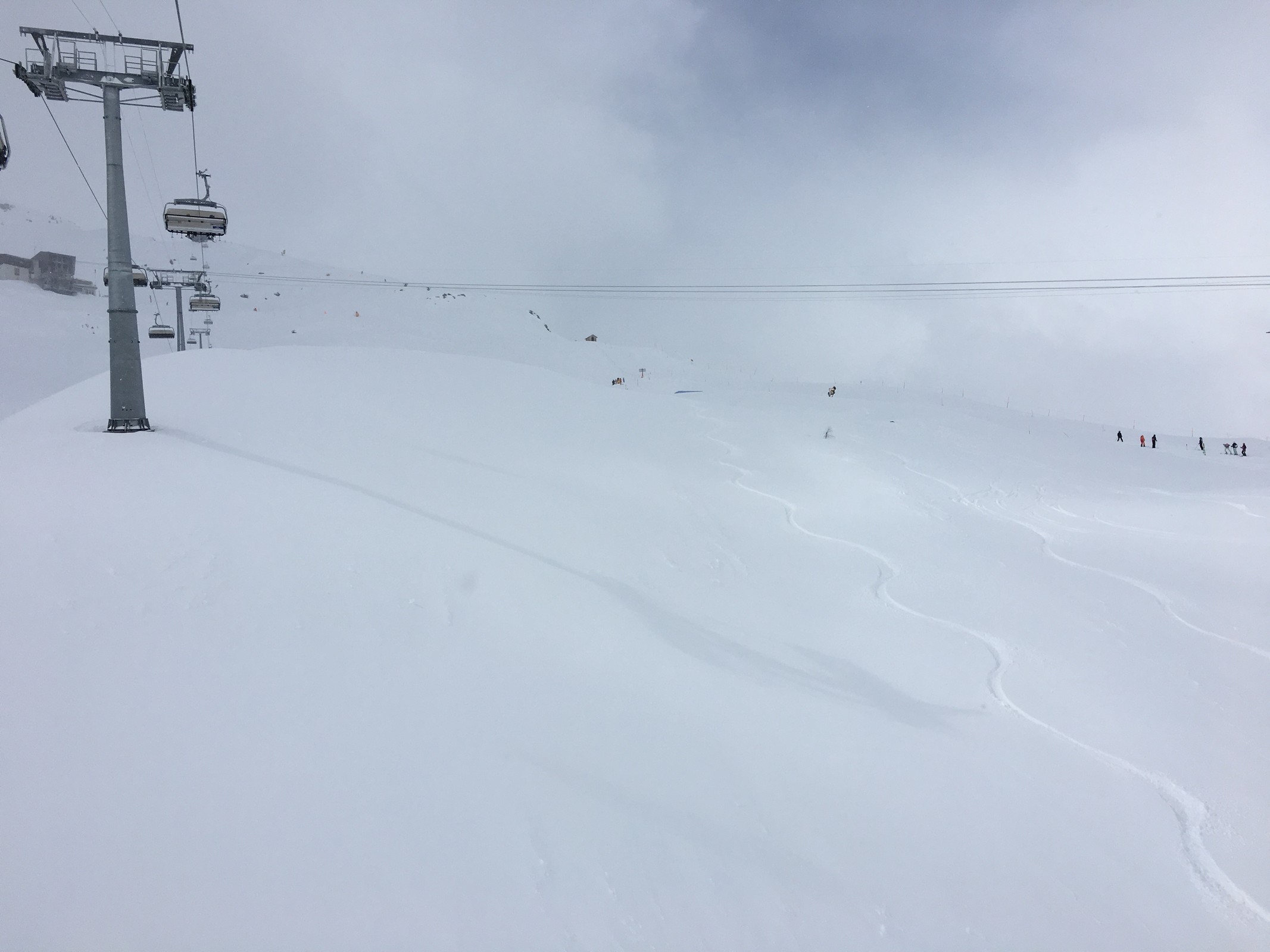 Damit aber genug Nostalgie. Die Talabfahrt nach Dieni macht wohl bald schlapp - ich bin heute Morgen allerdings freiwillig noch 3x bis ganz runter gefahren, weil der Sulzschnee so schön war. Ab Planatsch aufwärts herrschen immer noch hochwinterliche Schneemengen vor, also kein Problem. Das wird bis Ostern halten; angesichts der Prognosen ("sehr warm") stellenweise wohl nur knapp.