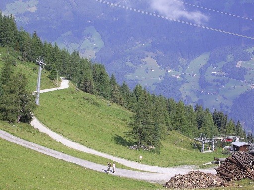 ^ Blick von der steilen DSB Arbiskogel zum Berggasthof, dem SL und der PB-Bergstation (rechts am Bildrand). Bildmitte ganz oben wären die Hänge am Kreuzwiesen-SL (Zell am Ziller).