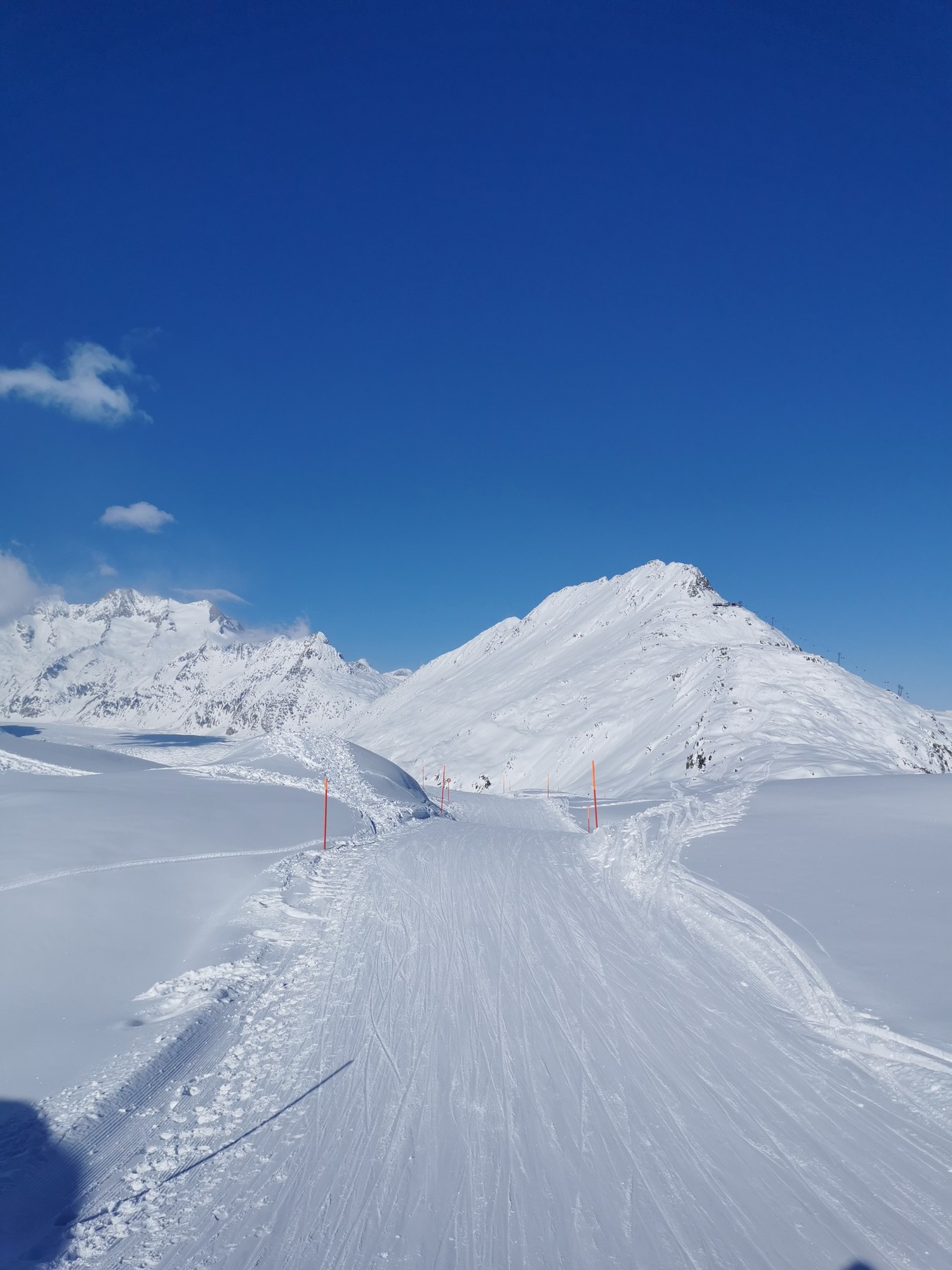 Einige Pisten schwächelten ob der Wärme und gnadenlosen Sonne mit kleineren aperen Stellen. Insgesamt ist die Schneelage aber noch sehr gut und problemlos. Und jetzt mit dem stark eingeschränkten Betrieb (insbesondere auf der Fiecheralp fährt ab heute nur noch Flesch) und dem kalten Wetter wird das bis Saisonende am Sonntag eh kein Problem mehr.