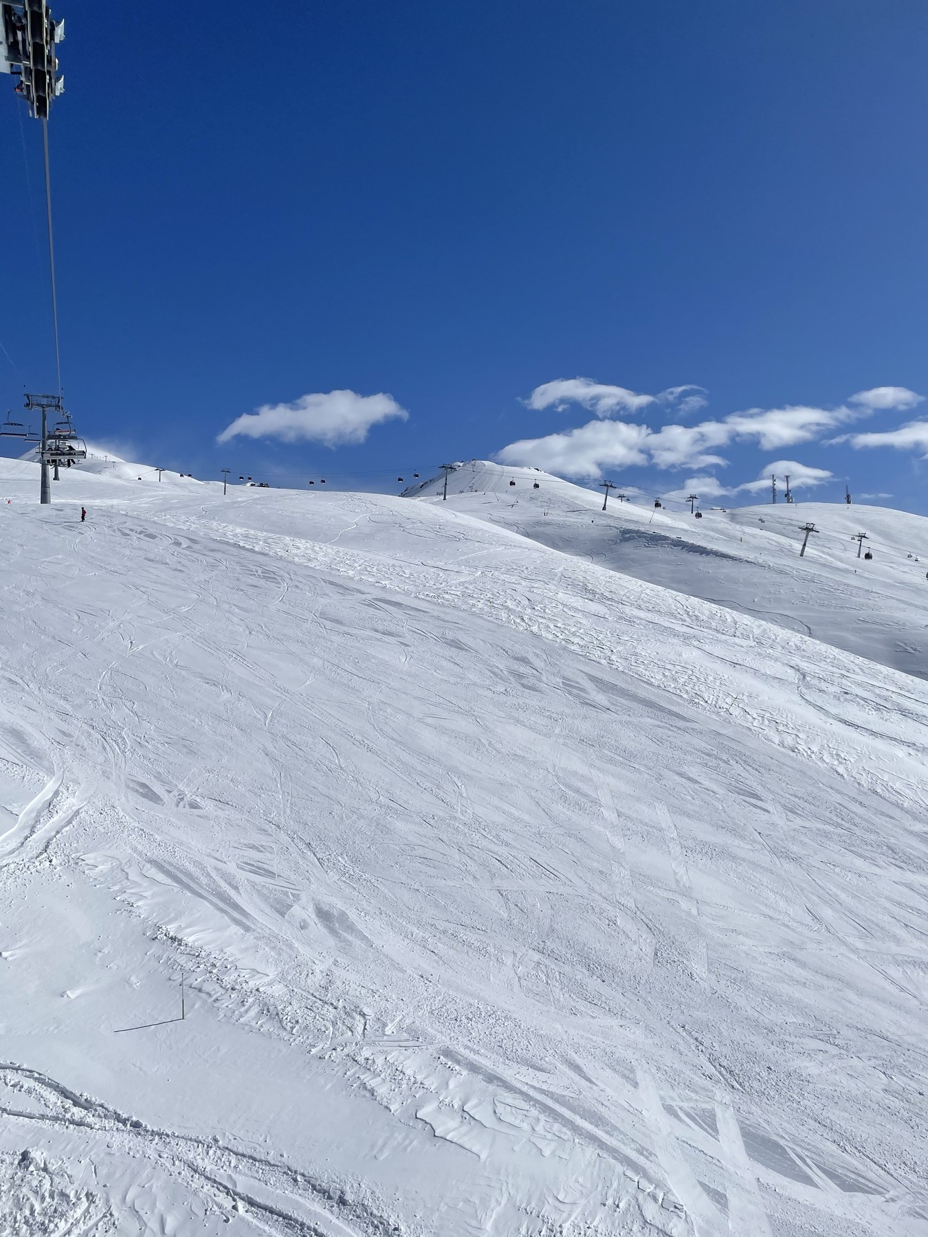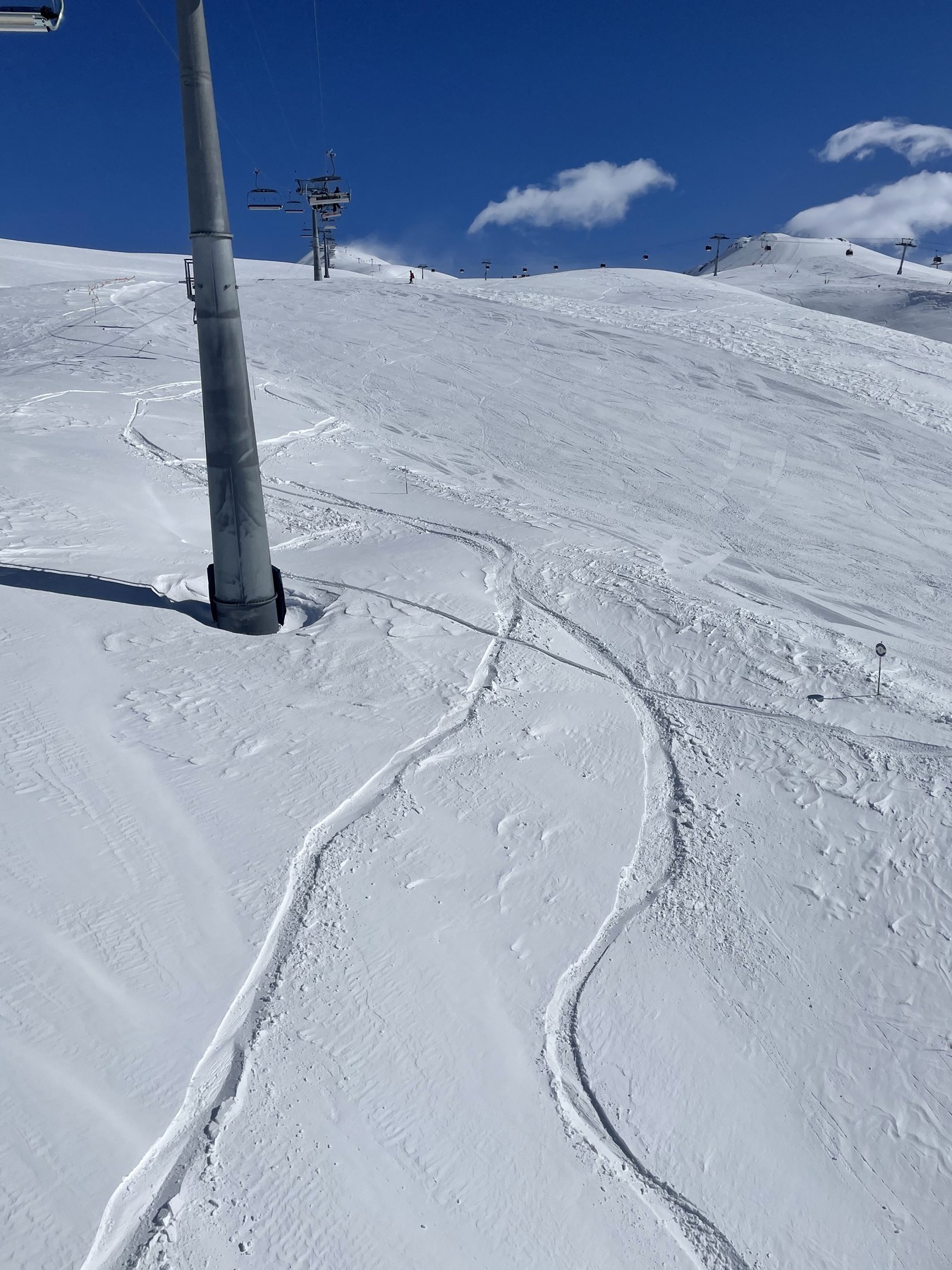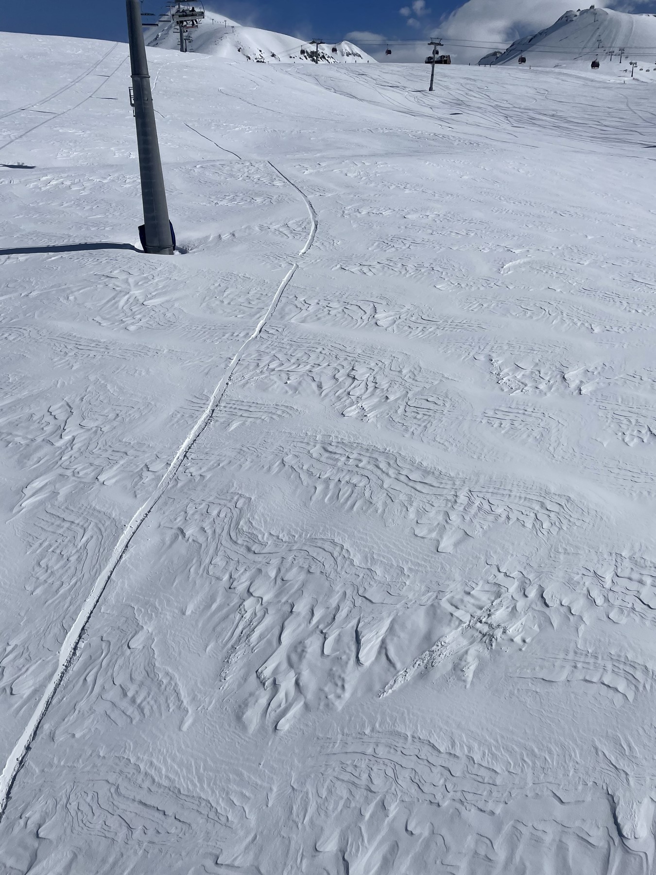 Es hatte die Nacht geschneit und waren so 10cm Neuschnee also rauf mit George dem Hotelbesitzer nach New Gudauri und von da los Auf dem Weg nach oben konnte man sehr schön sehen was an Schnee gefallen war..George kommt aus Gudauri und ist mit seinen 30 Jahren ein sehr guter Skier..war ein wenig hart als Snowboarder da mit zu halten . George jagte die Piste runter als wenn es kein Morgen geben würde , ...gleich um 09.15 Hochleistung....zwei Stunden lang raus und runter ohne Unterbrechung....war kaputt danach Wir waren dann auf der Hochebene und am Nachmittag war es recht windig - siehe Fotos des Sesselliftes....mußten dann ab da den Lift nach Kudebi schließen...