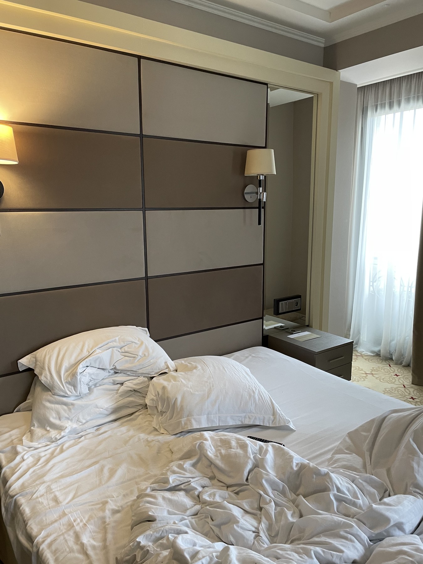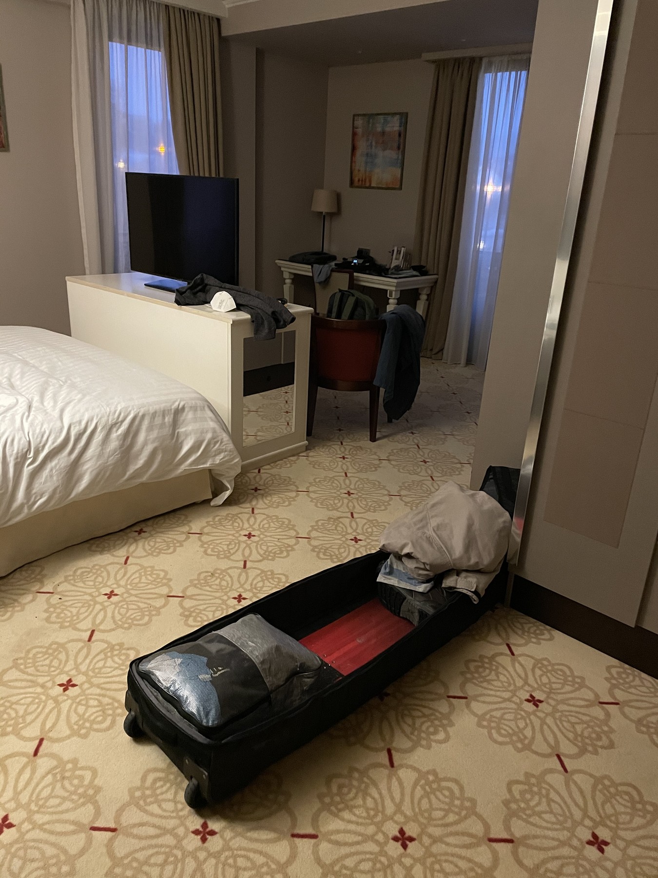Ich war um 04.00 mit dem Flug aus München angekommen , mein Fahrer brachte mich zum Hotel , war um 07.00 dort , dann Frühstück , um. 09.30 auf Zimmer , zwei Stunden schlaf und auf die Piste...