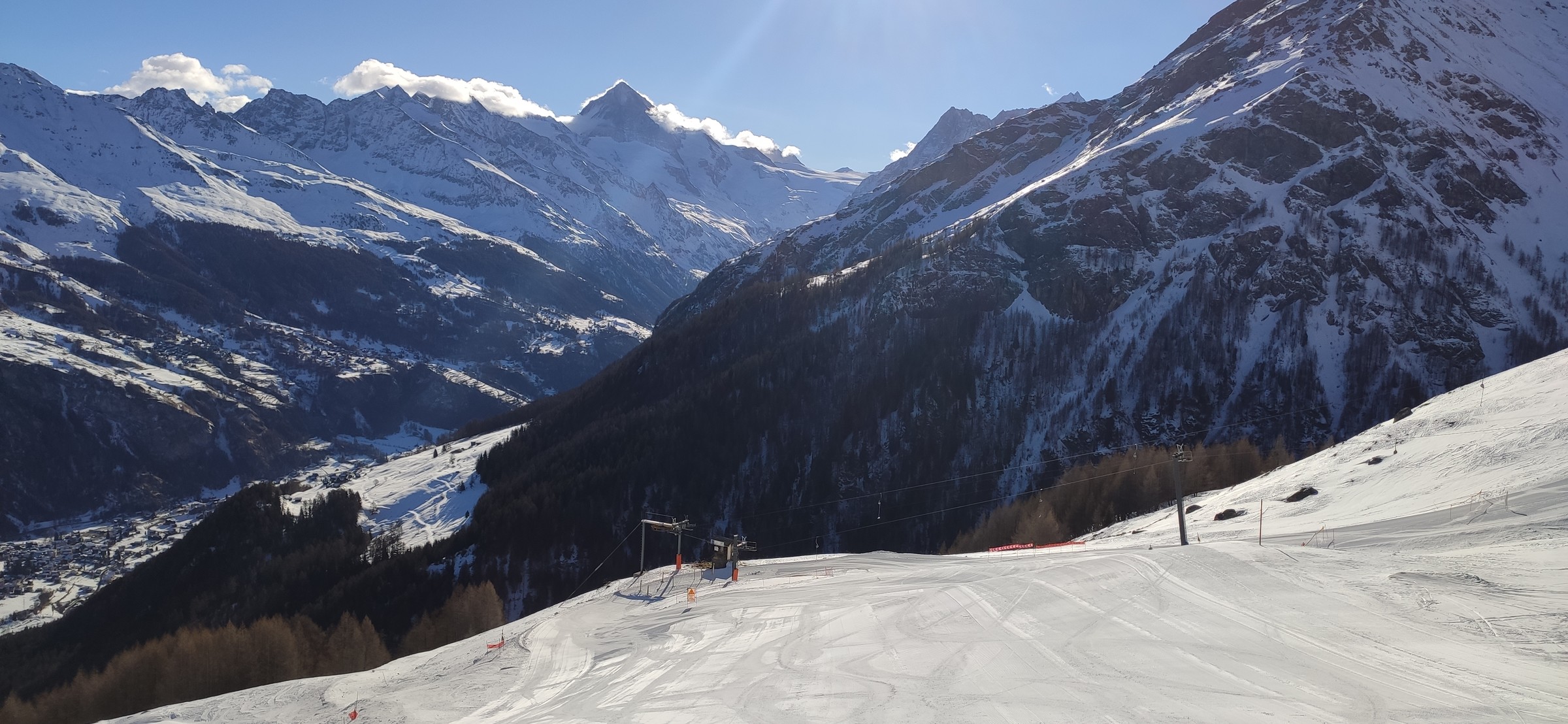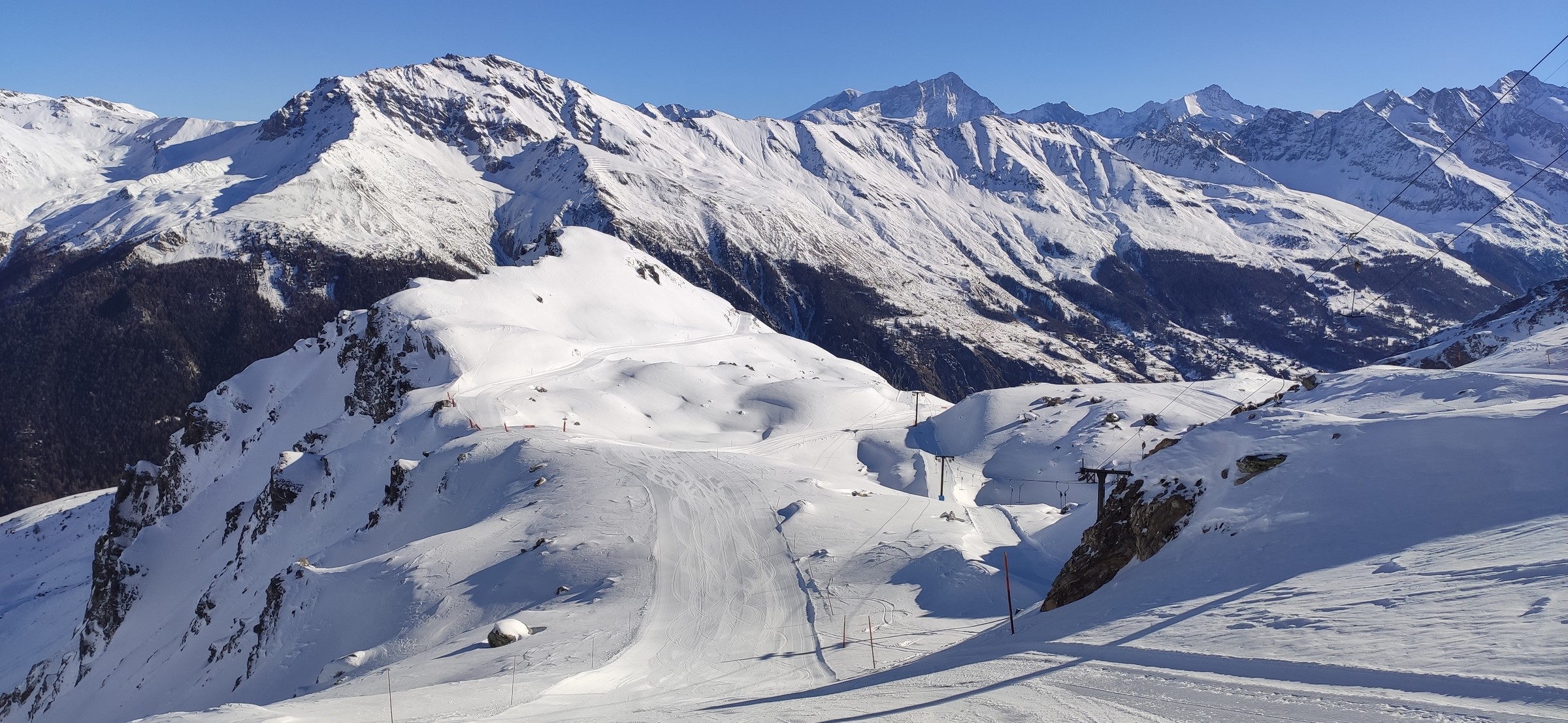 In Wirklichkeit war keine Piste präpariert worden. Abgesehen von der blauen Talabfahrt und der kurzen Piste, die zum Skitourenparkplatz hinunterführt. Alle Pisten im Skigebiet waren daher etwas vereist und ziemlich schlecht zu befahren. Der Schnee auf den Pisten war hart. Ich war wirklich enttäuscht über die schlechte Vorbereitung: Nach zwei Tagen Schließung wegen einer Panne und bei strahlendem Wetter, Schnee und dem Nouvelliste-Tag hätte ich erwartet, dass alle Pisten frisch präpariert sind. Leider habe ich mich geirrt. Die Zeiten, in denen Télé-Evolène jeden Tag alle Pisten präpariert hat, sind vorbei... Aber gut, vielleicht sind die Mechaniker unter Covid-Quarantäne oder so...