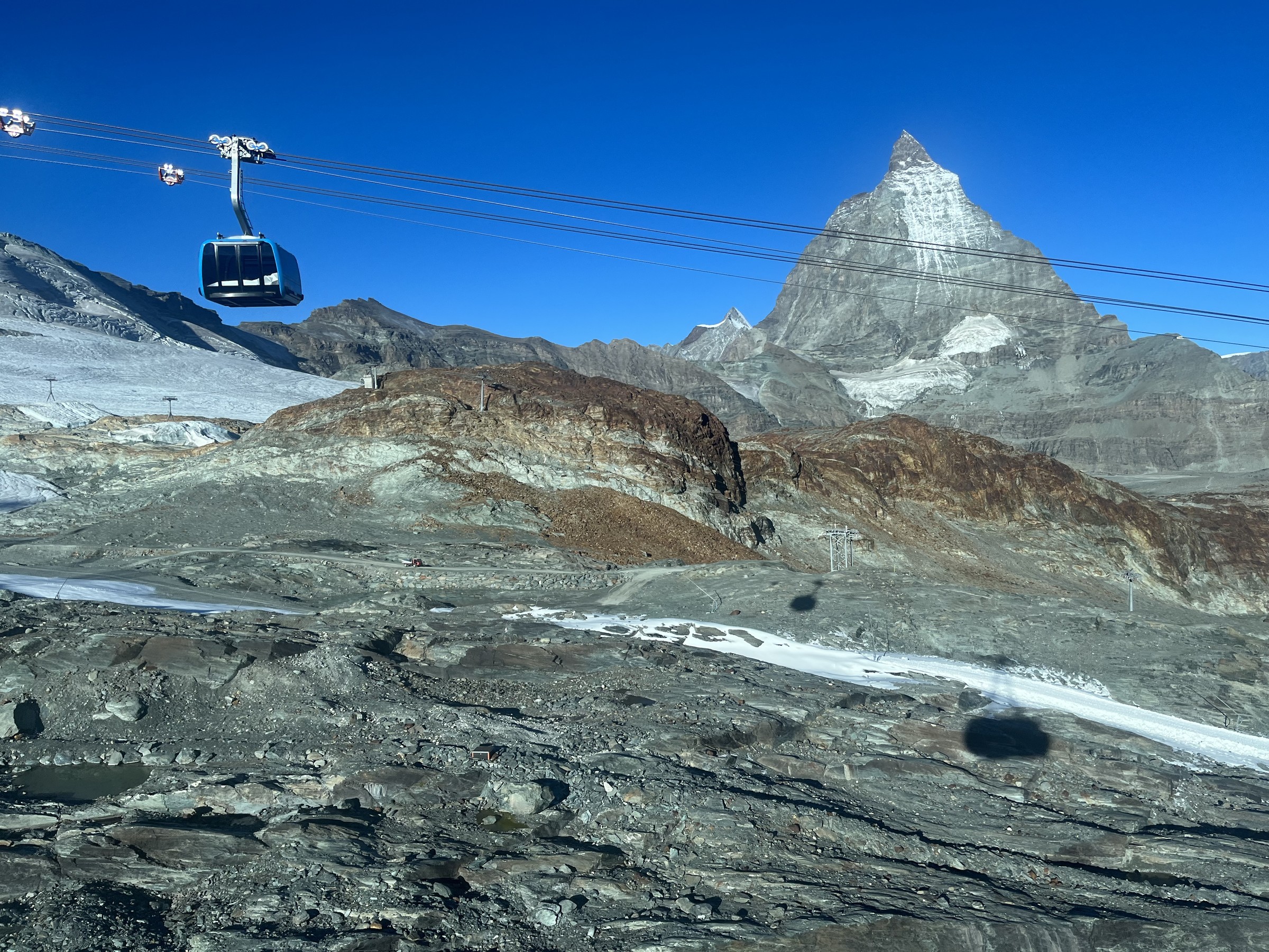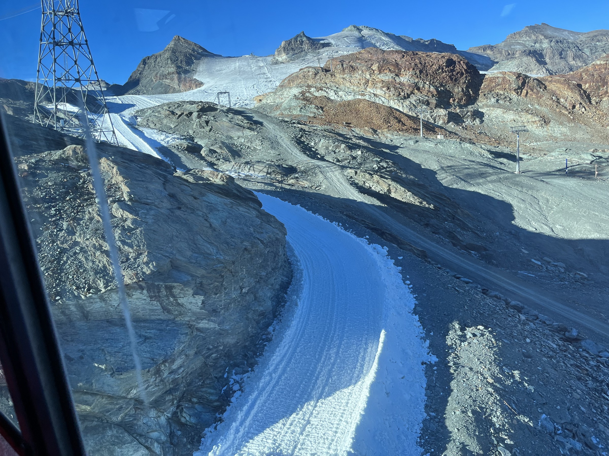 Nach meinem frühzeitigen Mittagessen haben sich die Skiteams wie erwartet verzogen. Das Skigebiet gehört fast mir alleine, inkl. der etwas gar harten Abfahrtstrainingspiste. Die letzte Fahrt: Irgendwann wir der Grat, analog zu Saas Fee eisfrei werden. Wie lange dauert das noch? Ich glaube, es ist meine erste Talfahrt mit der 3S. Auch in diese Richtung eindrücklich: