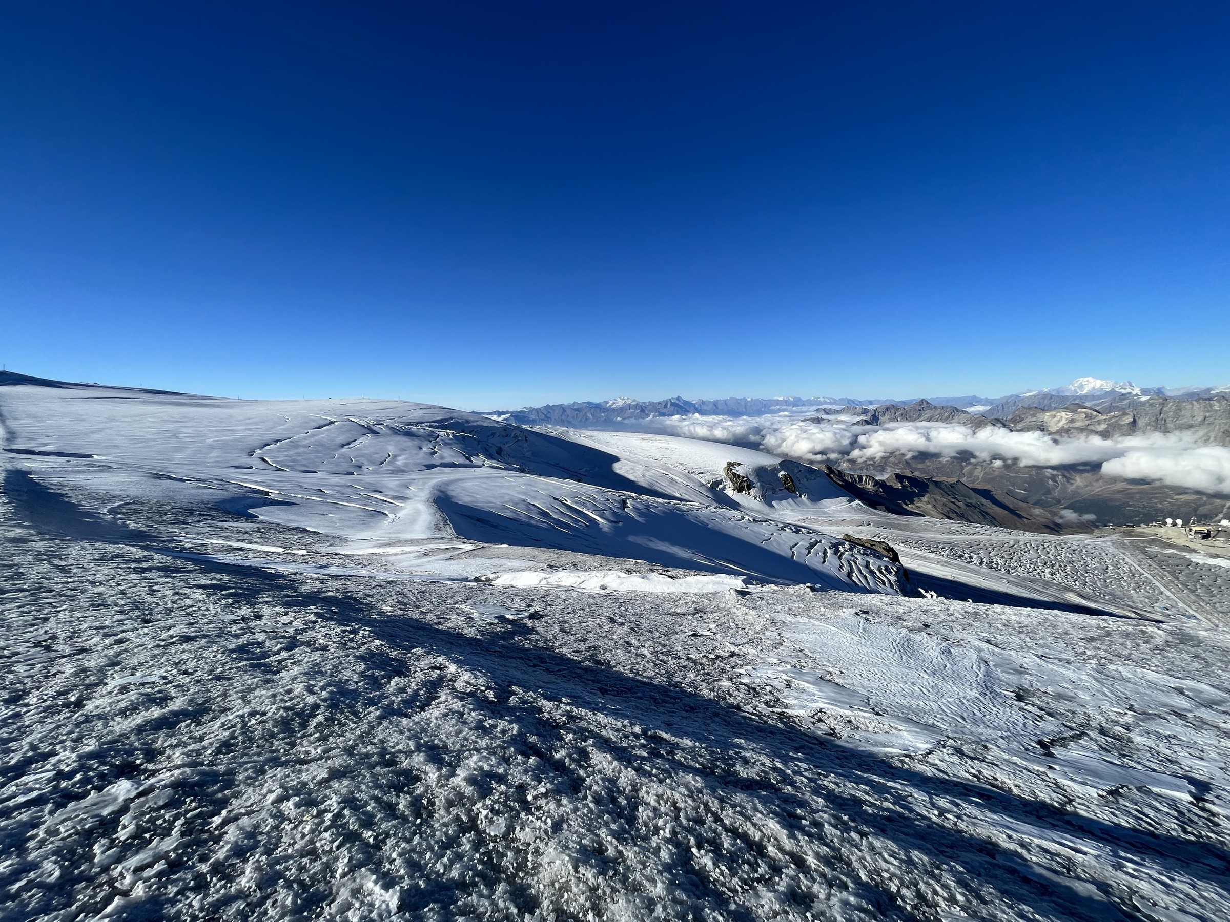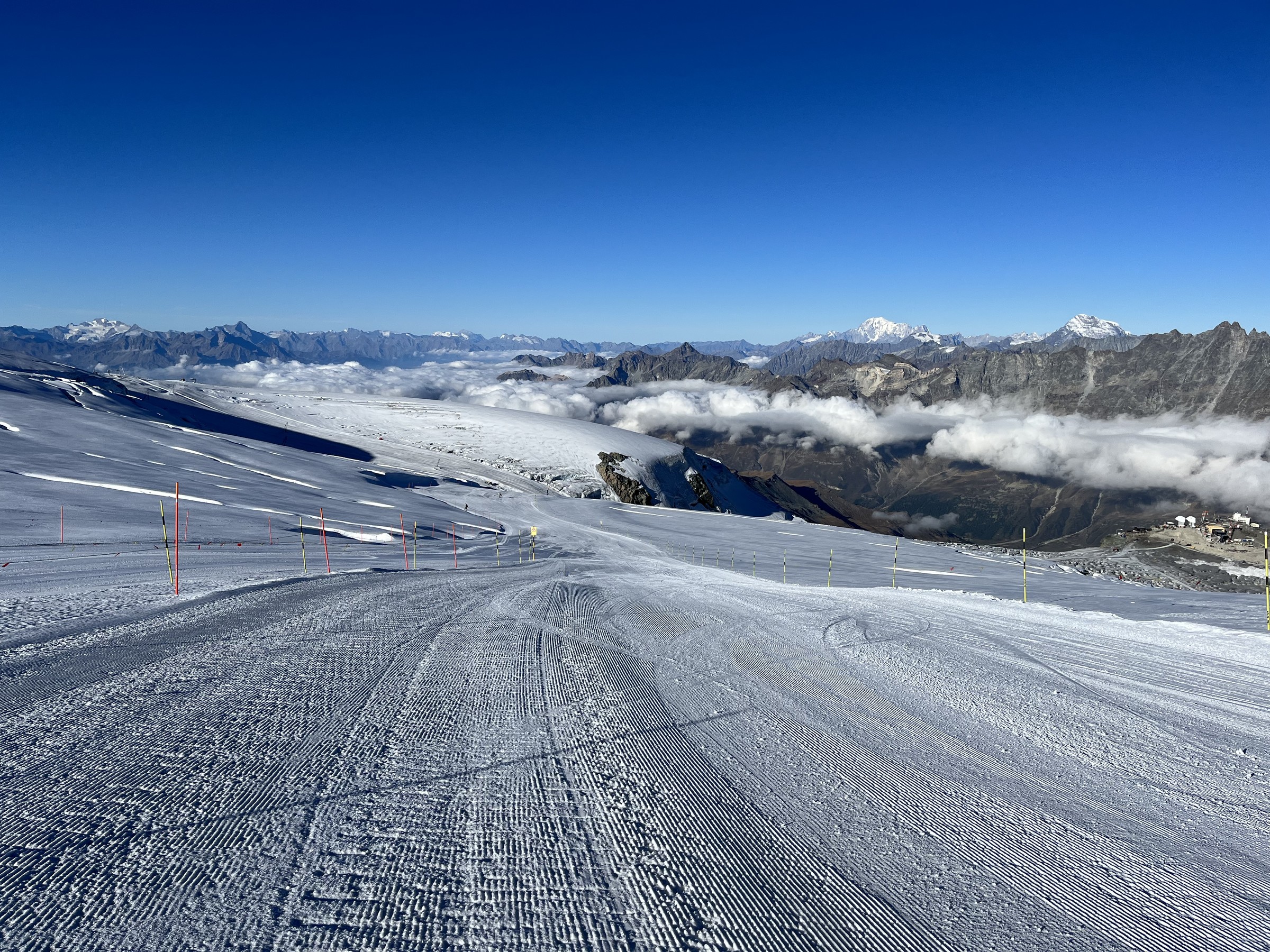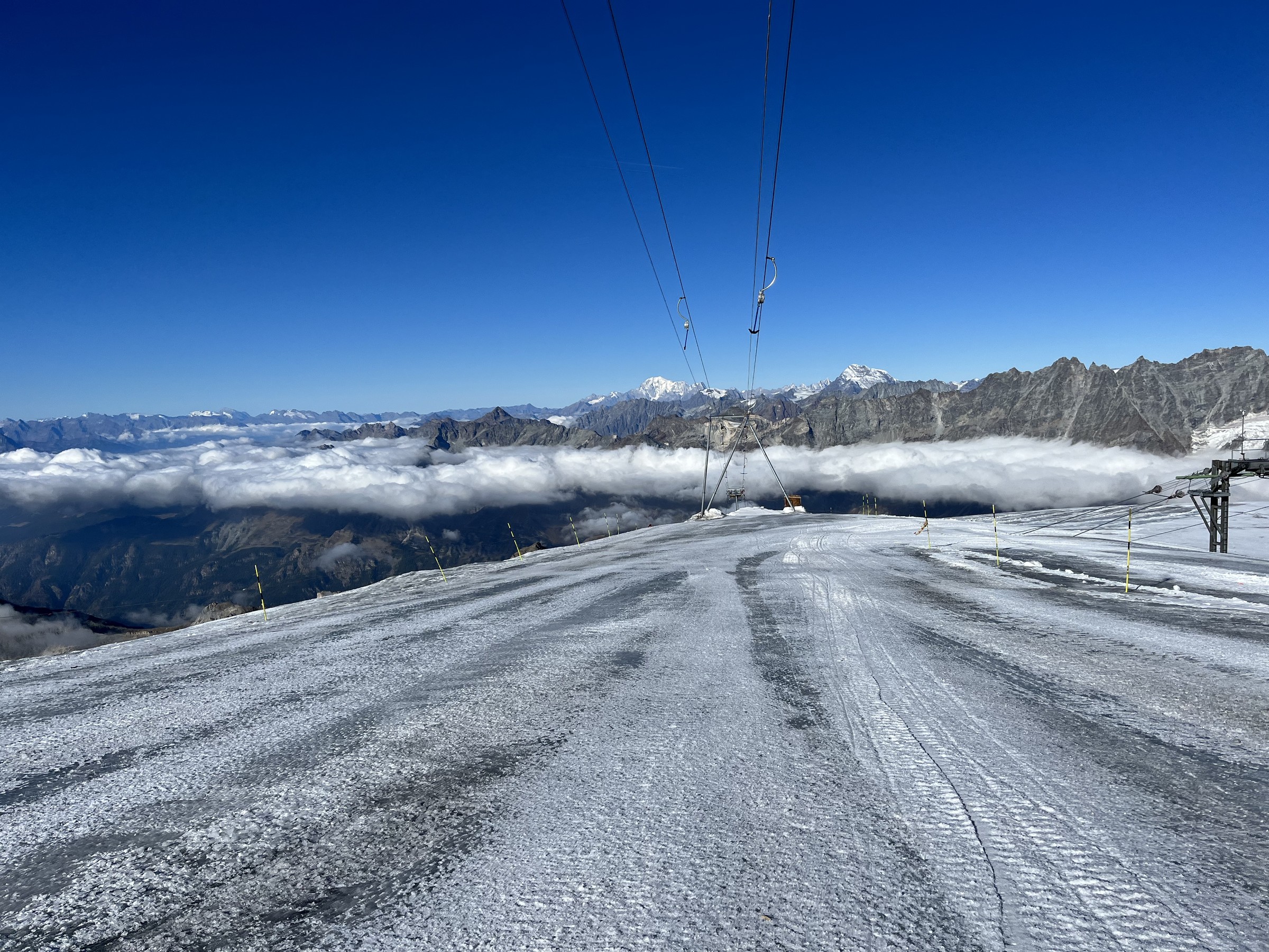 Breithorn, Liskam, Polux, Dufourspitze etc. mal von der Südseite: Walliser Käseschnitte mit Aussicht: Schon ein krasses Bild, der Gletscher am Testa: Und da soll in einem Monat ein Weltcuprennen stattfinden? Unvorstellbar!