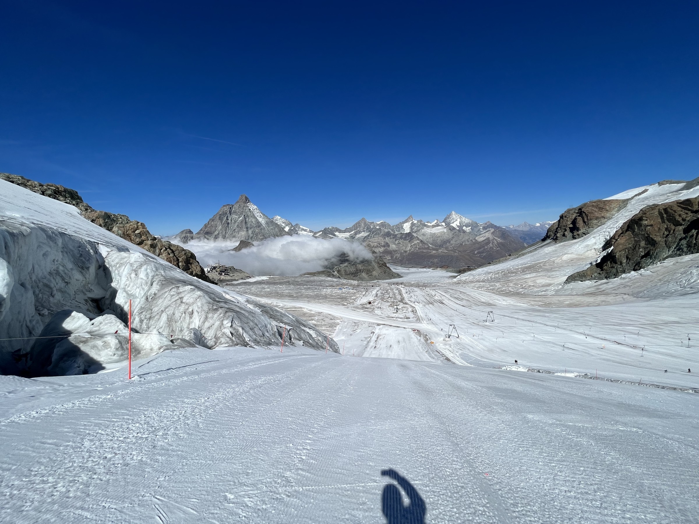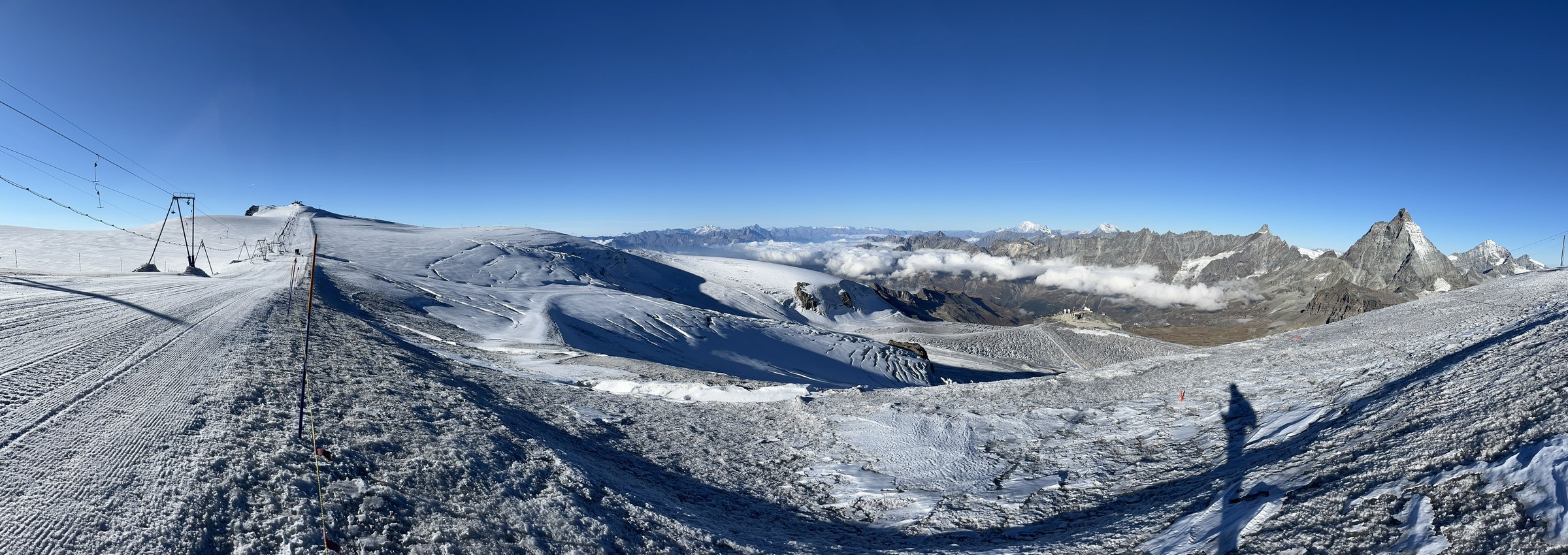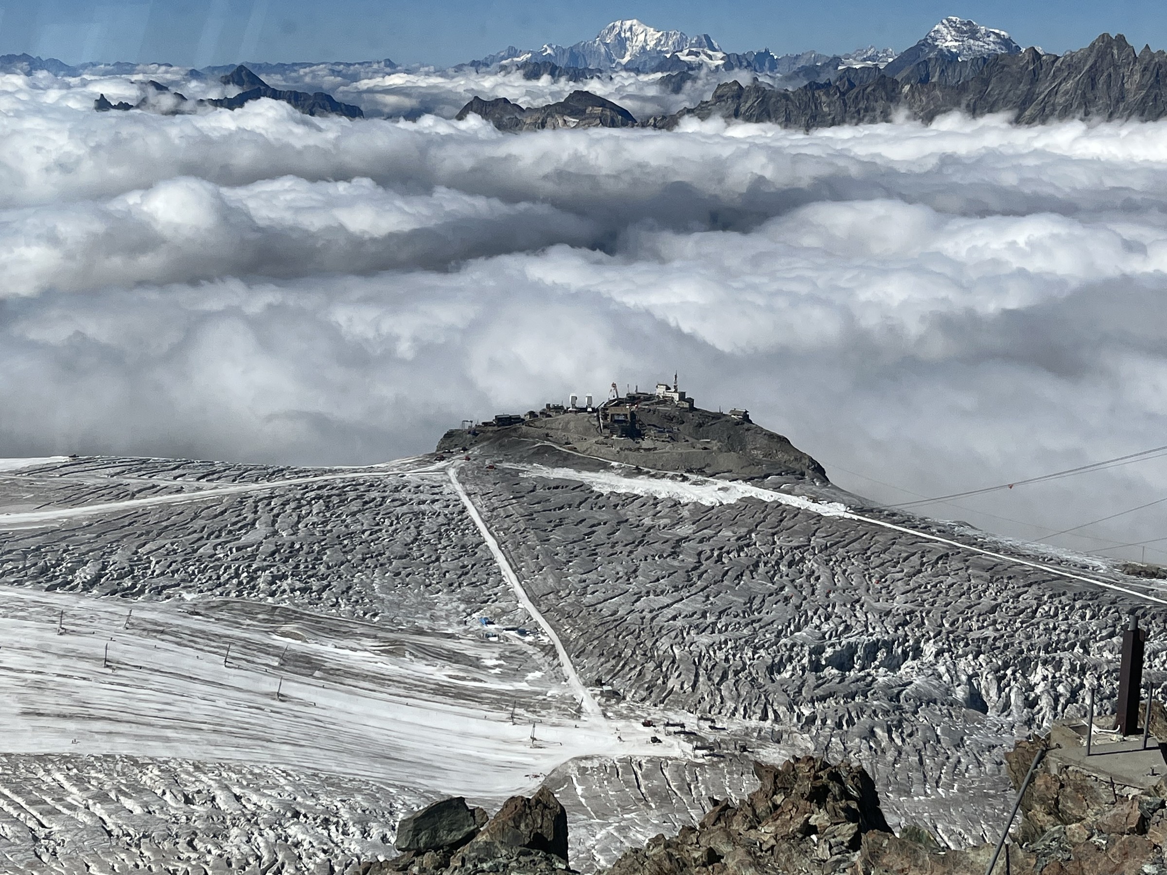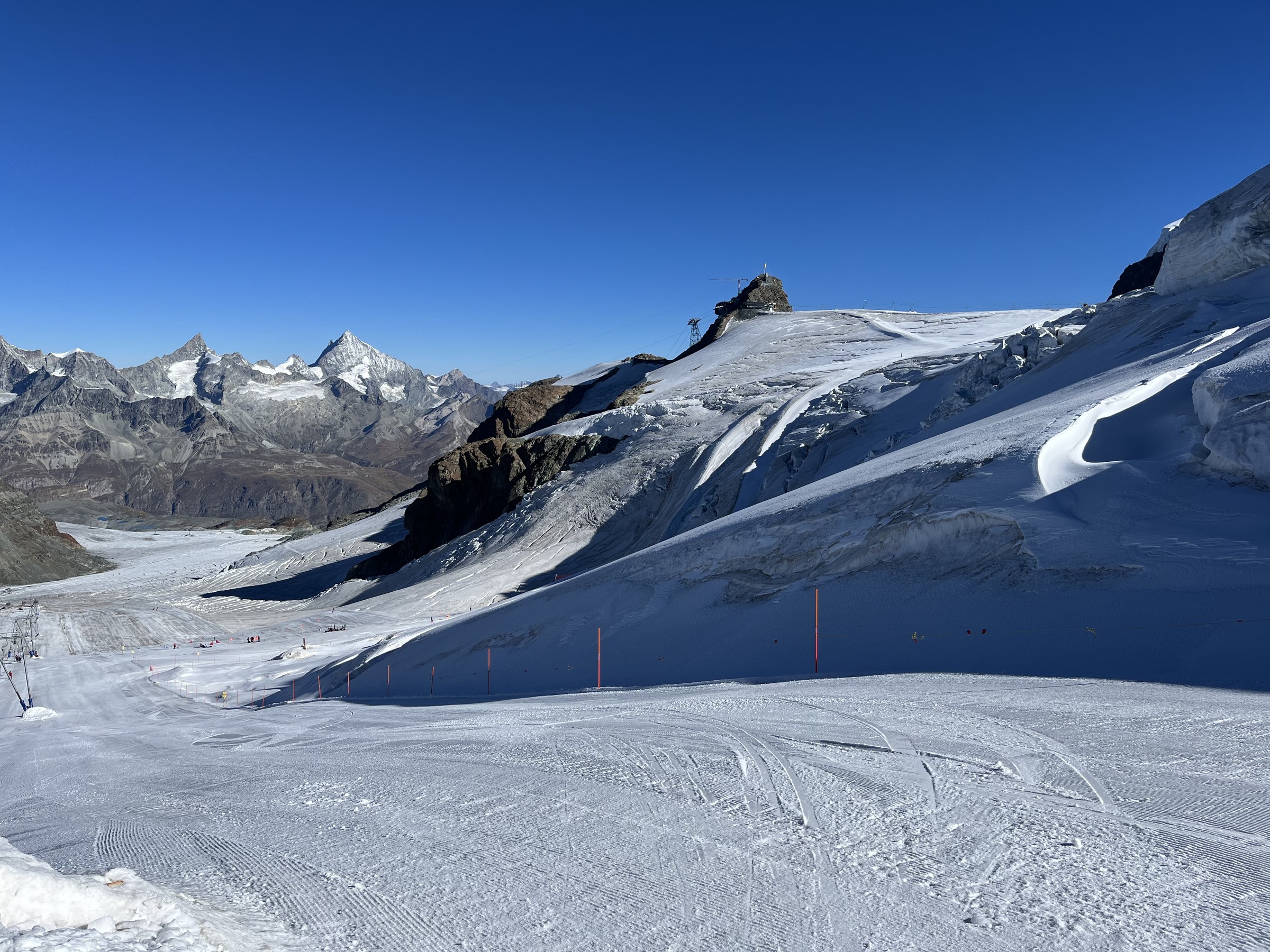 Breithorn, Liskam, Polux, Dufourspitze etc. mal von der Südseite: Walliser Käseschnitte mit Aussicht: Schon ein krasses Bild, der Gletscher am Testa: Und da soll in einem Monat ein Weltcuprennen stattfinden? Unvorstellbar!
