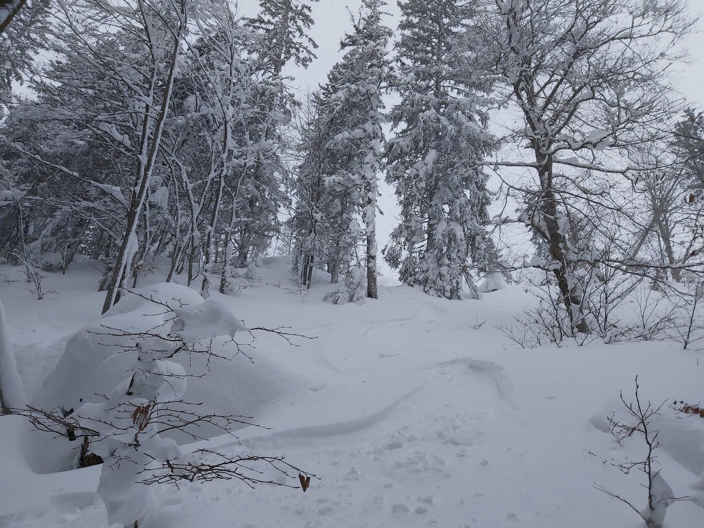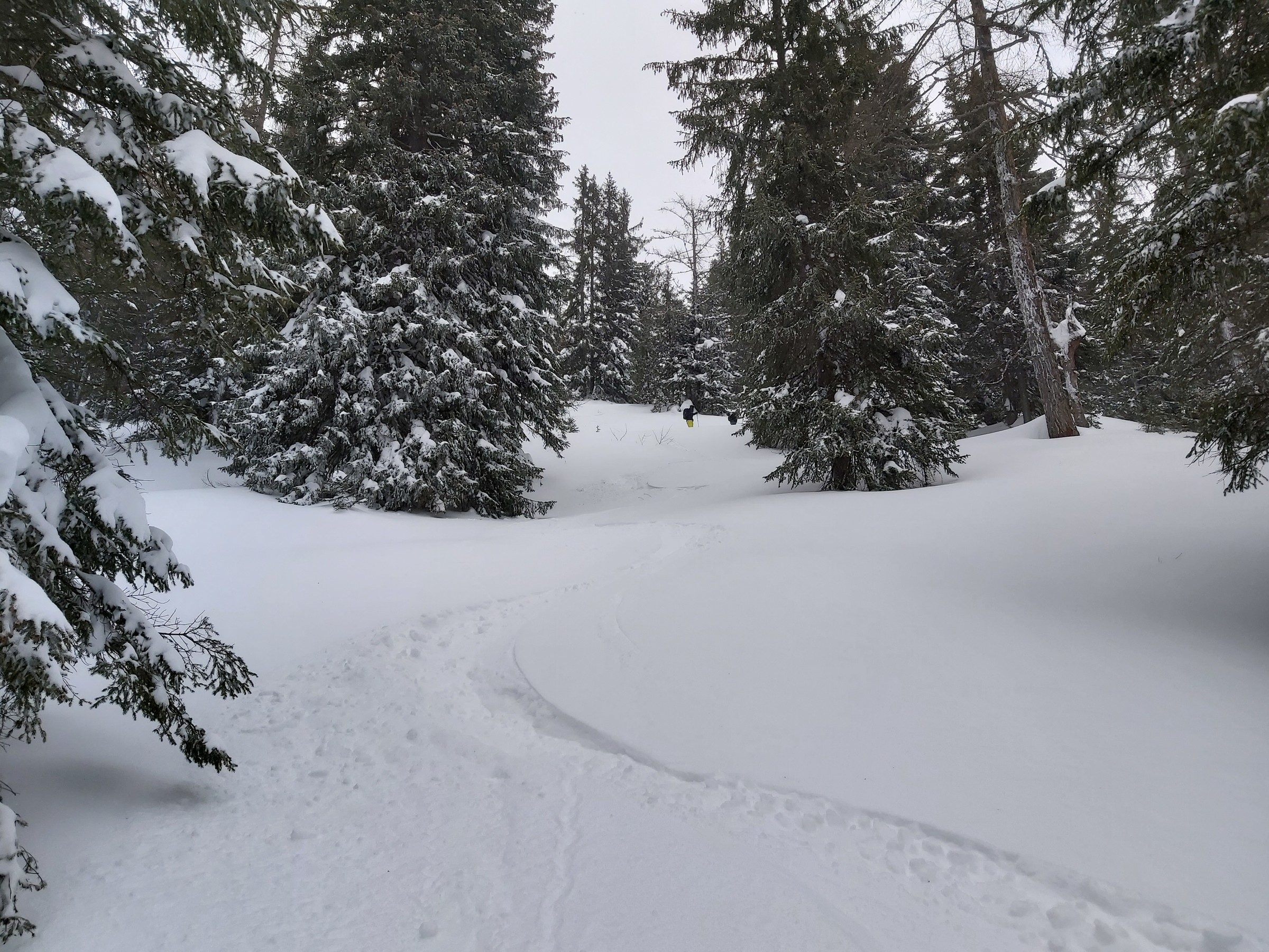 Von der Schneekonsistenz ist noch zu sagen, das es leichtester Tiefschnee wie selten war. Dieser kann sich aber noch deutlich setzen und von 50 cm Neuschnee können nach ein paar Tagen bei Temperaturen von 0 Grad sehr schnell nur noch 25 cm sein. Auf 1.600 HM machte ich noch einen Schneetest. Unter dem Neuschnee war er Feucht. Ich konnte ohne Probleme einen harten Schneeball formen. Bei Exponierten stellen wäre ich daher ohne einen Schneetest vorsichtig. Vielleicht verbinden sich diese Schichten doch gut, doch da kenne ich mich zu wenig aus.