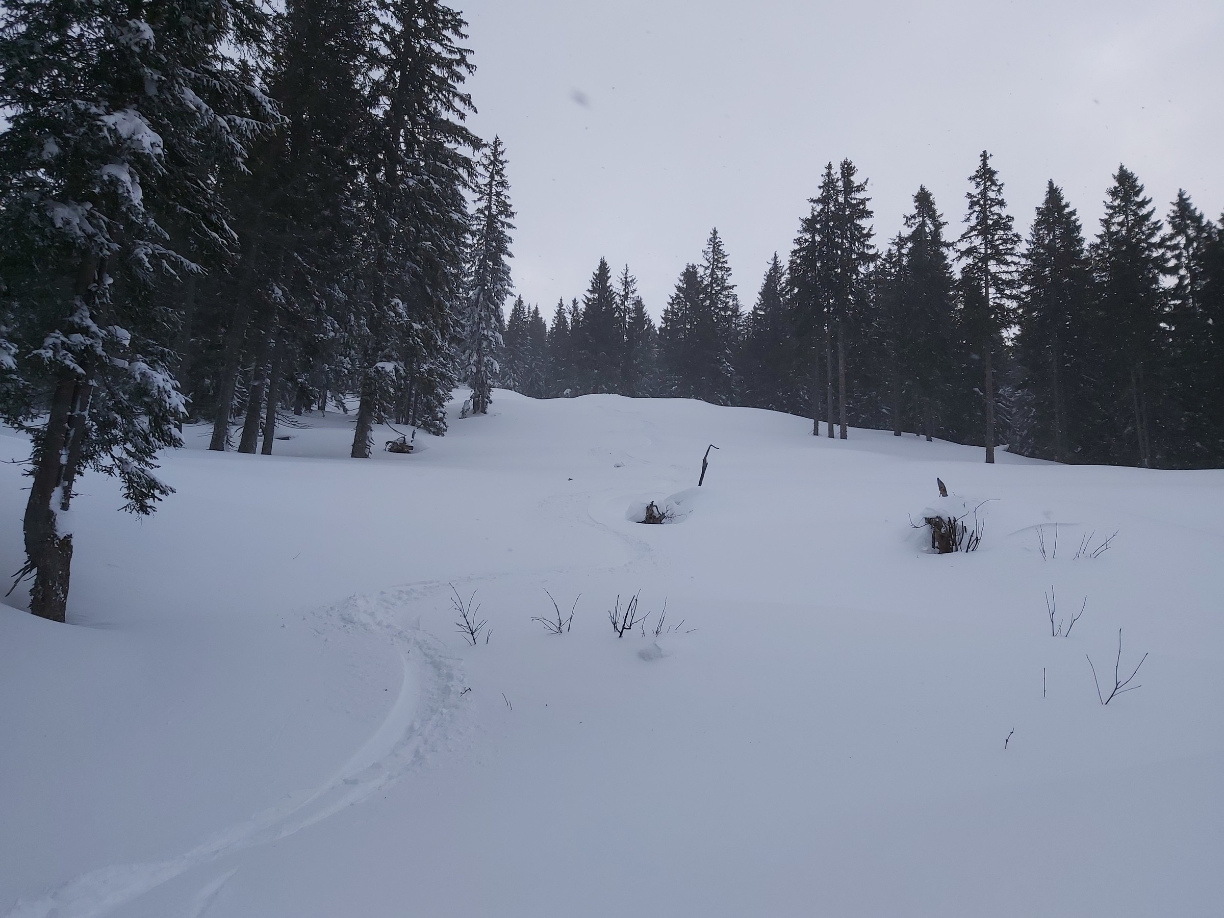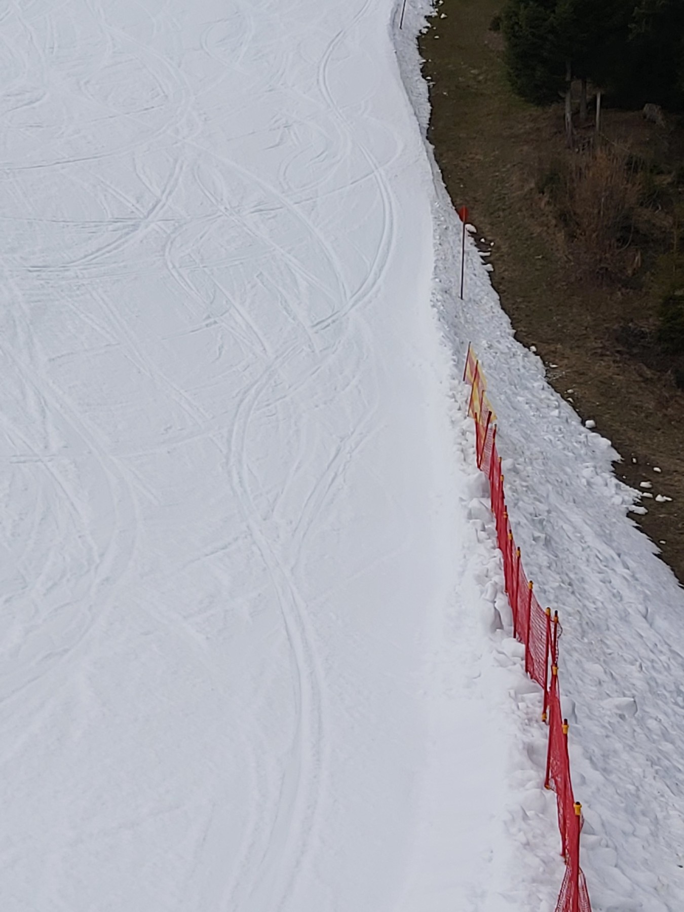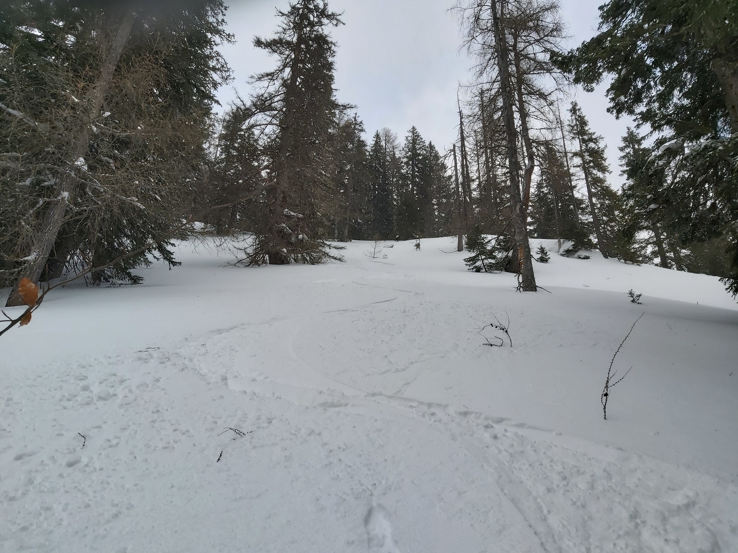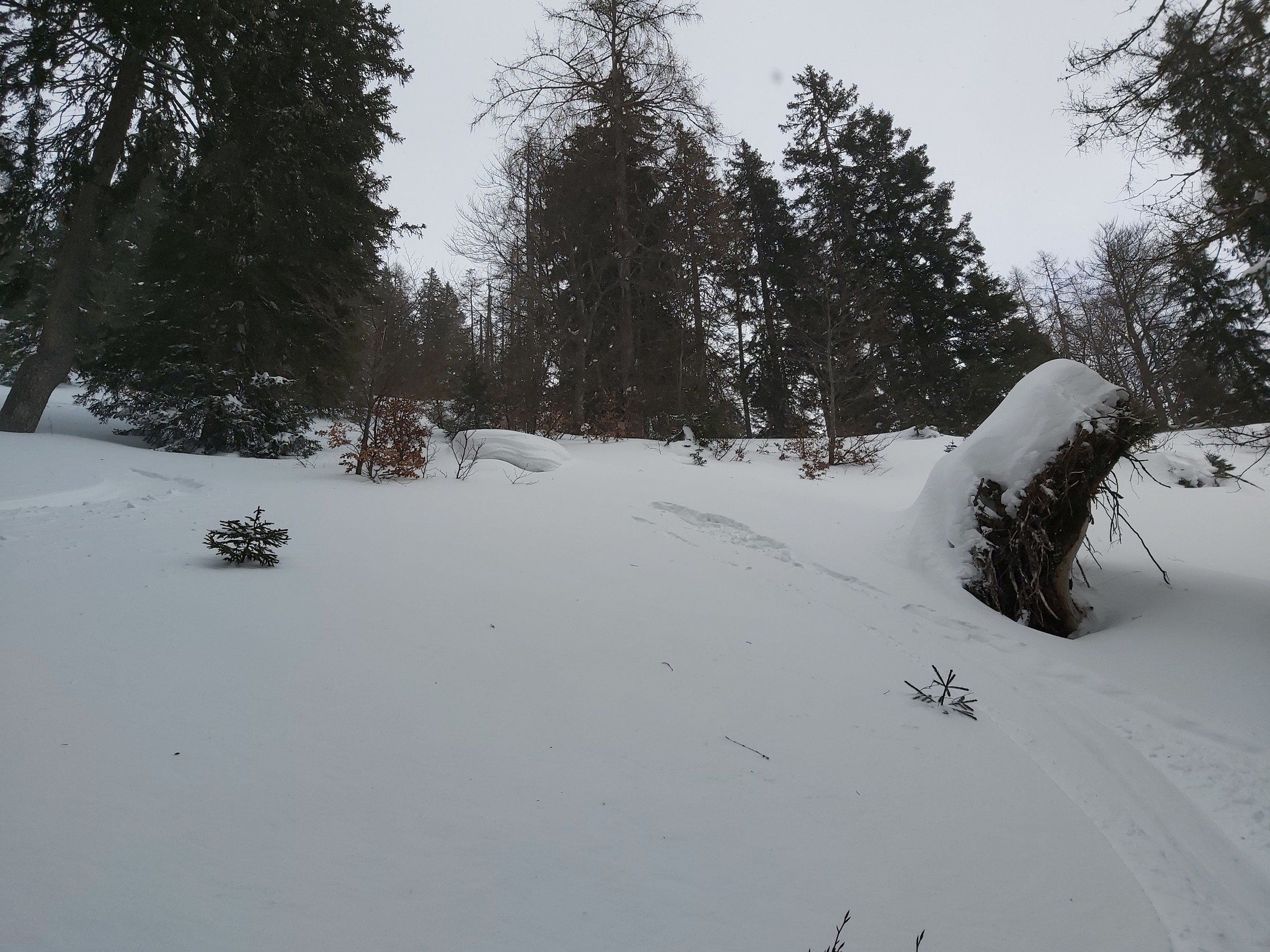 Im Wald haben die Bäume sehr viel Schnee aufgehalten. Am Boden kam dabei wenn überhaupt nur die Hälfte an. Generell würde ich hier eine Grenze von 1.300-1500 Höhenmetern veranschlagen. Darunter ist es einfach zu wenig und die Chance hängen zu bleiben oder sich die Ski zu ruinieren empfand ich als sehr hoch. Beim letzten Bild mit der Kanone auf ca. 1.400 Hm bin ich nicht reingefahren. Es war viel zu uneben und die Baumstümpfe stachen noch sehr markant heraus. Normalerweise fahre ich hier sehr gerne im Gelände, aber wie gesagt finde ich es hier noch zu riskant besonders Südseitig. Andere Hangrichtungen sind oder waren nur marginal besser. Ab ca. 1.500 HM ist es schon gut aber nichts wo man blind Fahren sollte. Die Latschen sind noch Zahlreich zu sehen. Auf der Tauplitz Abseits von 1.500 - 1.100 Hm fallen mir aber keine gescheiten Wiesenhänge ein. Da würde ich auf der Piste bleiben. Über diesen 1.500 Hm sollte es mit etwas bedacht aber schon ausreichend sein und eine Tour zu den Tragln beispielsweise gut möglich sein.