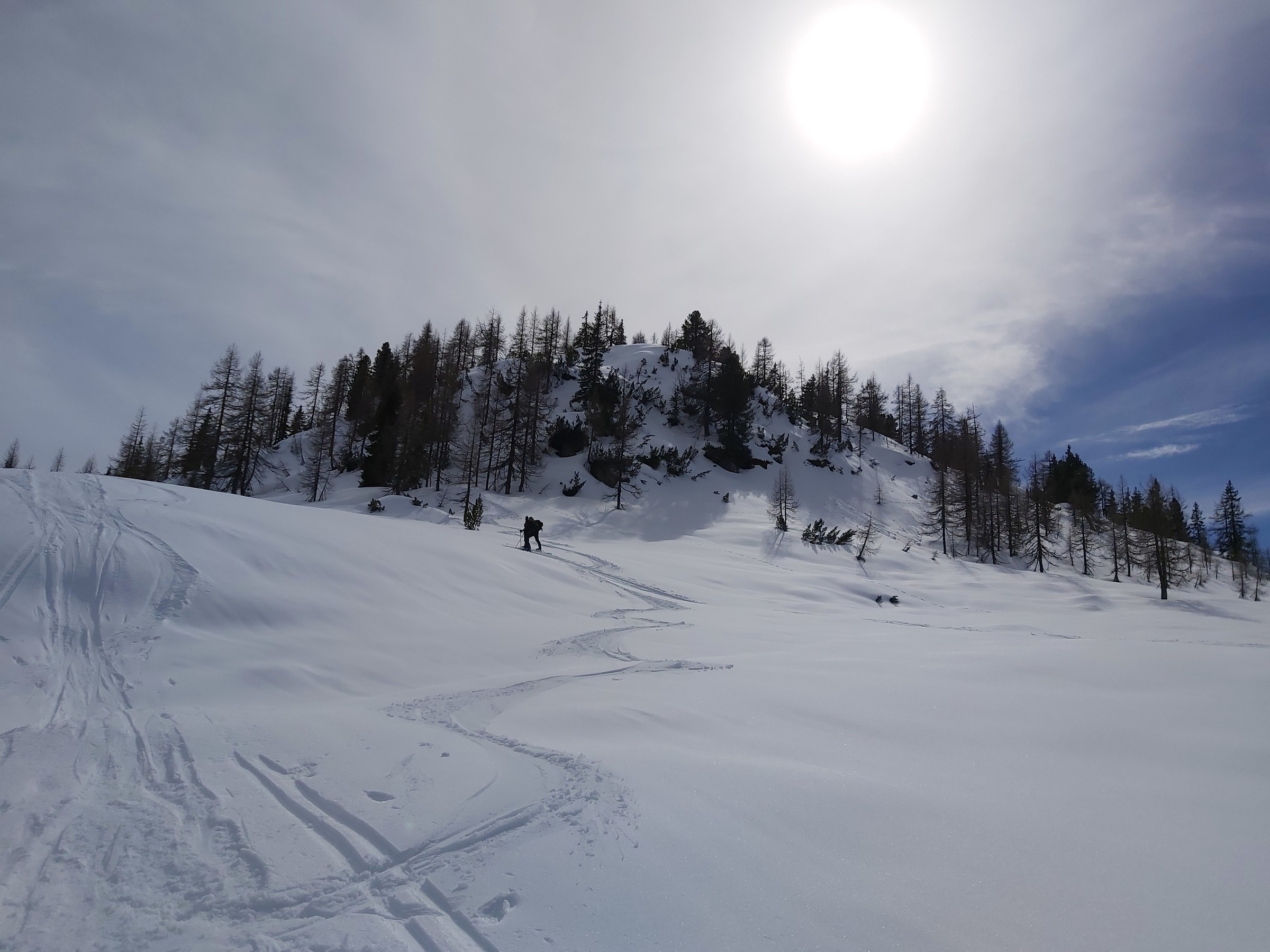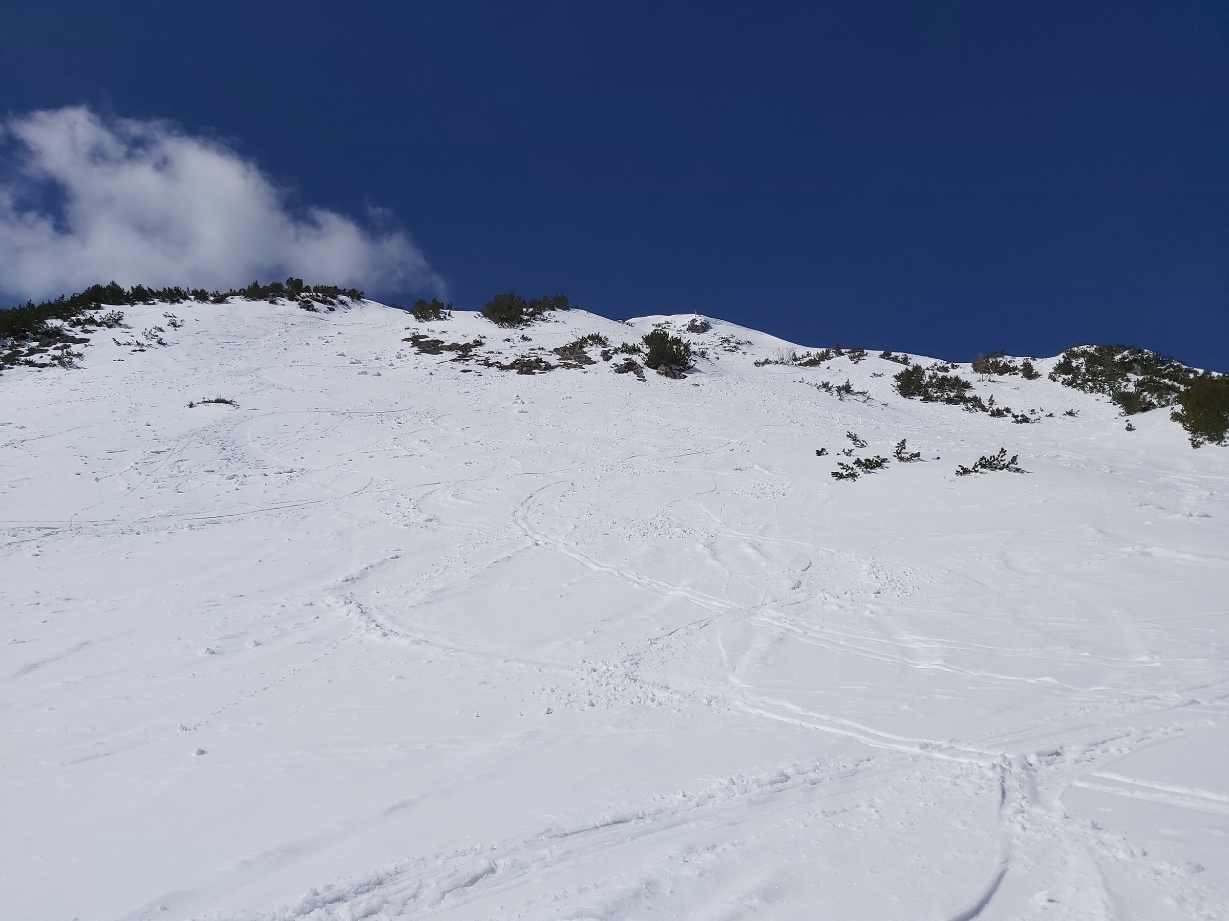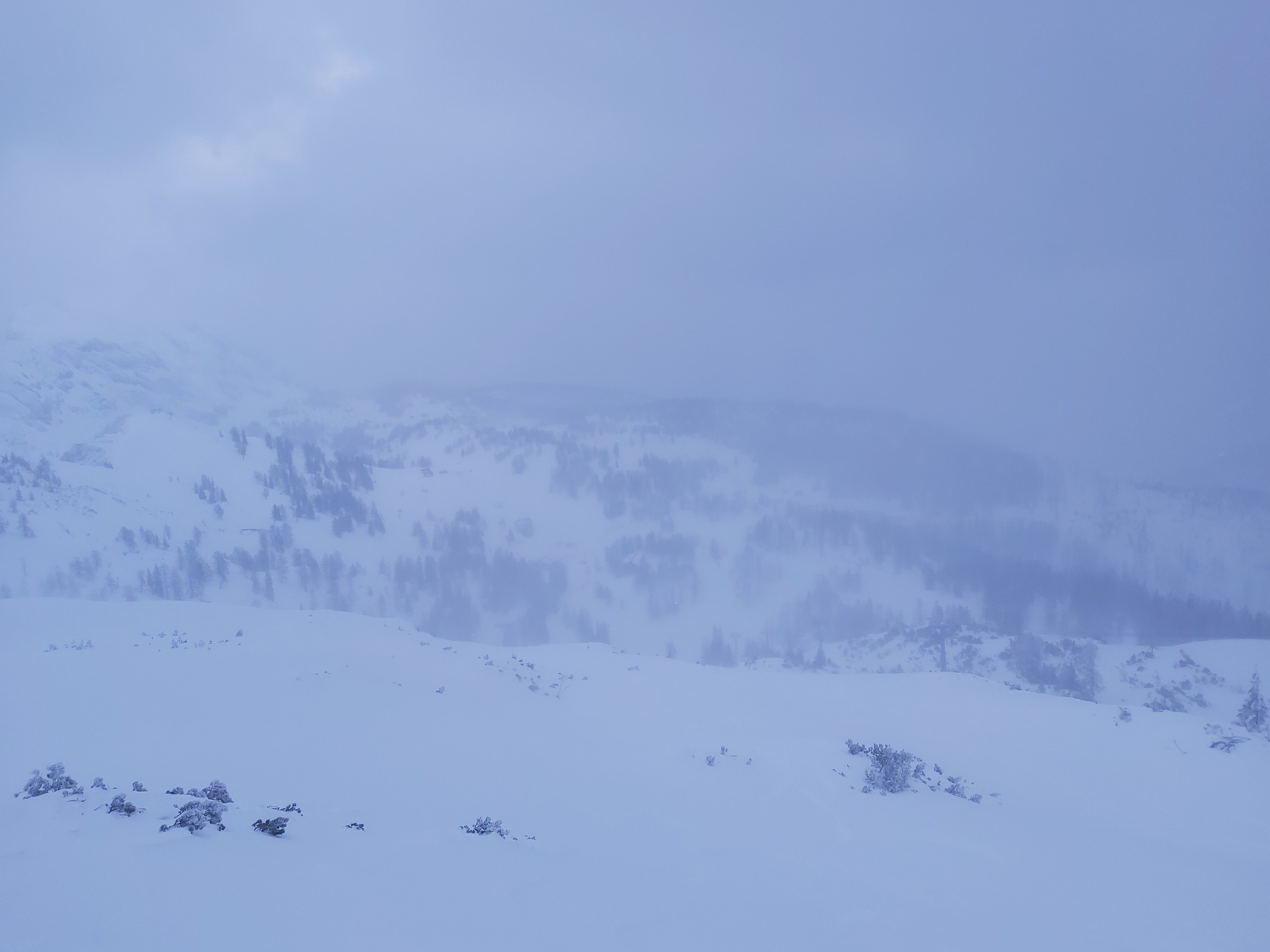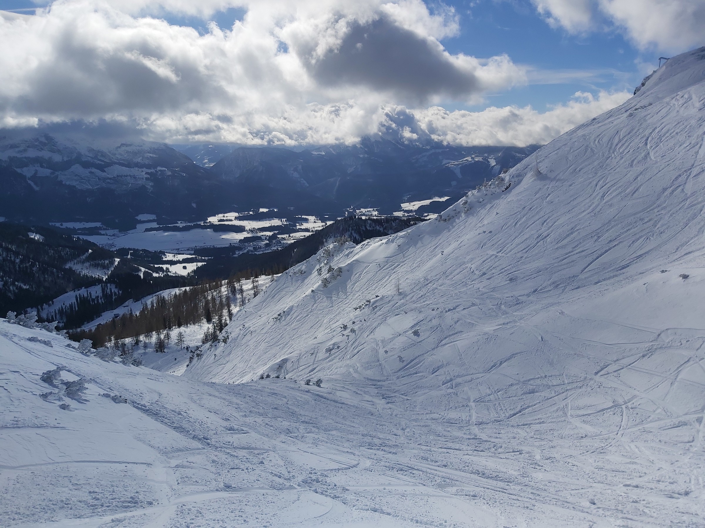 Wir waren am Sonntag nicht oben, da wir nur ca. 90 Minuten Zeit hatten und dann andere Termine. Im Wald unten eindeutig zu wenig Schnee (die kurze Waldpassage zwischen "untererer" und "oberer" Bauernwiese ging nur bergauf auf Schiern, bergab hätte man sich den Belag ruiniert). Die besagte Bauernwiese ist zwar nur kurz, hat aber oft perfekten Schnee und wird praktisch nicht befahren, deshalb sind wir nur bis dorthin gegangen und den Hang ein paar mal gefahren. Alternative für den Sonntag Vormittag wäre Tiefschneefahren oben am Loser gewesen, aber erstens ist das an solchen Tagen wegen der Konkurrenz ziemlich stressig (wobei wir ohnehin mit Fellen im Bereich der hinteren noch nicht in Betrieb gewesenen Schlepper unterwegs gewesen wären), und zweitens (das war der eigentliche Grund) hat es oben nicht aufgerissen, wir wären daher nur im Nebel unterwegs gewesen. Für solche Fälle gehen wir fast jedes Jahr wenigstens einmal auf unsere "Privatwiese".