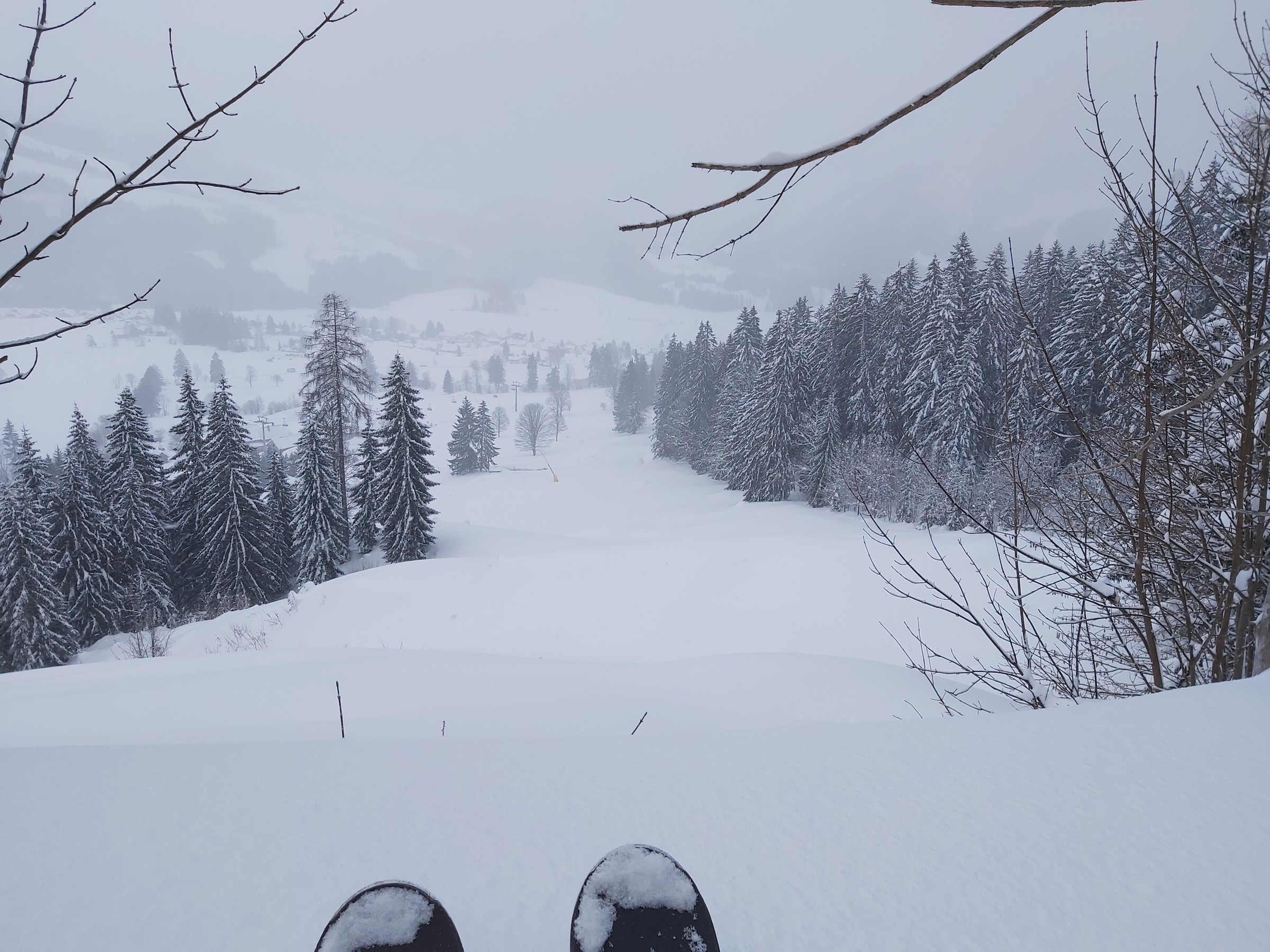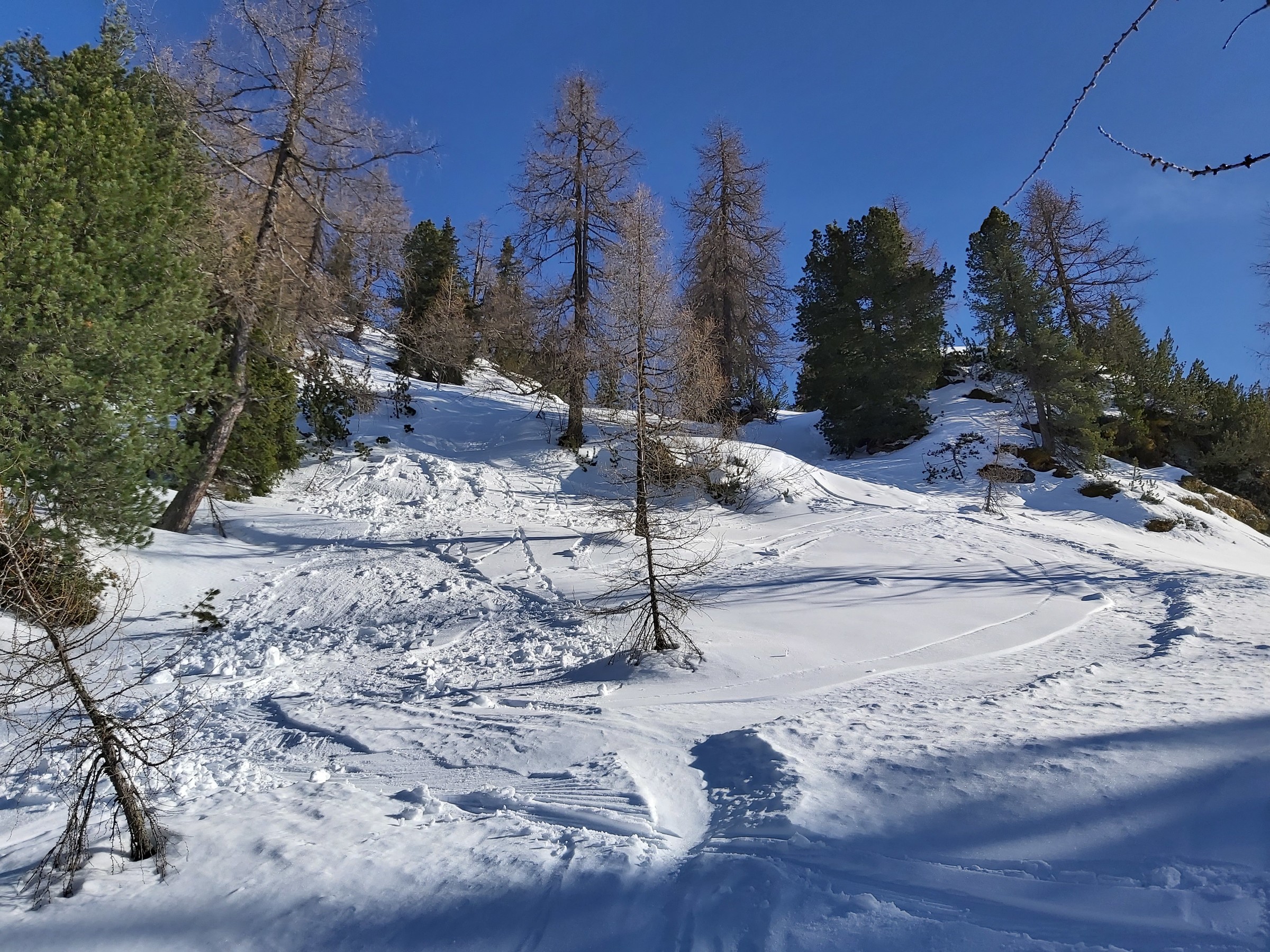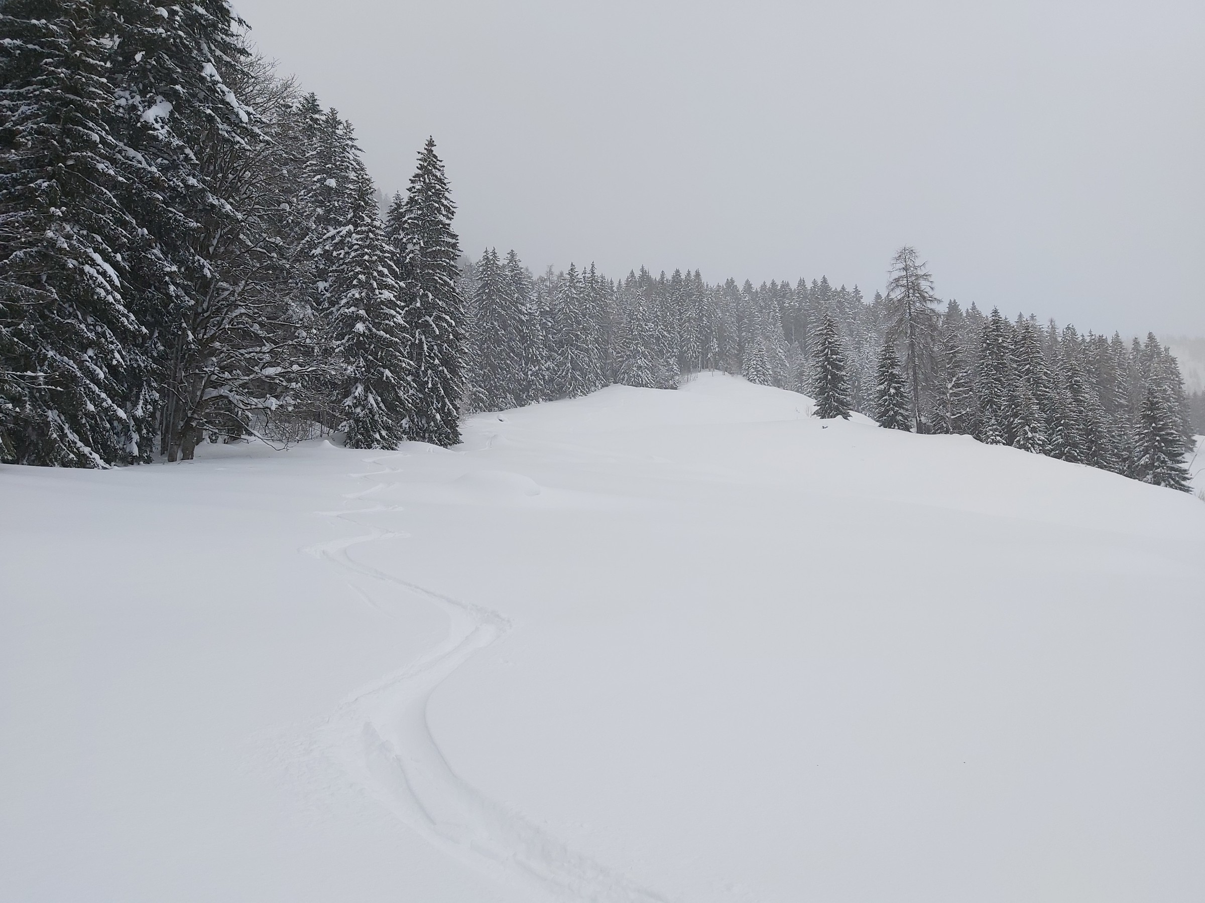 Wir waren am Sonntag nicht oben, da wir nur ca. 90 Minuten Zeit hatten und dann andere Termine. Im Wald unten eindeutig zu wenig Schnee (die kurze Waldpassage zwischen "untererer" und "oberer" Bauernwiese ging nur bergauf auf Schiern, bergab hätte man sich den Belag ruiniert). Die besagte Bauernwiese ist zwar nur kurz, hat aber oft perfekten Schnee und wird praktisch nicht befahren, deshalb sind wir nur bis dorthin gegangen und den Hang ein paar mal gefahren. Alternative für den Sonntag Vormittag wäre Tiefschneefahren oben am Loser gewesen, aber erstens ist das an solchen Tagen wegen der Konkurrenz ziemlich stressig (wobei wir ohnehin mit Fellen im Bereich der hinteren noch nicht in Betrieb gewesenen Schlepper unterwegs gewesen wären), und zweitens (das war der eigentliche Grund) hat es oben nicht aufgerissen, wir wären daher nur im Nebel unterwegs gewesen. Für solche Fälle gehen wir fast jedes Jahr wenigstens einmal auf unsere "Privatwiese".
