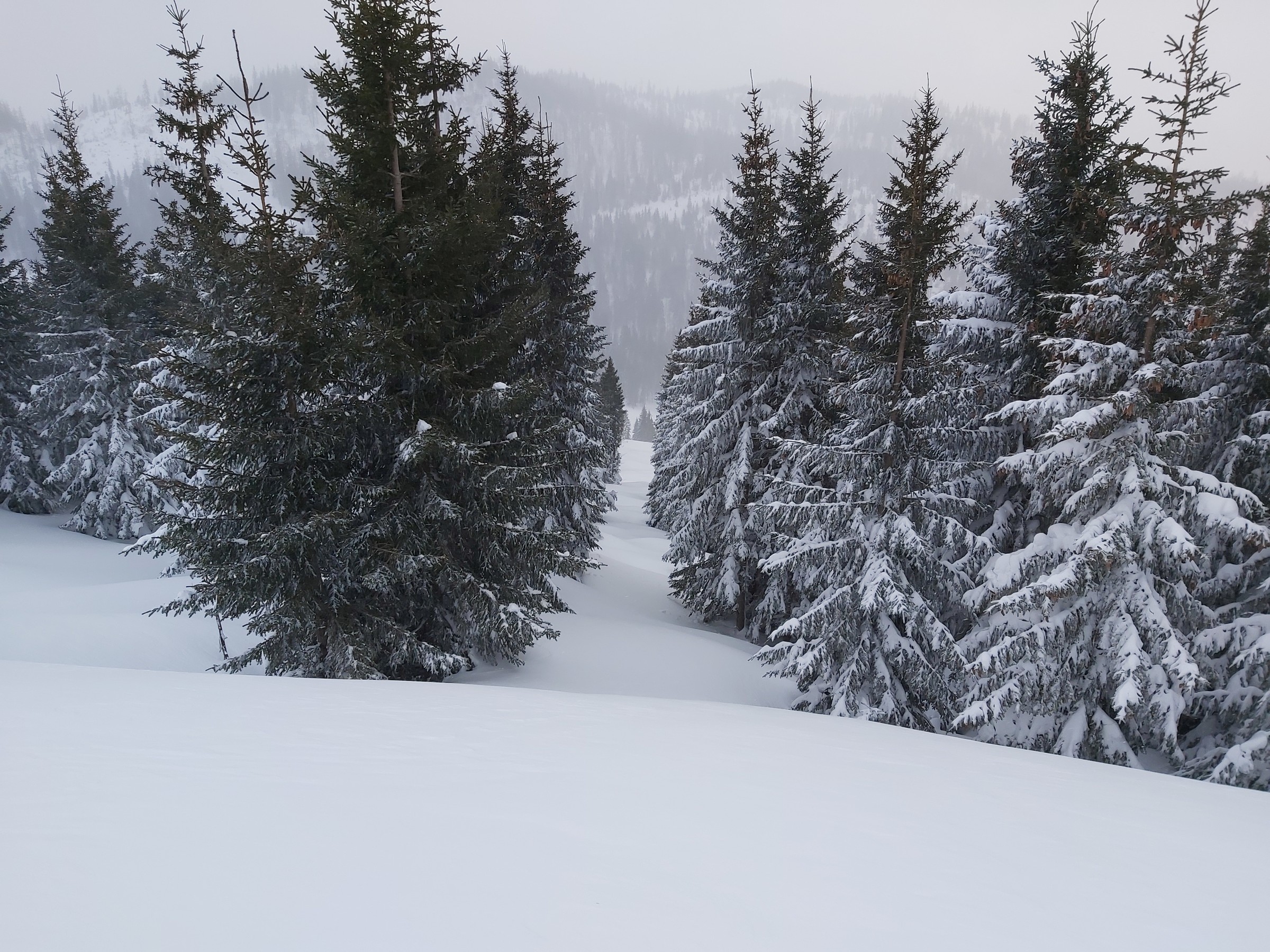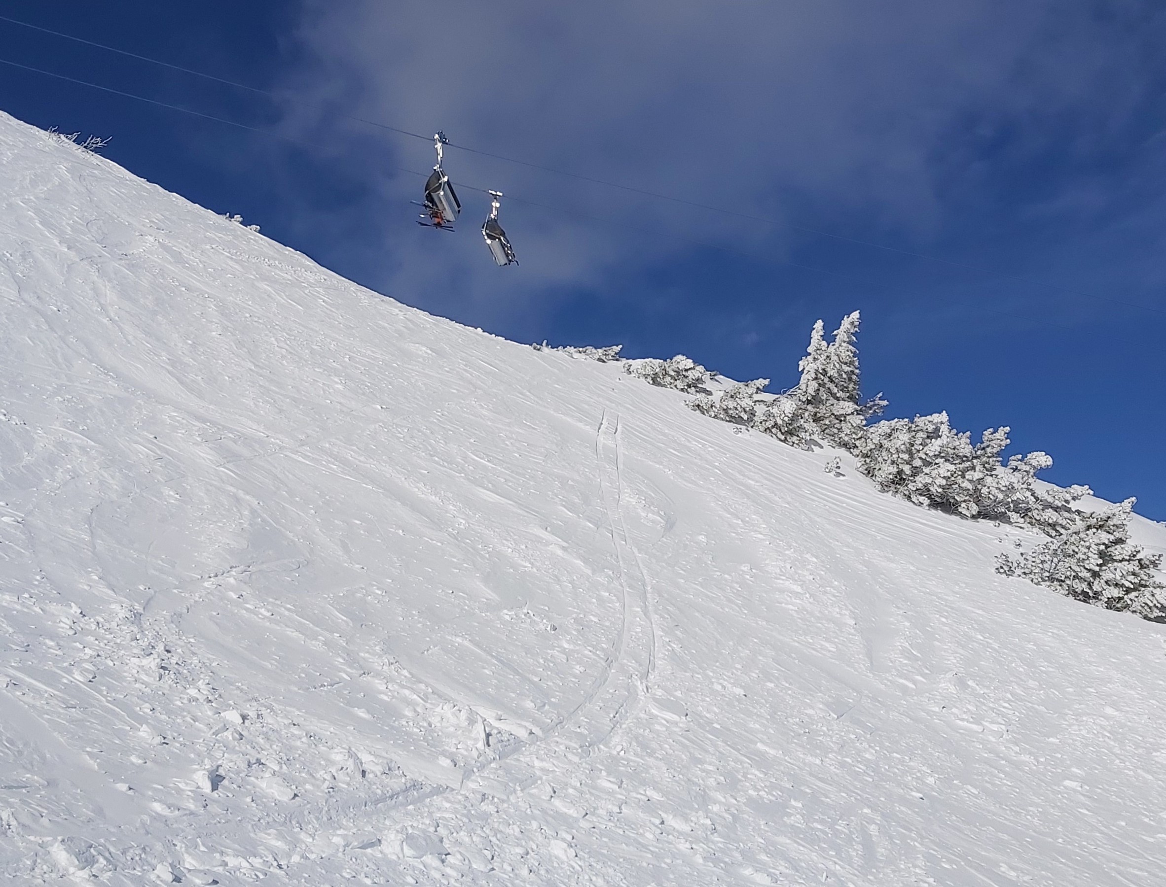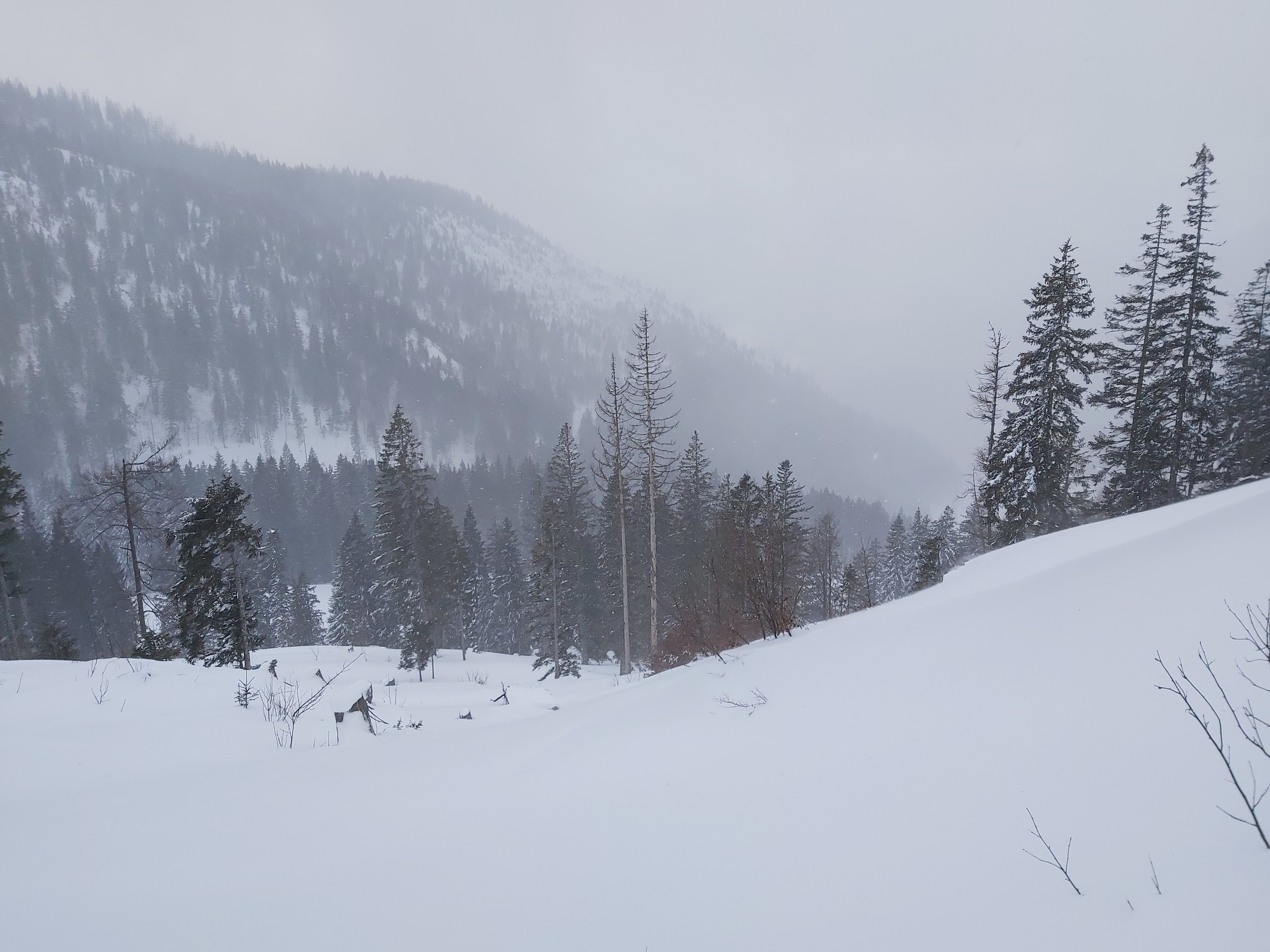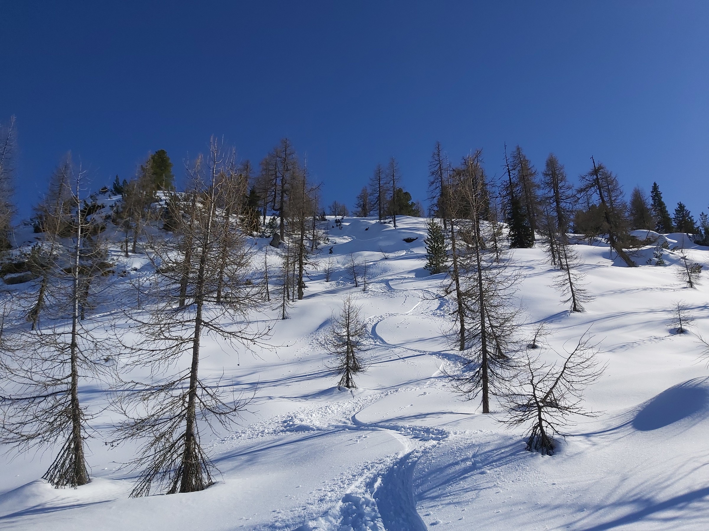Wir waren am Sonntag nicht oben, da wir nur ca. 90 Minuten Zeit hatten und dann andere Termine. Im Wald unten eindeutig zu wenig Schnee (die kurze Waldpassage zwischen "untererer" und "oberer" Bauernwiese ging nur bergauf auf Schiern, bergab hätte man sich den Belag ruiniert). Die besagte Bauernwiese ist zwar nur kurz, hat aber oft perfekten Schnee und wird praktisch nicht befahren, deshalb sind wir nur bis dorthin gegangen und den Hang ein paar mal gefahren. Alternative für den Sonntag Vormittag wäre Tiefschneefahren oben am Loser gewesen, aber erstens ist das an solchen Tagen wegen der Konkurrenz ziemlich stressig (wobei wir ohnehin mit Fellen im Bereich der hinteren noch nicht in Betrieb gewesenen Schlepper unterwegs gewesen wären), und zweitens (das war der eigentliche Grund) hat es oben nicht aufgerissen, wir wären daher nur im Nebel unterwegs gewesen. Für solche Fälle gehen wir fast jedes Jahr wenigstens einmal auf unsere "Privatwiese".