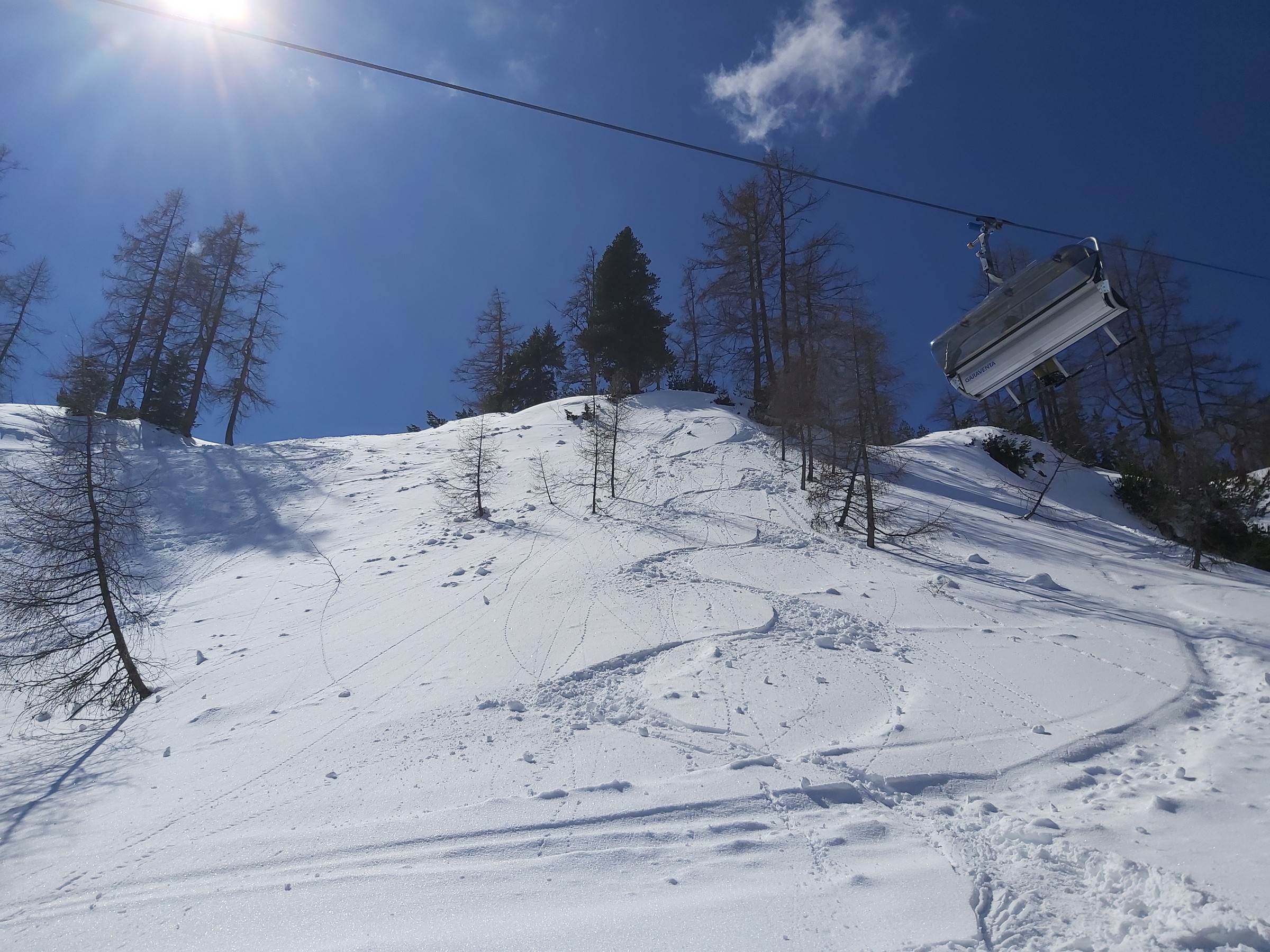 Ein langer Tag wurde es doch nicht und so wurde was neues Besucht. Ein Gebiet welches ich noch nicht kenne. So wurde es der Fanningberg. Das Gebiet besteht aus zwei Sesseln und einem Schlepplift. Hört sich zwar nicht nach viel an, dennoch kann man es hier mit einer ausgedehnten Mittagsjause gut aushalten wie ich finde. Die Pisten sind meisten recht schön angelegt, jedoch gibt es relativ viel Flachstücke vor oder nach einer Piste. Nur am Moserkopflift gibt es eine eher mittellange rote Piste mit halbwegs gutem Gefälle über die ganze Länge, die auch dazu noch sehr schön kupiert mit netten Übergängen befahren wird. Zum Freeriden sieht es am Zirbenjet am besten aus, doch das ließ ich heute aus denn dazu wäre schon ein ganzer Tag notwendig. Es war ganz ok mit etwas Andrang und vielleicht einmal 3 Minuten Wartezeit an der Hauptbahn, am Samson. Die erste Fahrt war gegen 11 Uhr mit noch guten Pisten. Diese wurden nur marginal schlechter und mit etwas Vorsicht konnte man immer noch gut Carven bis zu Betriebsschluss. Wetter Traumhaft mit vielleicht etwas Wind. Eine LSAP Ruine gibt es auch noch.