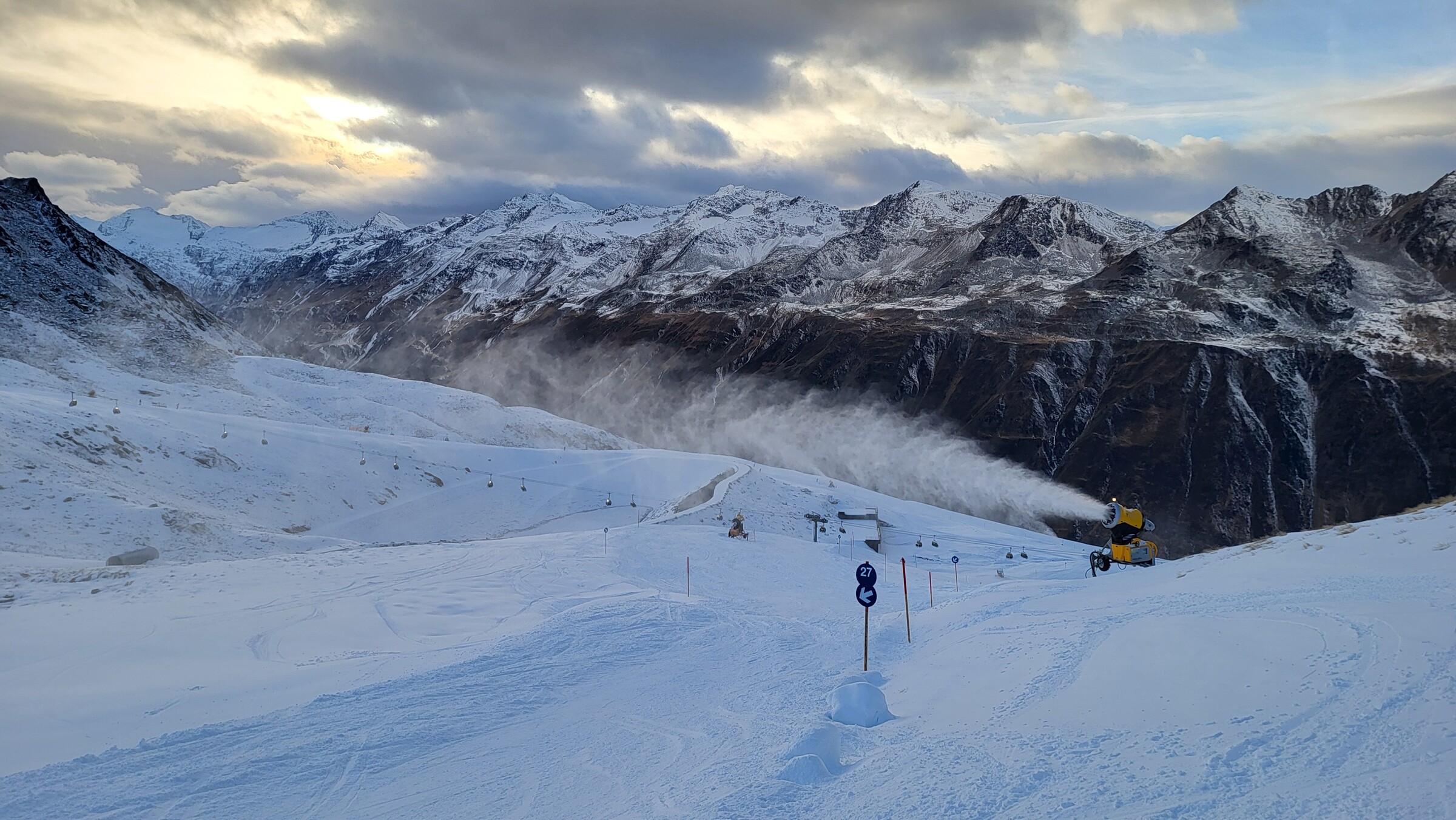 Schneekanonen liefen in den mittleren Höhenlagen den ganzen Tag, bei den niedrigeren Kanonen kam allerdings ziemlich feuchter Schnee heraus.