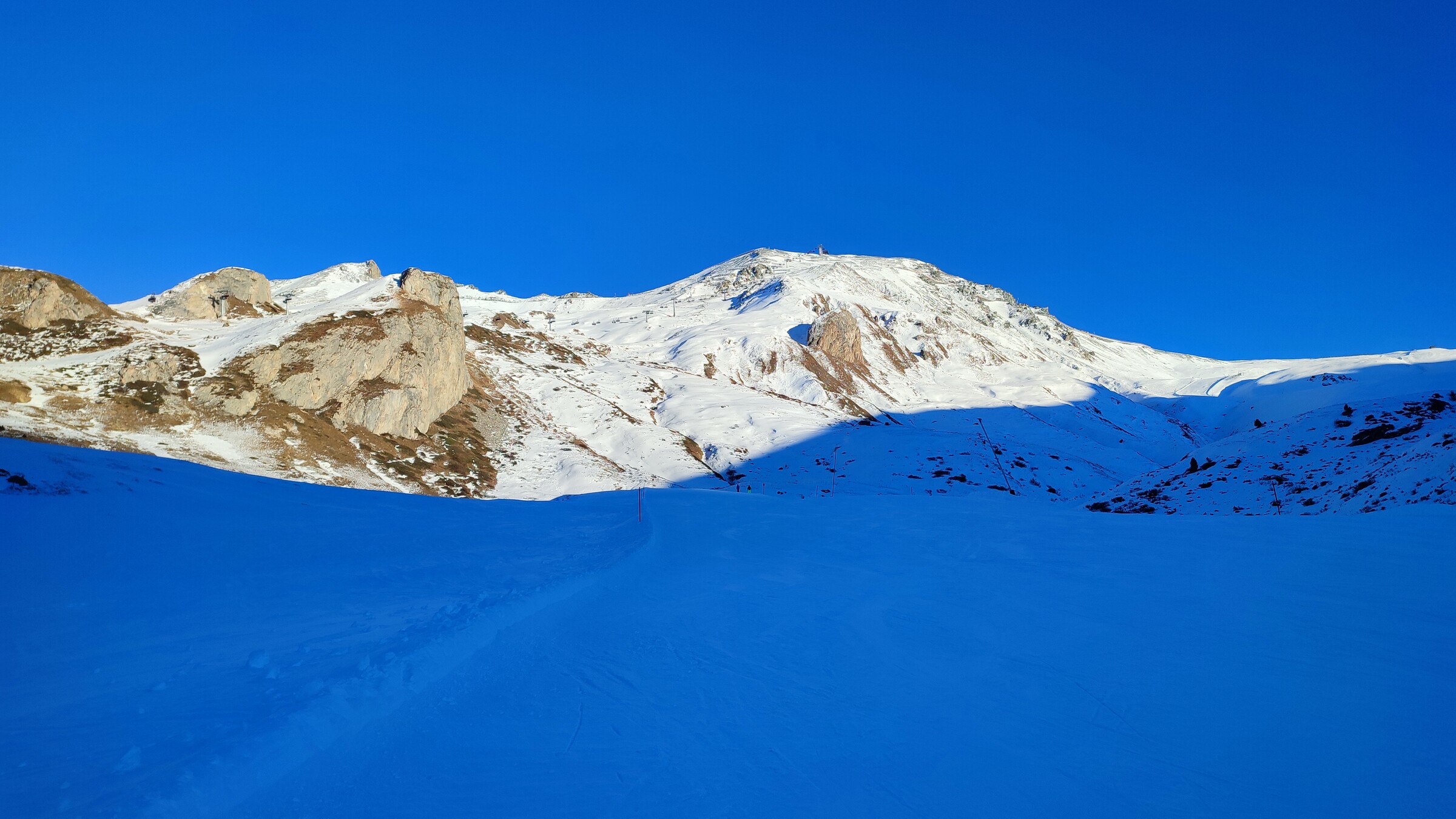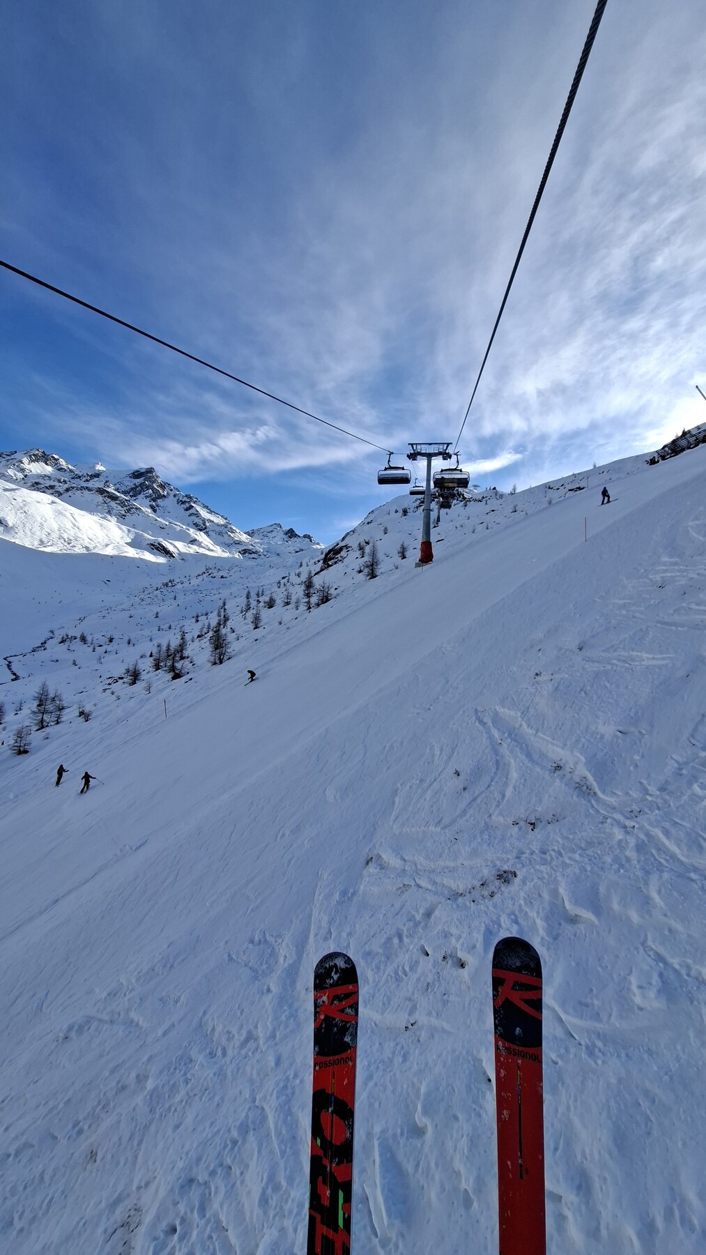 Bedingungen heute wie gestern. Habe mir heute einen High End Ski mit schmaler Mittelbreite und ordentlich Kanten ausgeliehen. Da sind Eisplatten und Co zwar nicht verschwunden, aber irrelevant. Bombastische Bedingungen