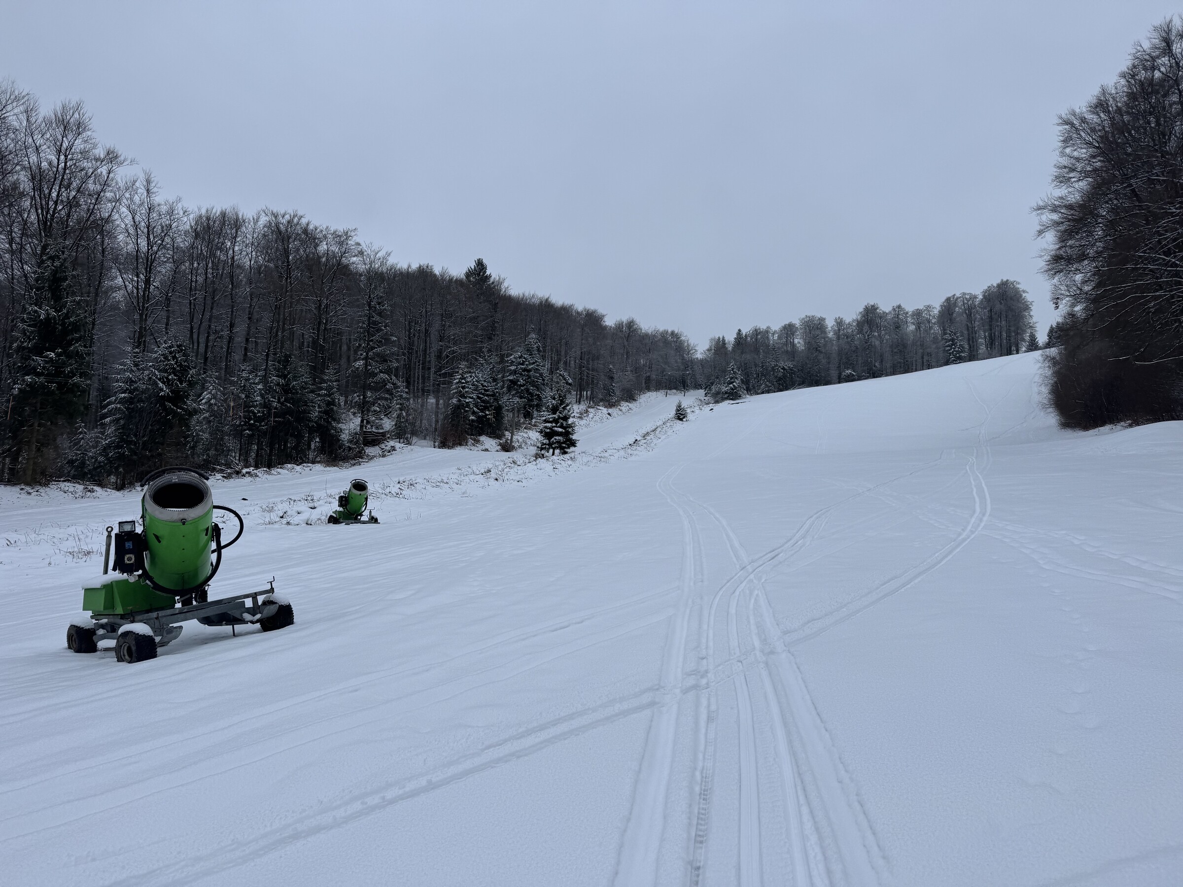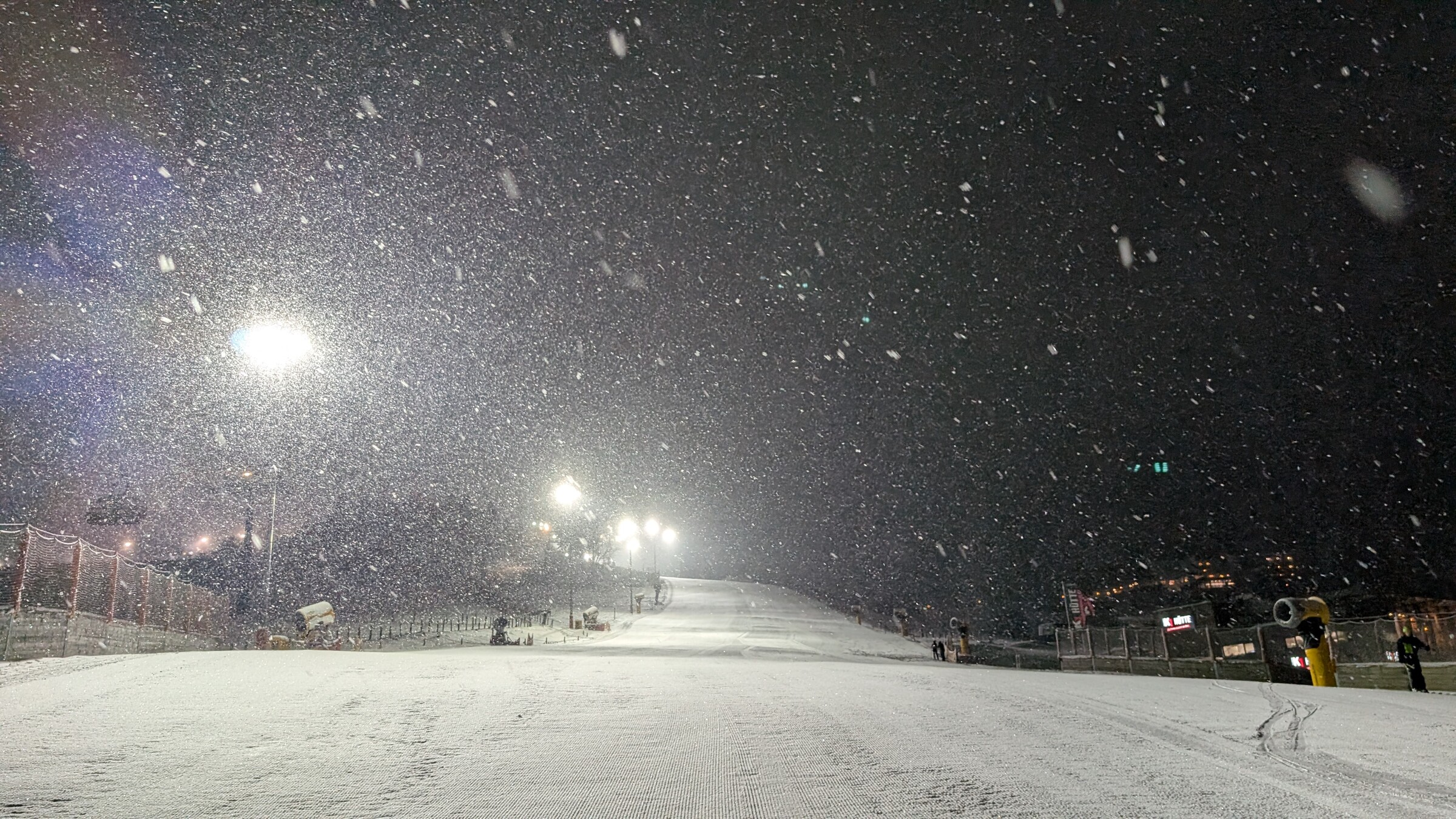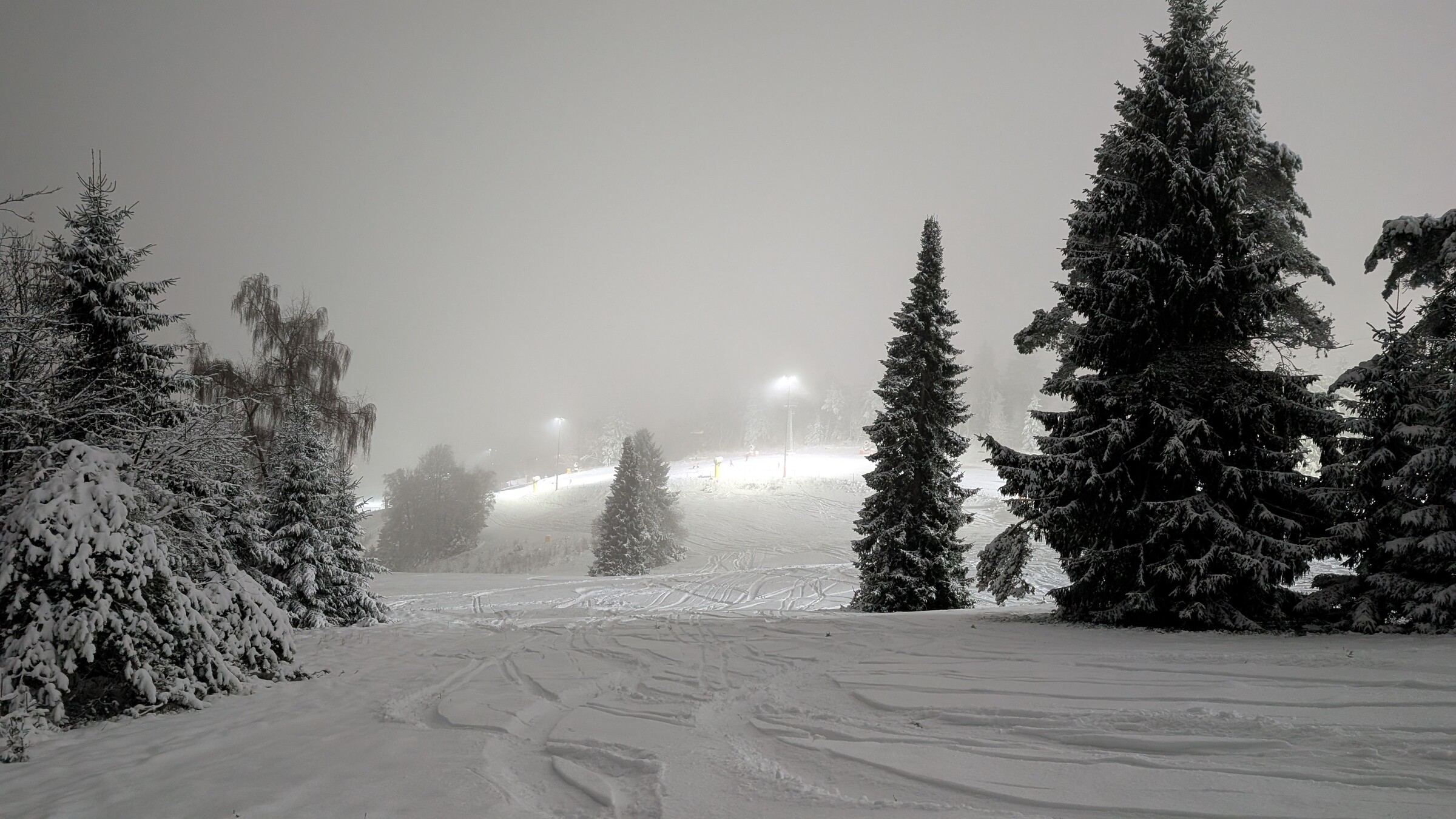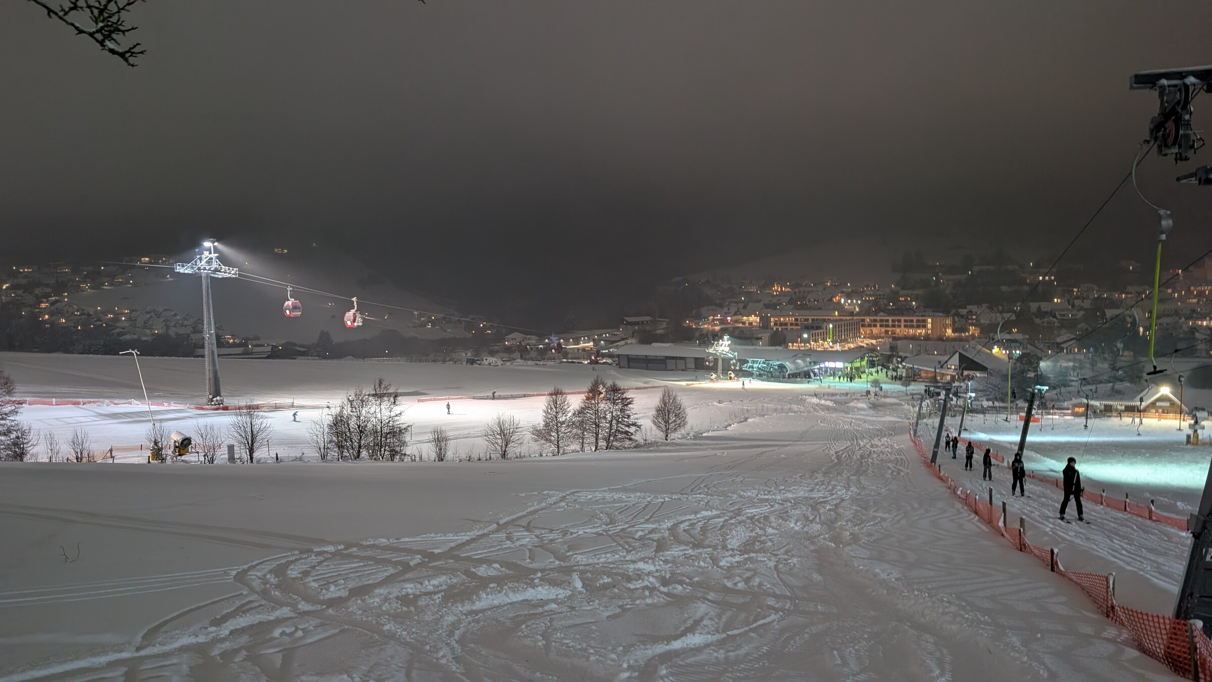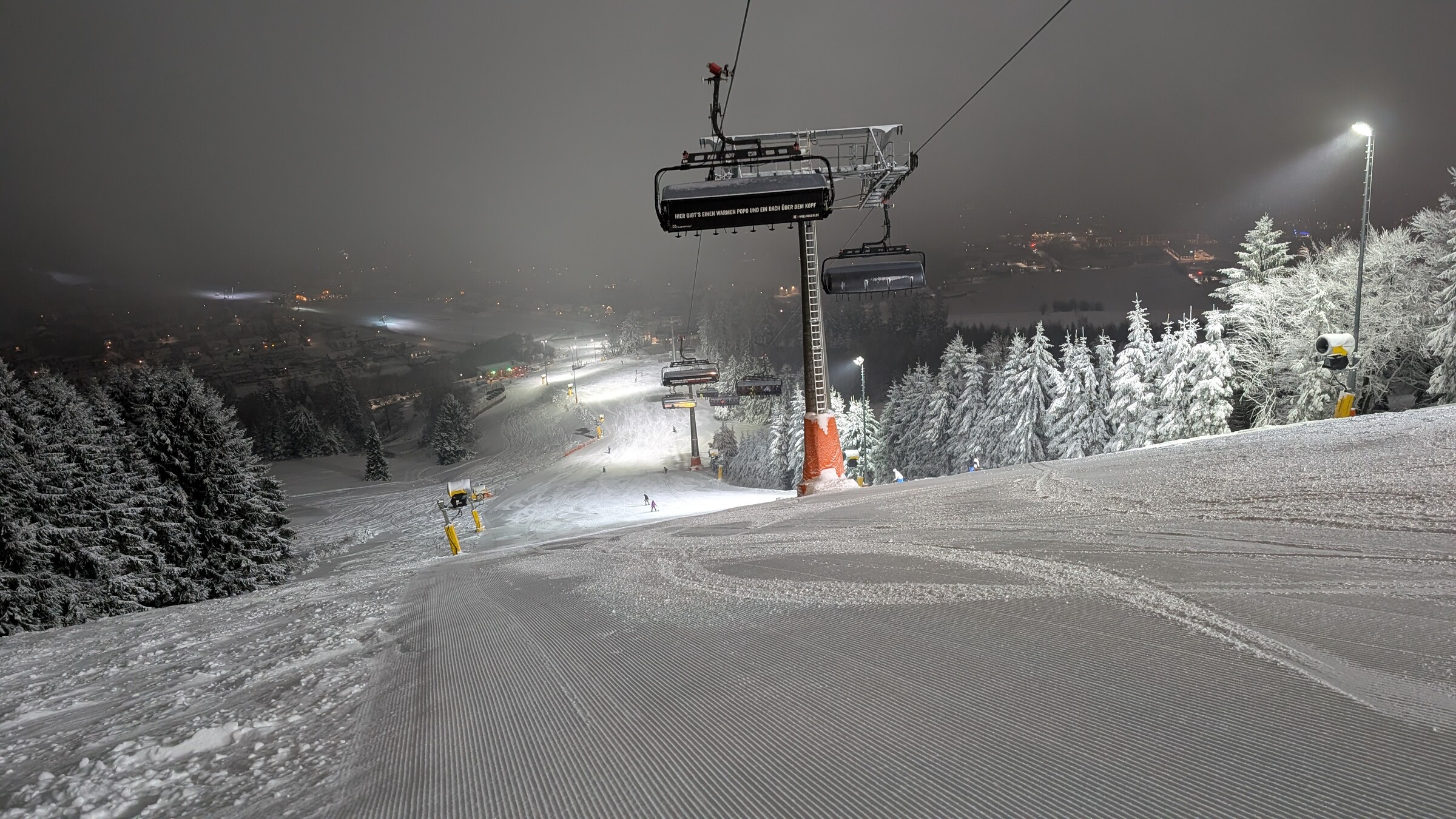 Komme gerade von Flutlicht plus Absacker heim. Hätten sie eben nicht die Kanonen angeworfen, hätte ich gesagt: Heute am Donnerstag wird's perfekt. So kommt oben halt wieder Kunstschnee drauf.