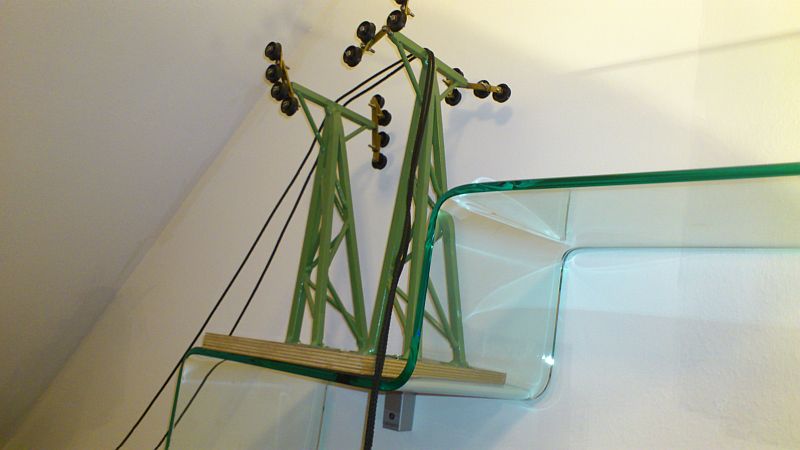 2) Beim Talstationsportalniederhalter wirst Du vermutlich den Robaträger etwas höherstellen müssen weil bei der starken Ablenkung die lange Roba das Seilniveau mehr senkt. Dazu die unter dem Stützenquerträger befindlichen Kontermuttern des Robaträgers soweit lockern und ihn nach oben drücken bis das Seil wieder gerade von den Stationszweierrobas zur Stütze läuft (dabei aber auch darauf achten nicht zuweit zu erhöhen sodaß dann nicht eine der Rollen am Stützenportal schleift wenn ein Gehänge durchfährt) und dann die oberen Muttern nachziehen.