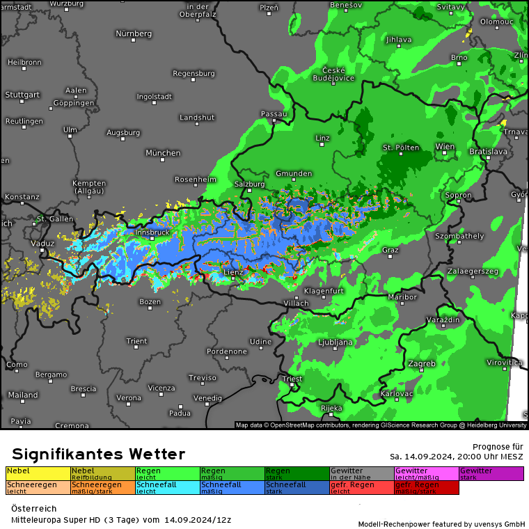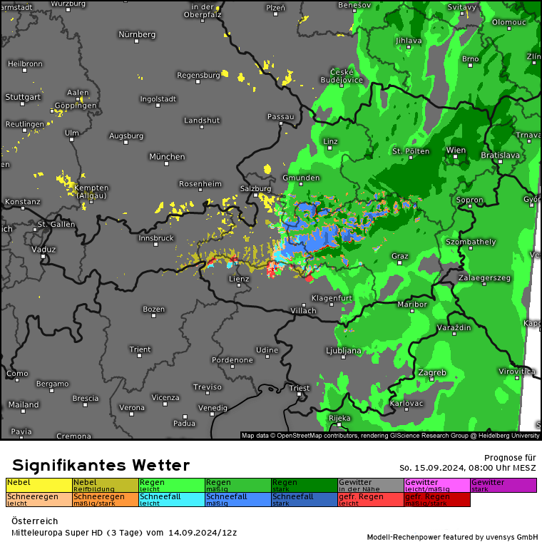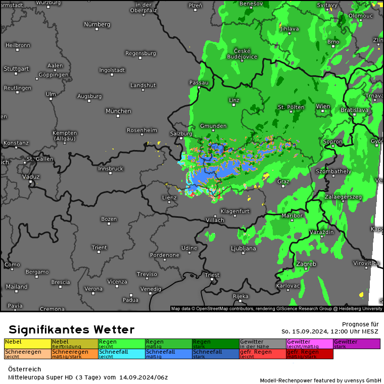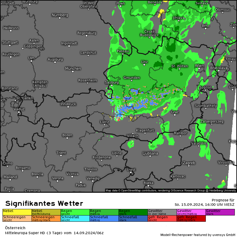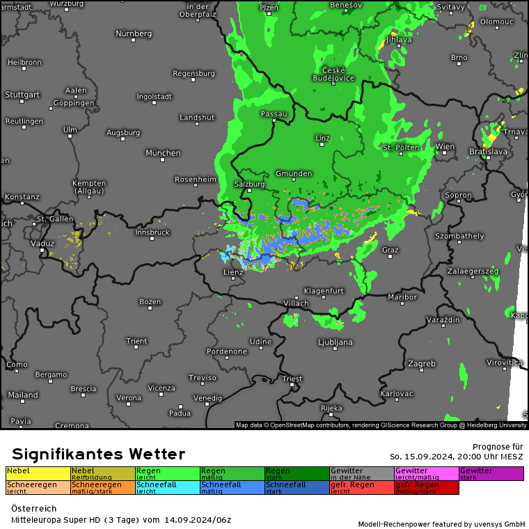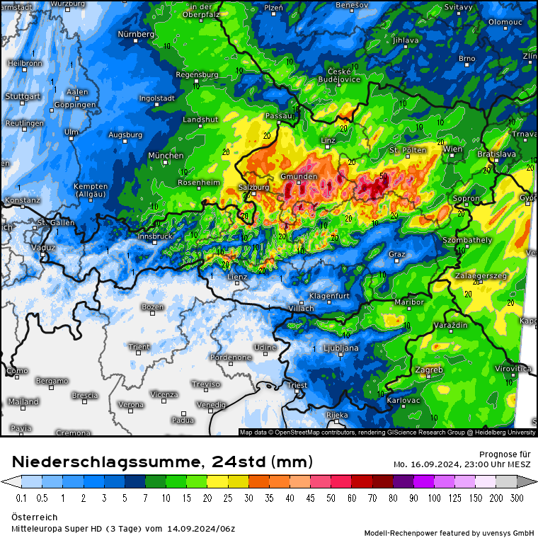 Der massive Regen lässt zwar etwas nach, aber es kommen gem. SuperHD weiter erhöhte Regenmengen in 24 Stunden zusammen. Das SuperHD rechnet weiter für den Bereich OÖ und NÖ Mengen von 30 bis in der Spitze (Nordstau) 80 l/m².