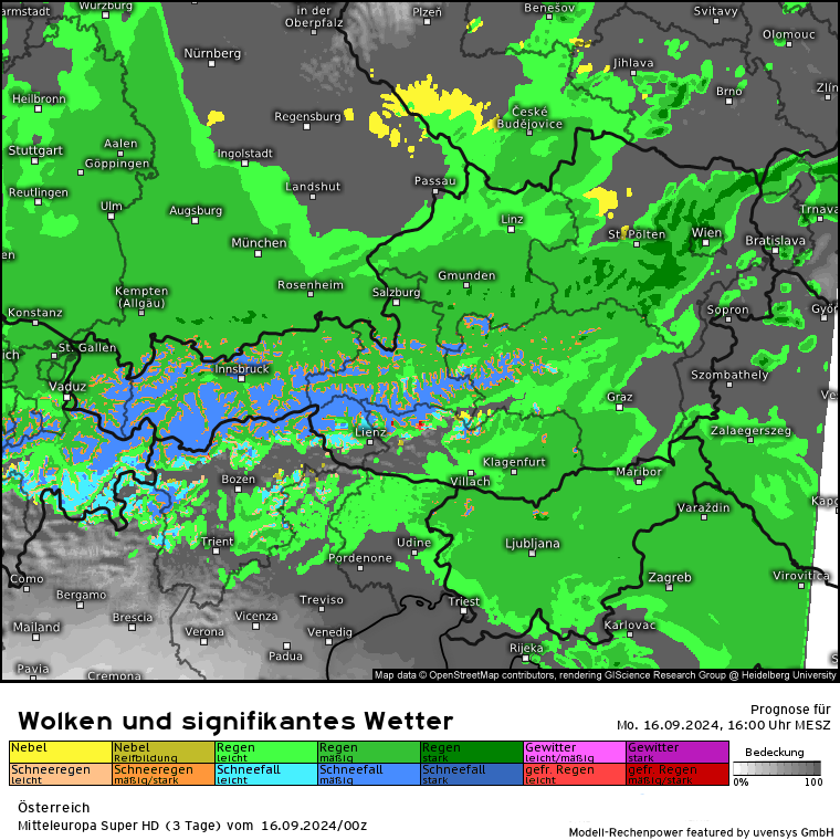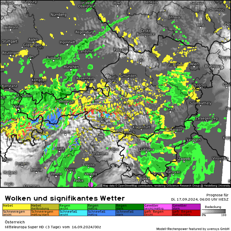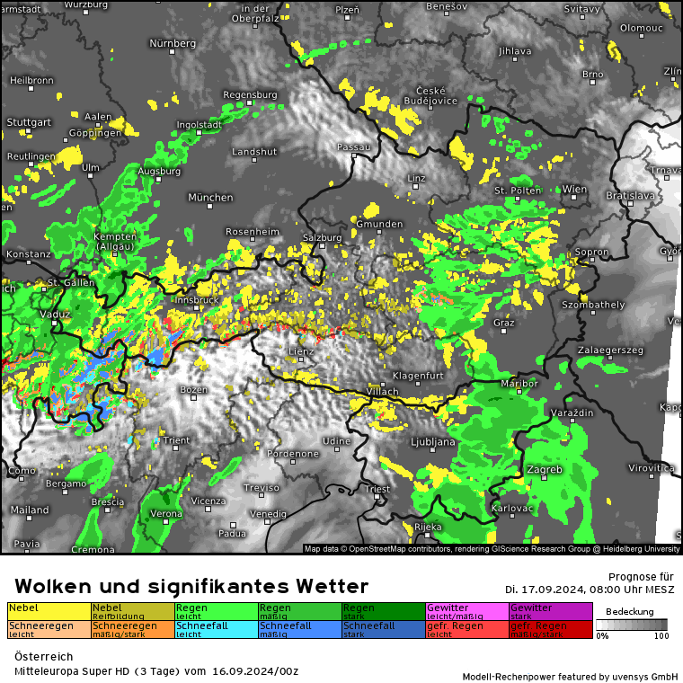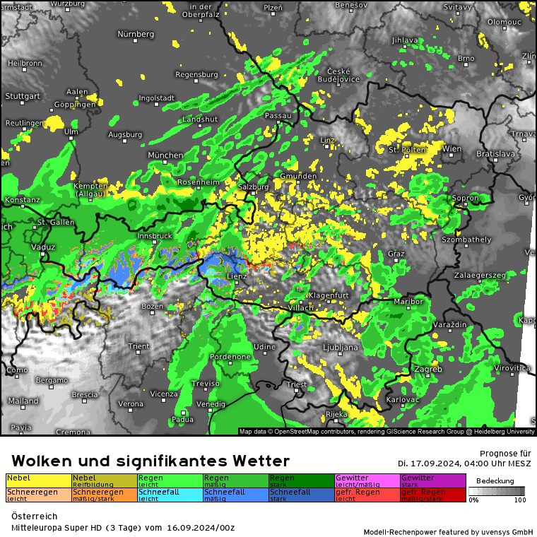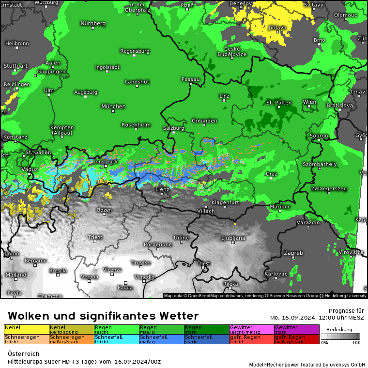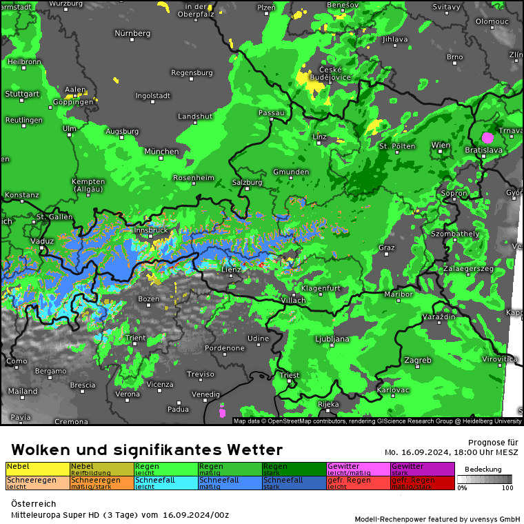Der massive Regen lässt zwar etwas nach, aber es kommen gem. SuperHD weiter erhöhte Regenmengen in 24 Stunden zusammen. Das SuperHD rechnet weiter für den Bereich OÖ und NÖ Mengen von 30 bis in der Spitze (Nordstau) 80 l/m².