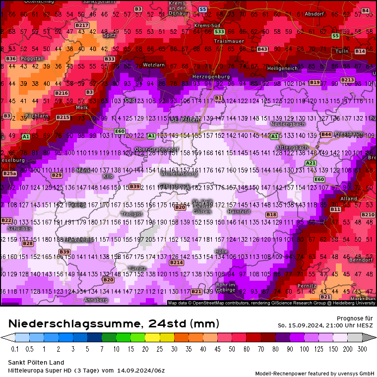 Oben habe ich von den stündlichen Regenmengen gesprochen die aktuell fallen, ein Blick auf die Summe der nächsten 24 Stunden (heute 21 Uhr bis morgen 21 Uhr) macht es nicht besser sondern schlimmer. Das SuperHD rechnet von Westen her eine abschwachende Tendenz. Aber ab Salzkammergut, Dachstein, über Most- und Traunviertel, St. Pölten, Tulln bis vor die Tore Wiens enorme Mengen von bis zu 200 l/m². Gestern habe ich von einem Kartenzoom geschrieben, den ich nicht gepostet hatte, weil der Ausschnitt dann wegen der Details recht klein wird. Jetzt habe ich mal einen Zoom auf Niederösterreich und die Bezirke Melk, Scheibbs, Lilienfeld, St. Pölten, St. Pölten-Land, Tulln und in Teilen Wien-Umgebung: Großflächig um und über 150 l/m² in 24 Stunden!. In der Sitze sogar über 200 l/m² (graue Farbe). Das dramatische ist, dass es eine sehr große Fläche ist und nicht, wie man es oft hat, ein lokales Starkregenereignis.