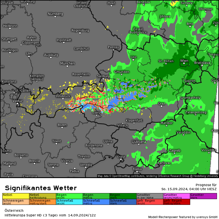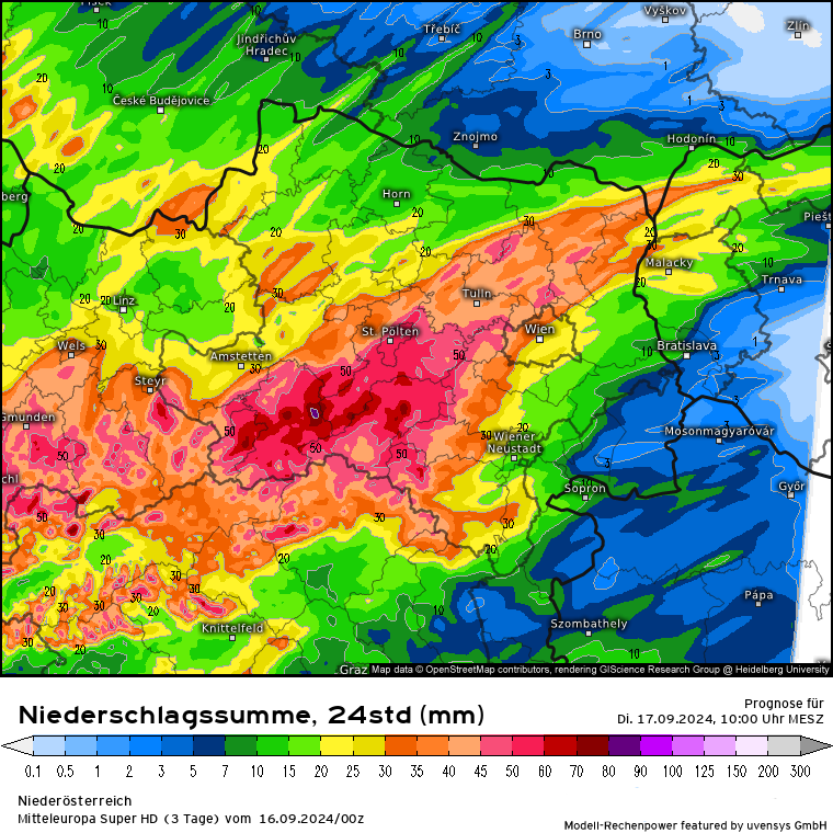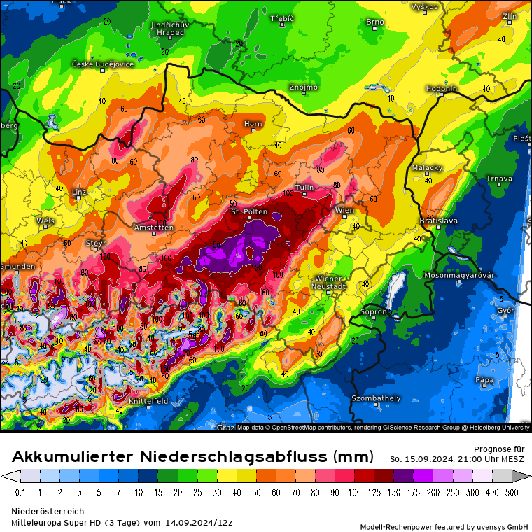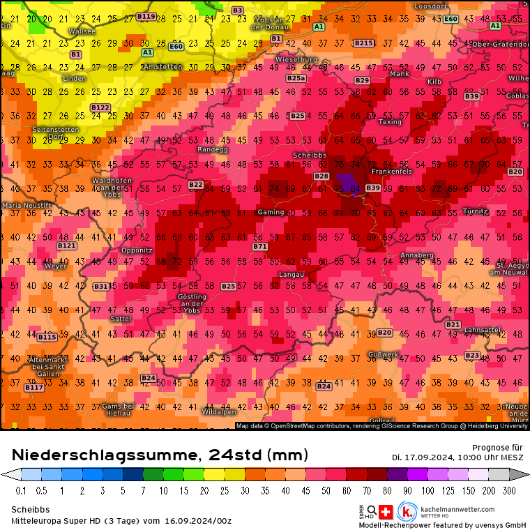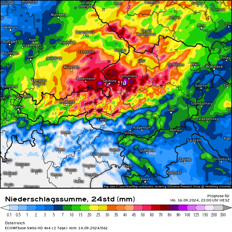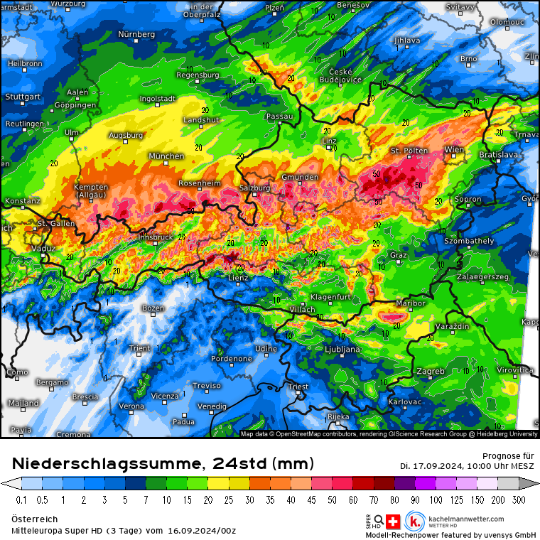 Trauriger Rekordhalter in Sachen Niederschlag dürfte in Österreich wie erwartet in Niederösterreich liegen: Bergstation Lackenhof am Ötscher. Vom Freitag (13.09.) bis aktuell heute sind dort 465 mm Niederschlag gefallen. Alleine in der Nacht von 22 bis 23 Uhr in einer Stunde 53 mm! Die mittlere Monatssumme beträgt dort 199 mm, somit ist innerhalb von 3,5 Tagen die mehr als doppelte Monatsmenge dort gefallen.