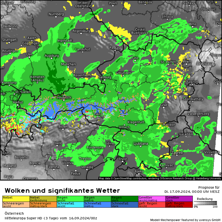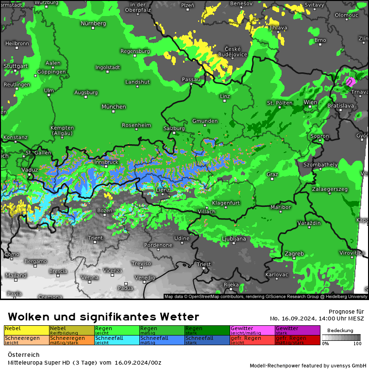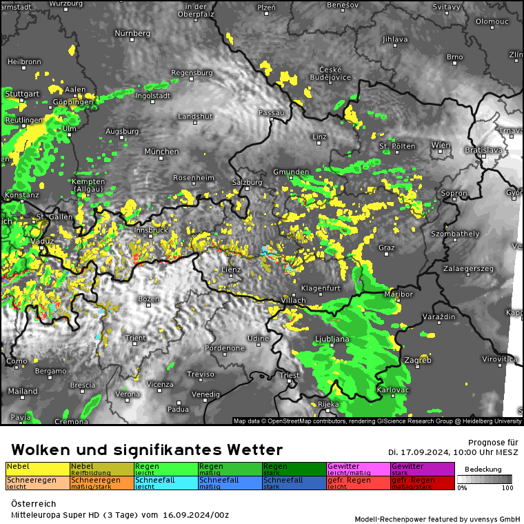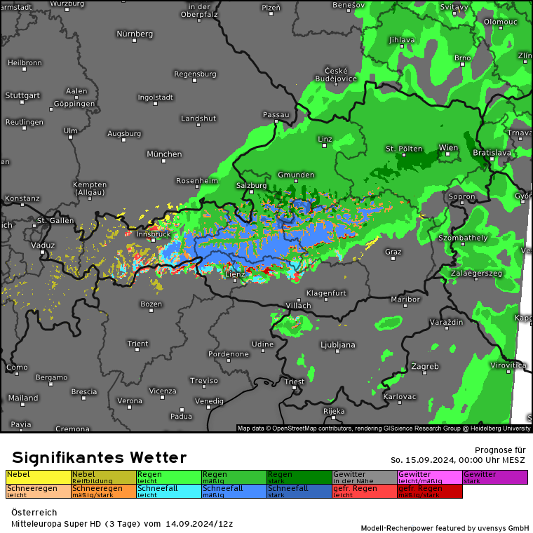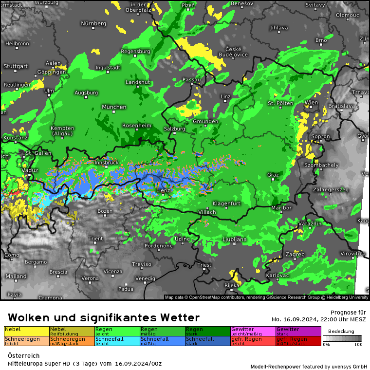 Aber erstmal ein Blick auf die Entwicklung heute: Den ganzen Tag über mäßige bis starke Regenfälle in einem Streifen Nordstau gesamter Alpennordkamm, ganz Bayern, Tirol, Salzburg, OÖ, NÖ und Wien. Nicht zu vergessen die Nachbarn in Polen und Tschechien, welche ja auch massiv vom Hochwasser betroffen sind. Wie stellt es sich im Detail heute dar (habe mich mal für 2 Stunden-Schritte entschieden; also heute 10 Uhr bis morgen 10 Uhr):