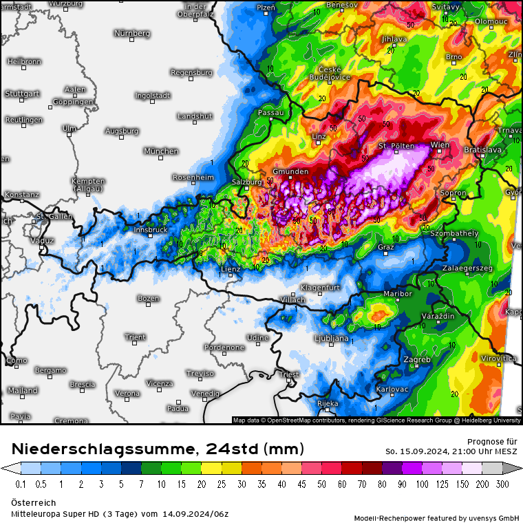 Der Niederschlagsabluss in 24 Stunden spricht weiter eine deutliche Sprache mit großflächig bis 150 l/m² und stellenweise bis 200 l/m² und drüber. Stark betroffen dürften die Flüsse Enns, Ybbs, Erlauf, Pielach, Traisen sowie weitere in dem Bereich sein.