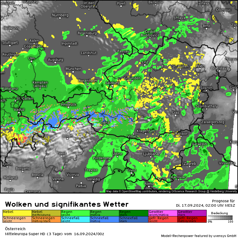 Die SFG liegt heute anfangs bei ca. 1700 m wird aber sukzessive ansteigen auf über 2000m in der Nacht. Also wird zu den Regenfällen noch nicht unerhebliches Schmelzwasser aus den Bergen dazukommen.