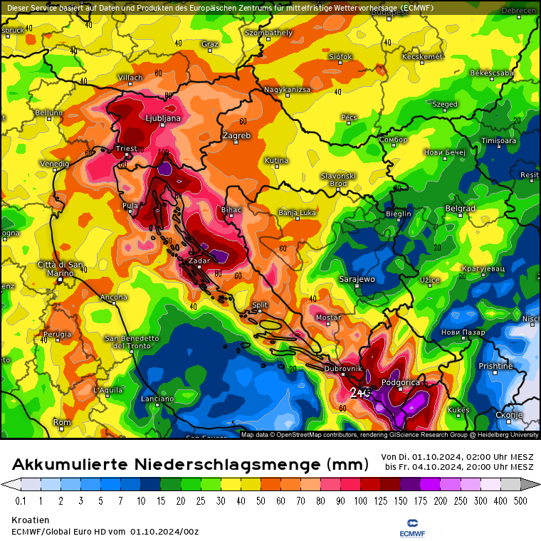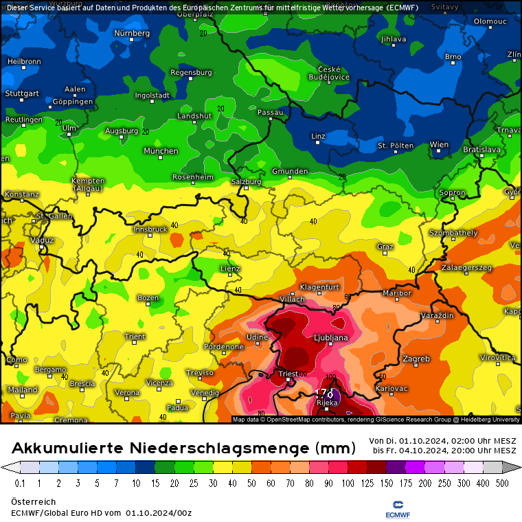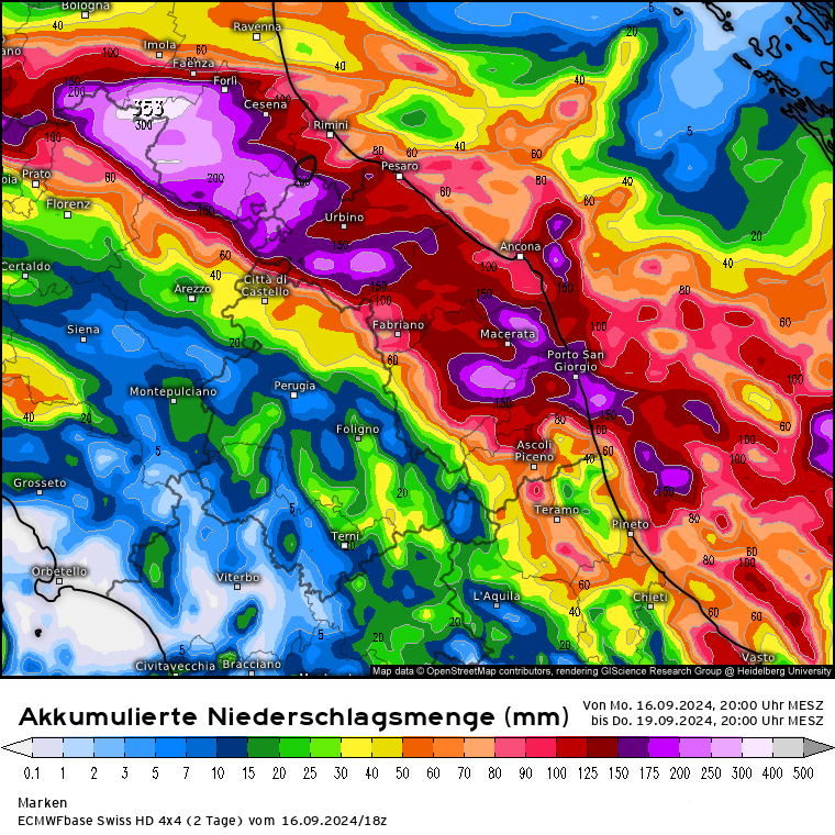 Das Unwettertief ist über die Adria abgezogen, hat sich dort zum 2x mit Feuchtigkeit über dem brühwarmen Mittelmeer vollgesogen und zieht weiter nach Westen, dabei beschert es neue Unwetter, diesmal über Italien und es werden bis Donnerstag dort im Stau der Nördl. Apennin bis zu 350 l/m² gerechnet: EZ4 mit den Niederschlagsmenge bis Donnerstag, 20 Uhr