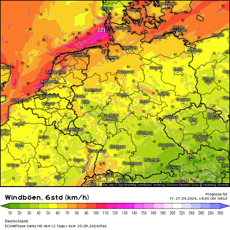 Das Stürmchen - im Vergleich zum Hurricane in Florida - bei uns bringt wie erwartet einen unruhigen Tag im Norden, speziell an der Nordseeküste mit Orkanböen von bis zu 110 kmh (Karte dazu). Aber auch im Süden wird es mit aufziehenden Gewittern und Schauern aus Frankreich kommend gerne mal stürmisch, den Streifen sieht man auch gut im Modell.