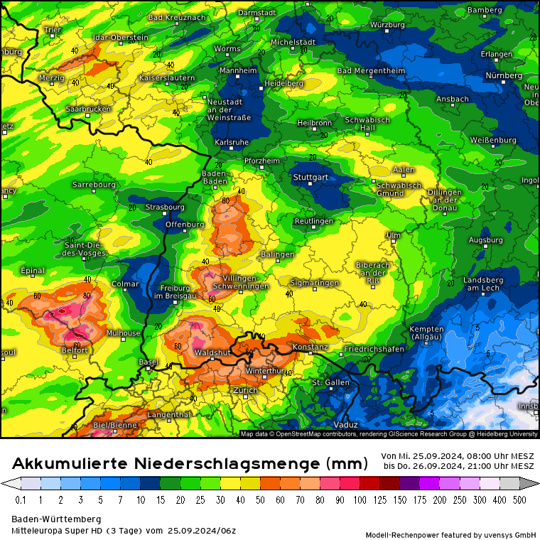 Die Wetterumstellung ist da, mit einigen an kommendem Regen aus Westen/Südwesten in der Nacht. Allerdings liegen wir auf der milden Vorderseite des Tief, so dass zwar viel Niederschlag kommt, allerdings ist eine deutliche Abkühlung wohl erstmal nicht zu erwarten. Morgen wird es nochmal um die 20 Grad warm und bis morgen Abend werden im Süd-Schwarzwald bis zu 90 l/m² an Regen zusammenkommen, verbreitet um die 50 l/m² (Karte akkumulierte Niederschläge).
