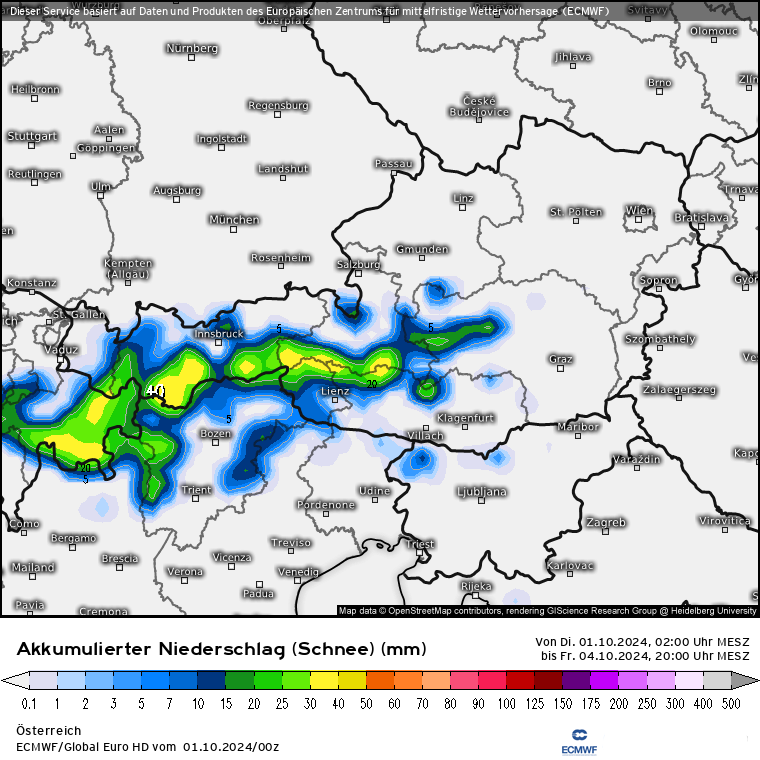 Am Freitag wird ein Höhentief über der Adria kräftige Regenfälle von Kroatien (dort bis zu 240 l/m²) über Slowenien bis nach Kärnten bringen (Karte dazu). Dieses Tief wird seinen Einfluss aber auch über die Alpen bis nach Südbayern ausweiten, allerdings nicht mit so kräftigen Niederschlägen (Karte dazu) ... bei der Kombination von Adria UND Tief muss man da ja nach den letzten Unwettern durchaus erwähnen. Hinsichtlich Neuschnee hat das ECMWF nach oben korrigiert und rechnet durch das übergreifen des Tiefs über den Alpenhauptkamm hinweg nun mit bis zu 40cm in den Höhenlagen (Karte dazu). SFG bei 1.500 - 1.800m, in den Südalpen etwas höher, in den Nordalpen etwas niedriger.
