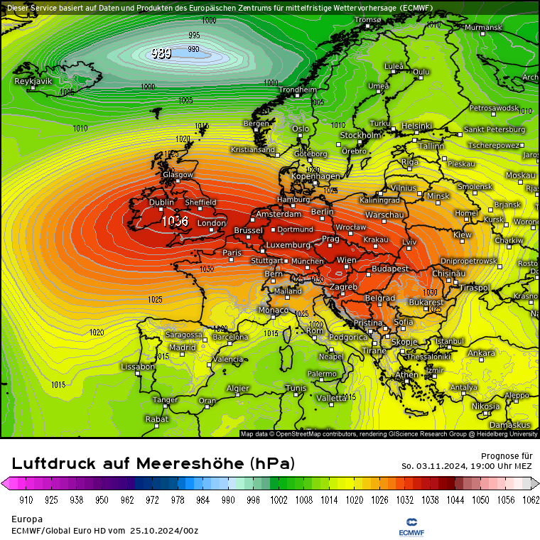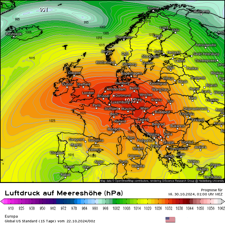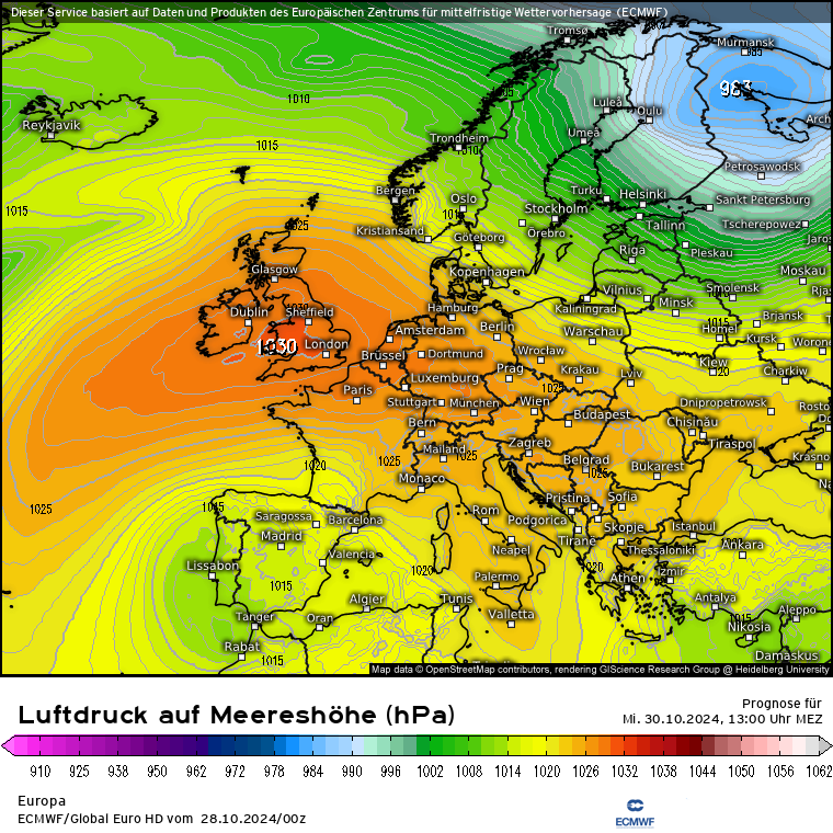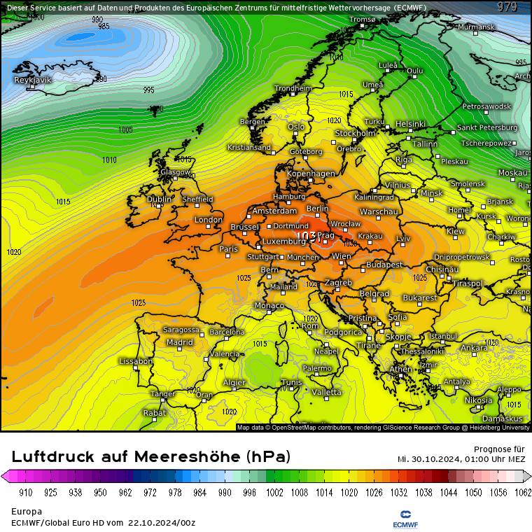 Der Blick auf die Bodenwetterkarte vom ECMWF für Mittwoch zeigt die mächtige Hochdruckzone von den Britschen Inseln über Mittel- bis nach Südosteuropa. Bedeutet ein Herbstwetter wie die Tage, trüb und feucht dort wo die Sonne nicht zum Zuge kommt. Bestes Wanderwetter in Lagen ab 800-1.000m.