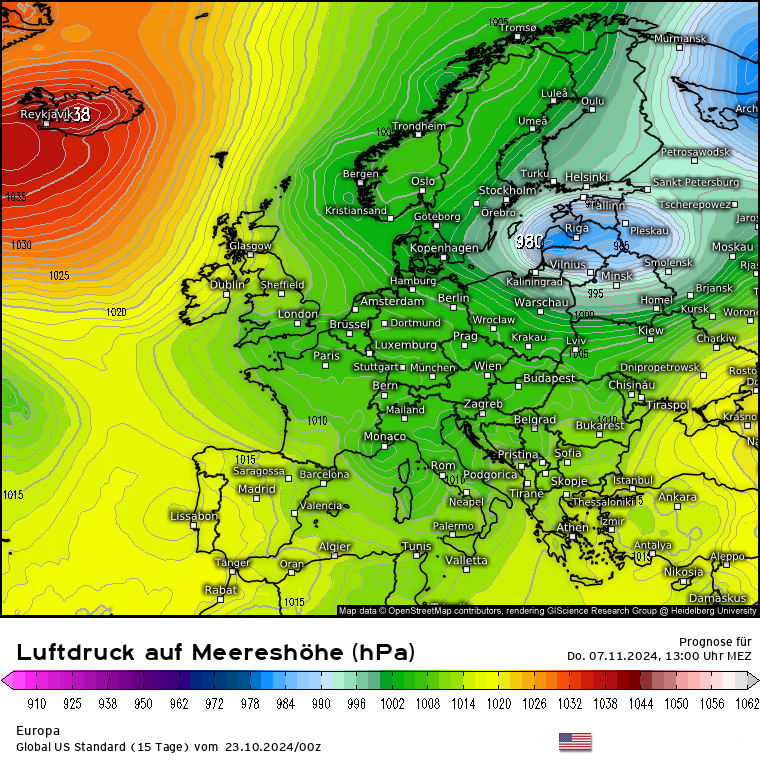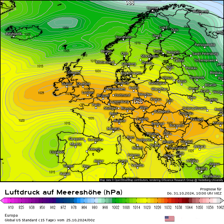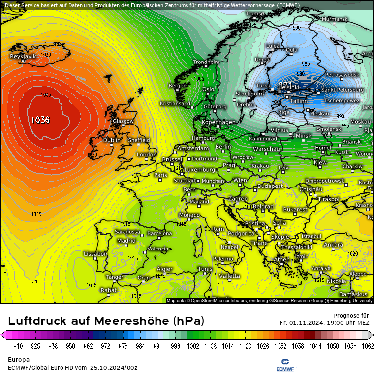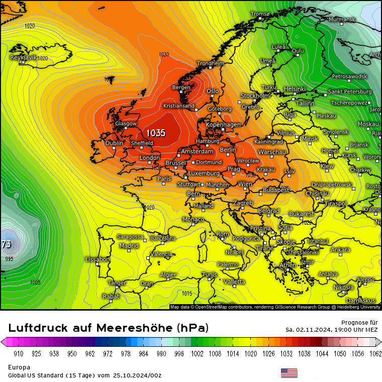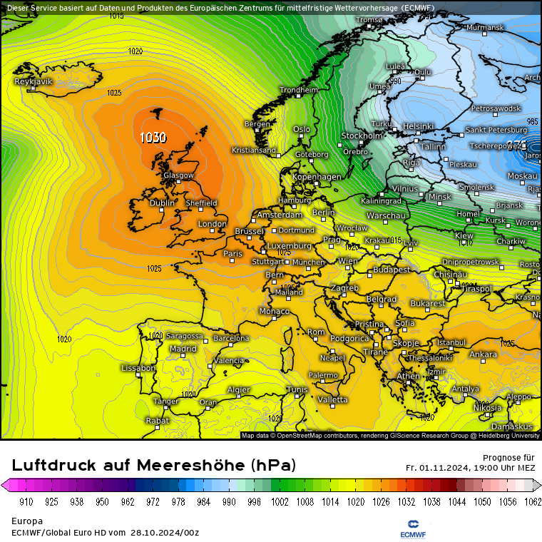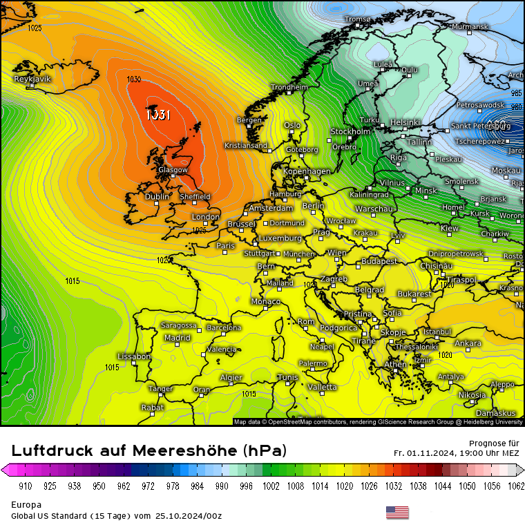 Dann der Monatswechsel zu dem auch ein Wetterwechsel kommen könnte ...da sind sich GFS und ECMWF lediglich darin einig, dass sich das Hochdruckgebiet sehr ungewöhnlich verhalten wird und seinen Schwerpunkt nach Westen verlagert. Aber bei der Lage des Hochdruckgebiets sind sich die beiden Modelle nicht ganz einig und dieser Unterschied hat auch Einfluss auf die Prognose, wie weit die Kaltfront vorstoßen wird. Das GFS sieht das Hochdruckgebiet über den Britischen Inseln sogar bis nach Island, die Westverlagerung ist also nicht so stark und dadurch kann die Kaltfront nicht so weit vorstoßen, da sich das Hochdruckgebiet recht schnell wieder nach Osten verlagern wird. Erkennbar an der Karte für Samstag 02.11.. Die Kaltfront wird sie Alpen also nicht erreichen, maximal die Mitte Deutschland erreichen und es würde sich das altbekannte, hochdruckgeprägte Wetter der letzten Tage einstellen.
