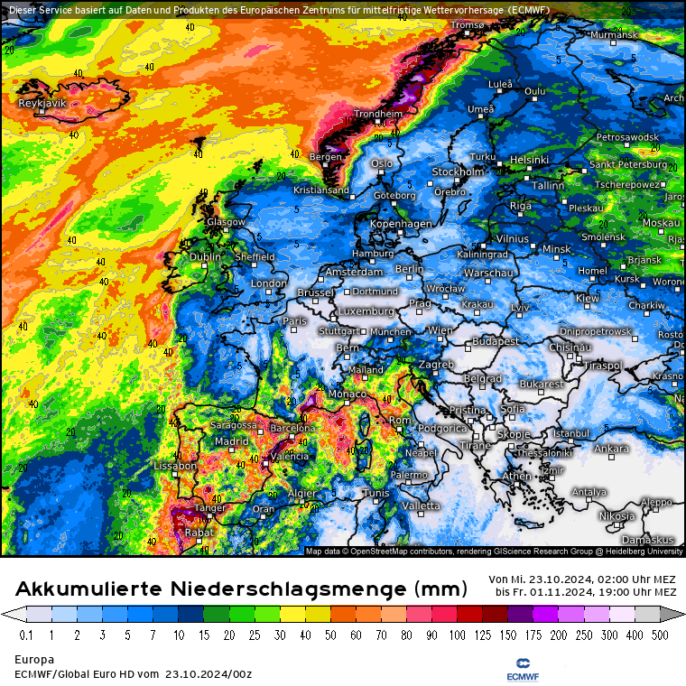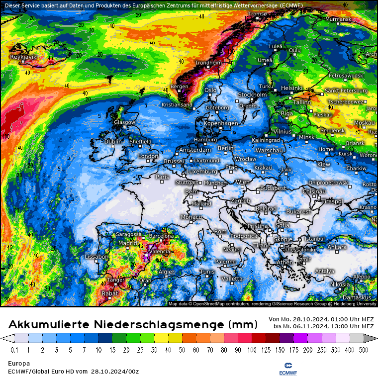 Also bis Ende nächster Woche sollte wettertechnisch durch das starke Hoch nicht viel Richtung Wetterumstellung passieren. Wenn man sich die durch das ECMWF prognostizierten Niederschlagsmengen bis nächsten Freitag anschaut, dann erkennt man über Zentraleuropa, dass da durch das Hochdruckgebiet nicht viel kommt. Auffällig ist, dass die Tiefdruckgebiete vom Atlantik kommend nach Skandinavien und Iberische Halbinsel abbiegen. In Skandinavien - namentlich Norwegen - starke Stauniederschläge an den Bergen und in Spanien/Südfrankreich/Raum Genua wird sich wiederholt ein Tief festsetzen. Also erneut werden die Regionen von starken Niederschlägen getroffen, die schon zuletzt mit deutlich über 400 l/m² getroffen wurden.
