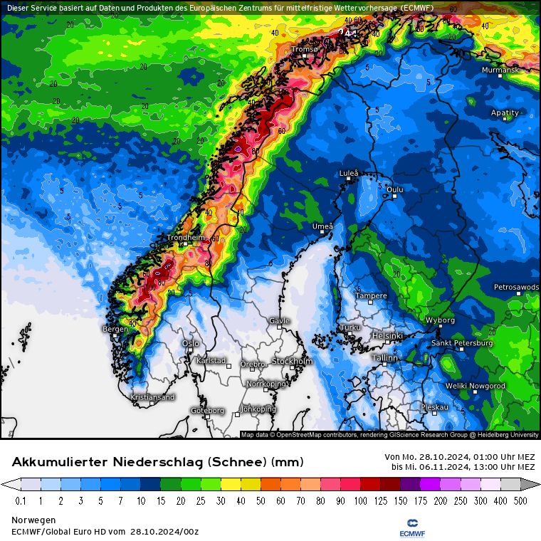 Nächste Woche? Ein Blick auf die Höhenwetterkarte des ECMWF für Mittwoch (06.11.) zeigt eine Omegawetterlage. Das ruhige Wetter wie wir es von zuletzt kennen würde sich so fortsetzen. Deutet also auf die Inversionswetterlage hin, die wir eben momentan haben. Warme Luftmassen in der Höhe mit viel Sonne und feucht-kühle Nebelsuppe im Tal. Ein Kaltlufteinbruch ist momentan nicht in Sicht. An den Niederschlagsmengen ändert sich auch herzlich wenig in den für uns interessanten Bereichen: Das ECMWF hat bis zum 06.11. für Mitteleuropa so gut wie nichts im Modell. Starke Niederschläge weiterhin an der spanischen Mittelmeerküste sowie in den Staulagen Norwegens. Und dort habe ich mal den wehmütigen Blick auf die Niederschläge in Form von Schnee geworfen ... dort ist der Winter mit bis zu 240cm Schnee bis zum 06.11. im Norden Norwegens. Aber auch entlang der "Norwegischen Alpen" in den Staulagen meist um 100cm. Wer den Winter also sucht ... in Norwegen wird er fündig.