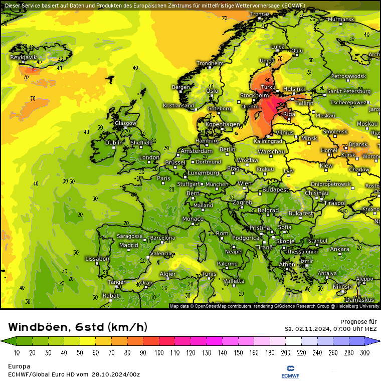 Das Hauptwindfeld sieht das ECMWF für Samstag über die Ostsee kommend über das Baltikum ziehend, wird dann im Tagesverlauf schwächer, da die Kaltfront Stück für Stück vom Hochdruck aufgelöst werden wird. Für DACH ist gem. Modell alles im "grünen Bereich".Gleitweggleiter hat geschrieben: 28.10.2024 - 12:14 Wieder ein interessantes Update.