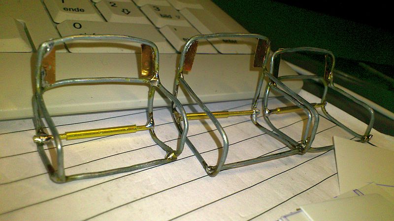Tom, probier mal bei den W&S - Sesseln den Gehängerohrrahmen nicht mit 3mm sondern nur einem 1,5 - 2 mm Messingdraht zu machen; nachdem auch bei W&S dieser eigentlich zu zierlich war (deshalb ja nach einiger Zeit auch teilweise verbogen) würden die Sessel dann weitaus stimmiger aussehen denn so ist der Kontrast zwischen den höchst gelungenen Sesseln selbst und dem Gehängerahmen zu deutlich. Außerdem ließe sich ein dünnerer Draht an den Stellen vorbildentsprechend in schärferen Ecken biegen wo er den Sessel unten umläuft und oben auch bis zur Klemme rauf parallel führen ohne das er zu massiv wirkt.
