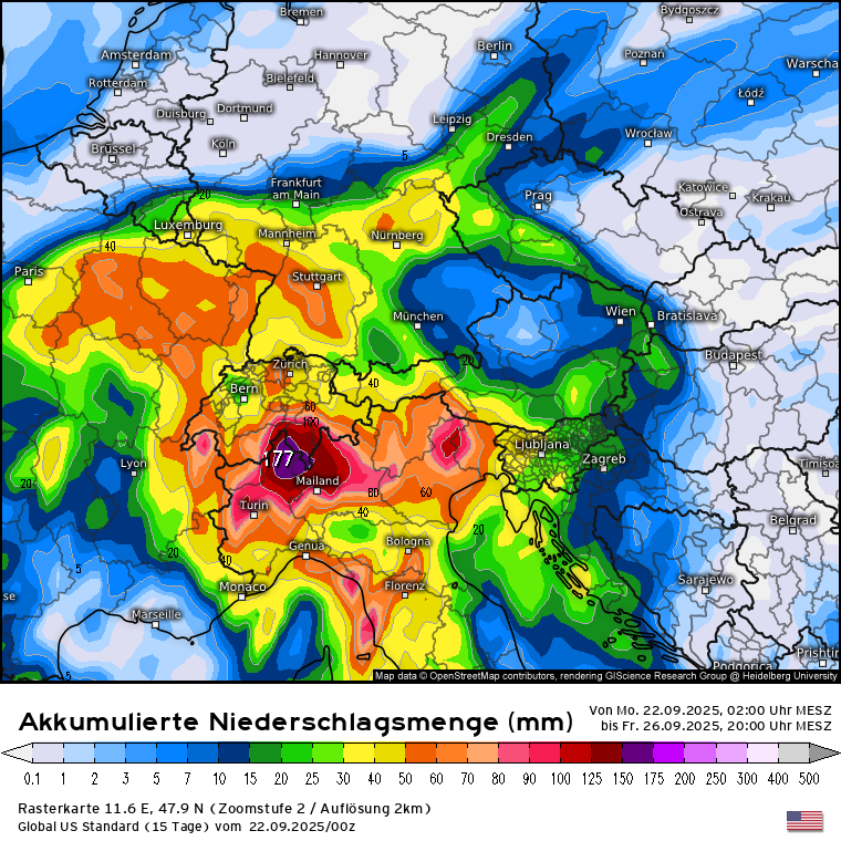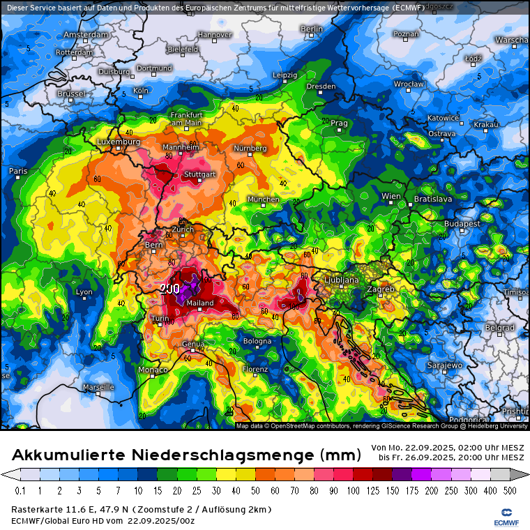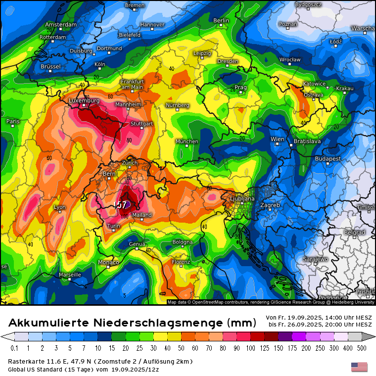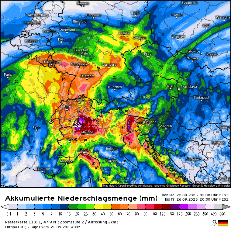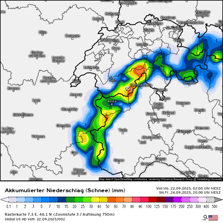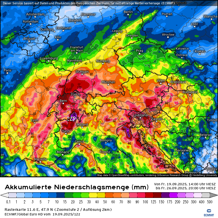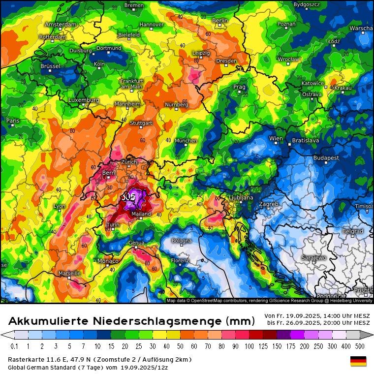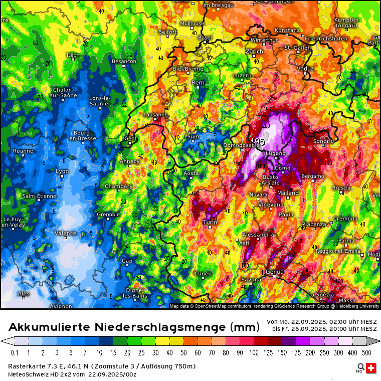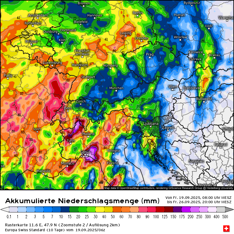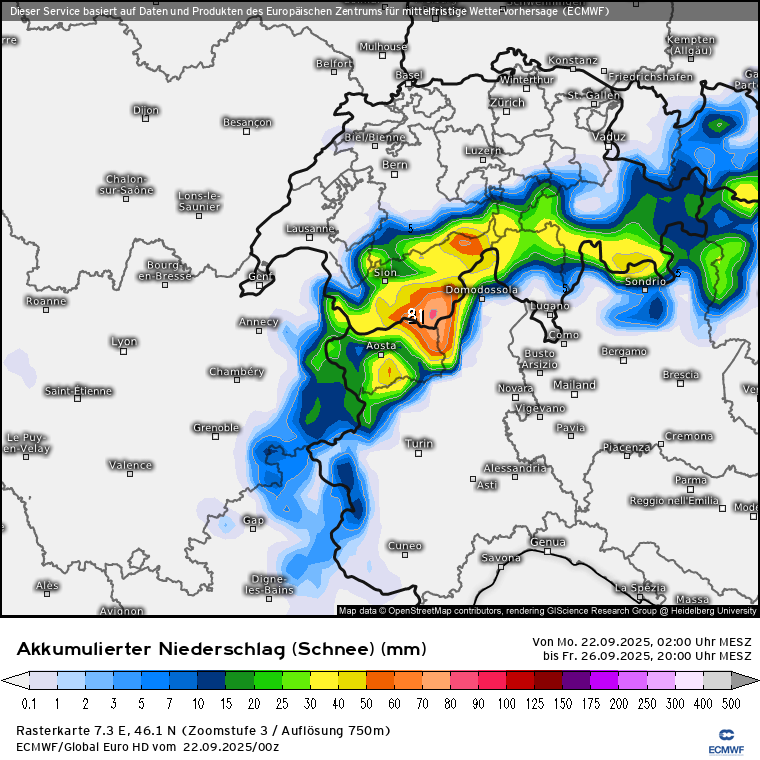Habe eben nochmal geschaut und die Modelle sind sich einigermaßen einig, dass das abgespaltene Höhentief - welches nebenbei bemerkt diese Nacht an der Südküste Frankreichs (Region Toulon) innerhalb von 6 Stunden bis zu 150 l/m² gebracht hat - von Frankreich kommend Richtung Alpen sieht und dort Mittwoch ankommen soll und bis Freitag eher ortsfest im Bereich Südschweiz/Norditalien verharren soll. Schwankungen treten in den Modellen bei den NS-Mengen bis Freitagabend auf, bedingt auch dadurch wo genau das Tief zum Liegen kommt: ICON, GFS, ECMWF. Den Vogel schießen die Schweizer ab und prognostizieren bis zu 500 l/m² bis Freitagabend: SwissHD.Stani hat geschrieben: 21.09.2025 - 07:06wobei es pendelt sich hin un her, falls so kommt, dann 40-50 cm sind gut möglich auf manchen Gletschern, sonst zw 10-20 cm bis zum nächsten WE.snowflat hat geschrieben: 19.09.2025 - 21:52 Also die Modelle sehen für Mittwoch ein über dem Mittelmeer abgespaltetes Tief mit einer Vb-ähnlichen Zugbahn zu den/über die Alpen. Entsprechend werden aktuell die Niederschlagsmengen bis Freitag gerechnet: GFS, ECMWF, ICON und Swiss im Vergleich. Klar ist es noch was hin ... aber das gilt es zu beobachten.