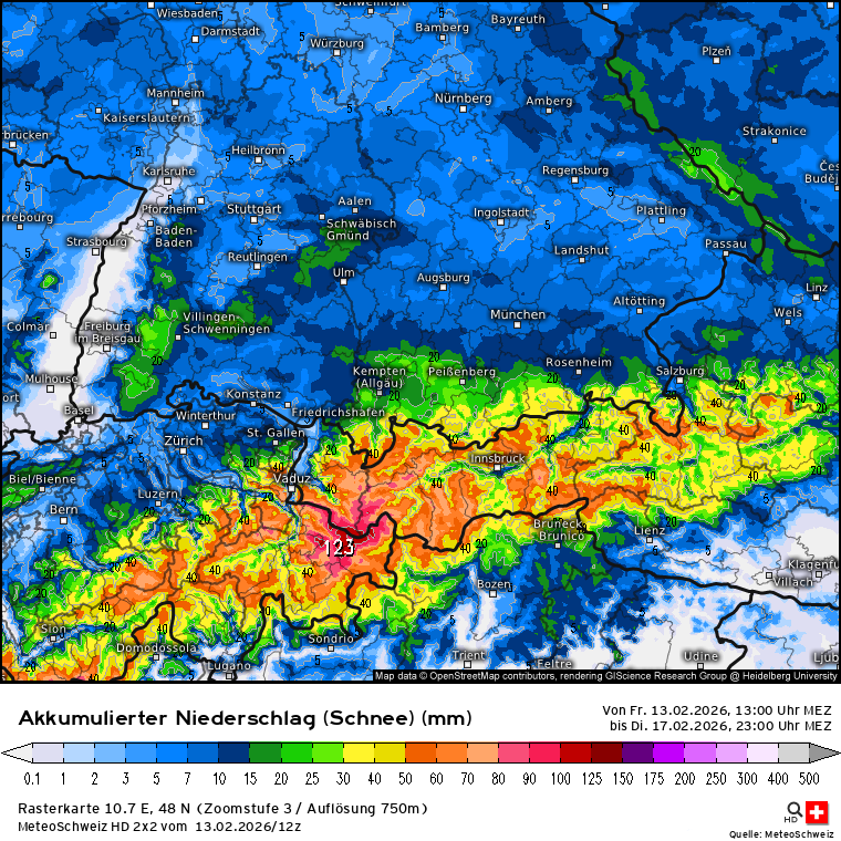 Das wäre endlich mal ein sauberer Nordweststau, wenn er denn so kommt - nachdem die Mengen für Samstag heruntergerechnet wurden und auch bisher (in den Ostalpen) nicht wirklich viel kam.snowflat hat geschrieben: 13.02.2026 - 16:40 Mal gucken, ob die Schweizer ein gutes Modell stellen ... Montag & Dienstag soll es gut was geben: Karte der Hoffnung