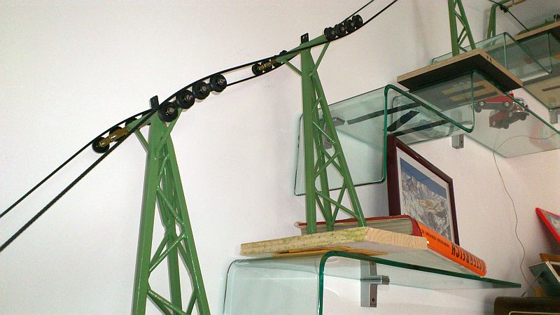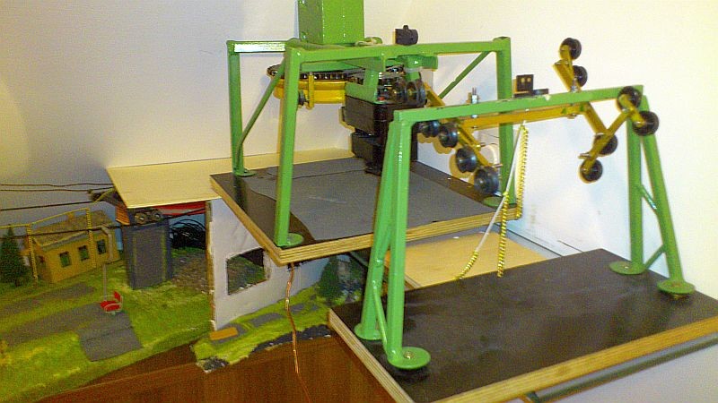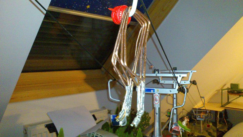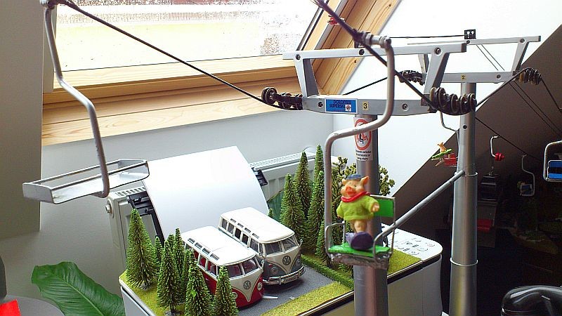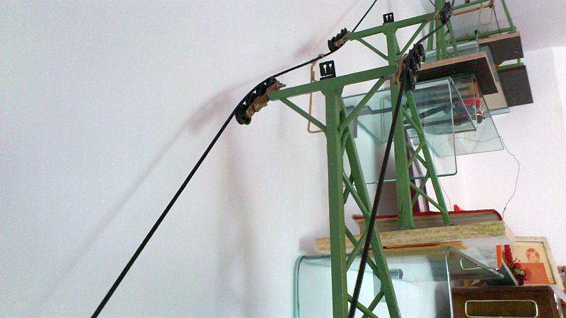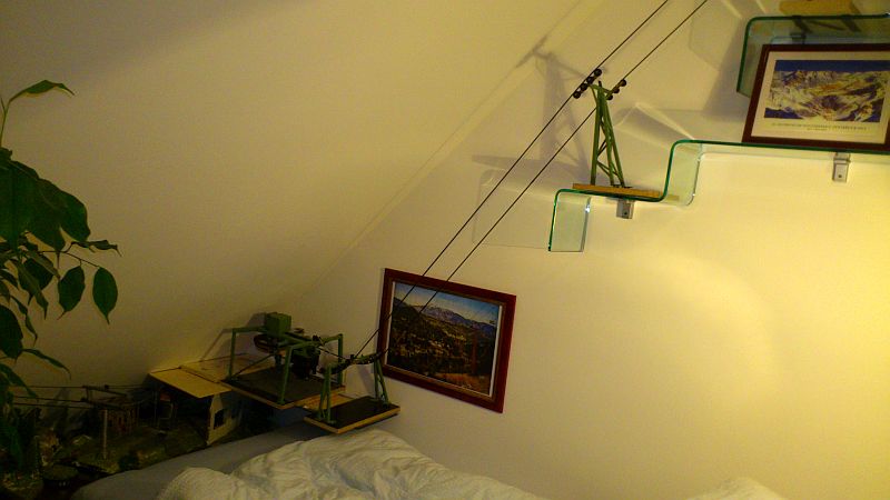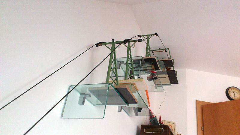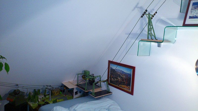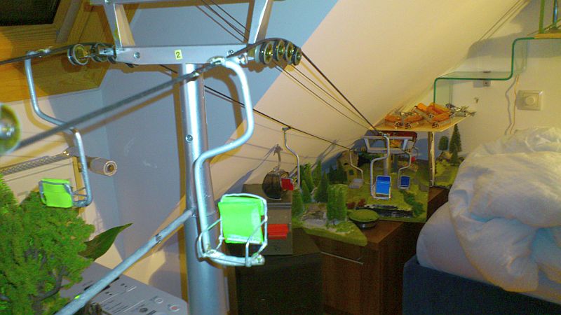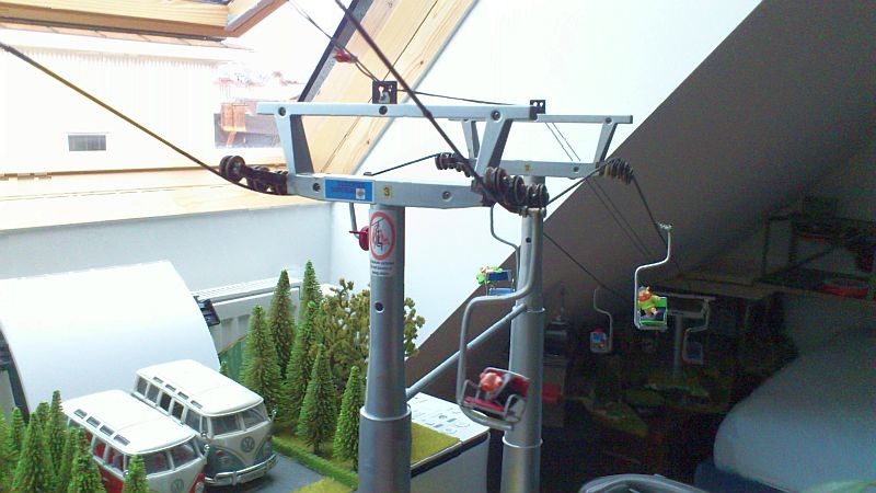 An der einen Stütze (die auf einem Foto ganz alleine ist) würde ich eine Wechsellastroba anbringen, da durch die Steilheit des Seil kaum Druck auf die Rollen ausgeübt wird, was Seilentgleisungen begünstigt. Marco hat gerade eine grandiose funktionierende Wechsellastroba gebaut. Aber das passt wohl nicht zum W&S. Ein Rösslsprung wäre da eine Alternative, aber dazu fehlts dir an einer Stütze.