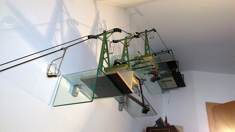 Meine Herren! Die Seilspannung und der Auflagedruck sind i :ja: :ja: :lach: n Ordnung. In 24 Stunden Probebetrieb ist es zu keiner Seilentgleisung gekommen. Die Regale bleiben wie sie sind da ich keinen Emmentaler aus der Rigipswand machen will. Die Strecke gefällt mir so wie sie ist und geht so in Betrieb. Auch kommen mir keine neumodischen Wechsellastrobas drauf denn die hats 1949 noch nicht gegeben. Die erste Steurerwechsellastroba ist auf dem Gaisberglift Salzburg zu sehen. Sieht auch furchtbar aus. Prosit Neujahr! Euer Tom :ja: :ja: