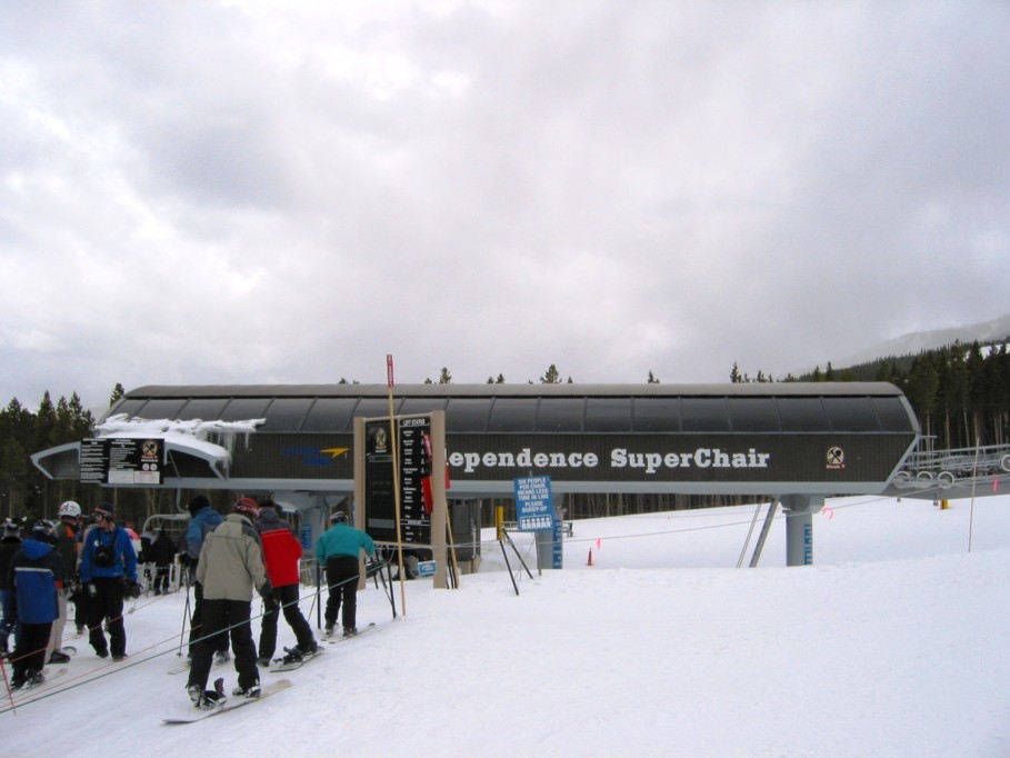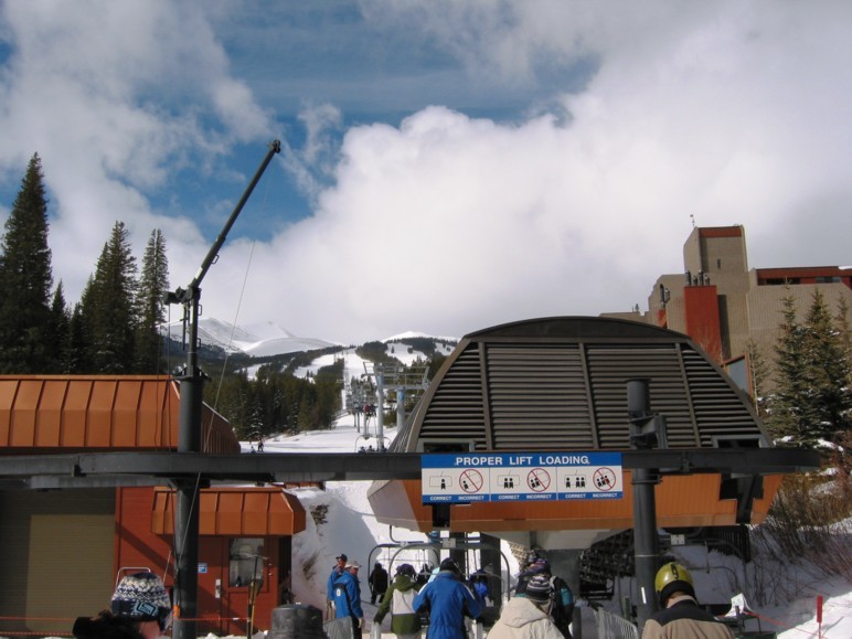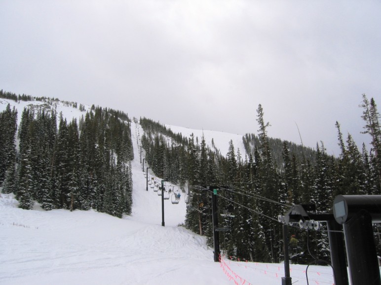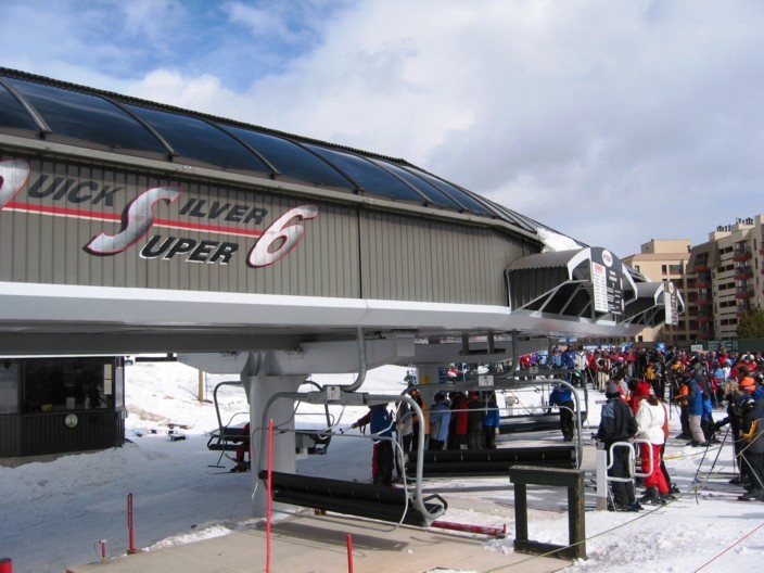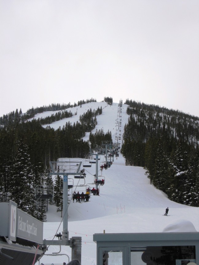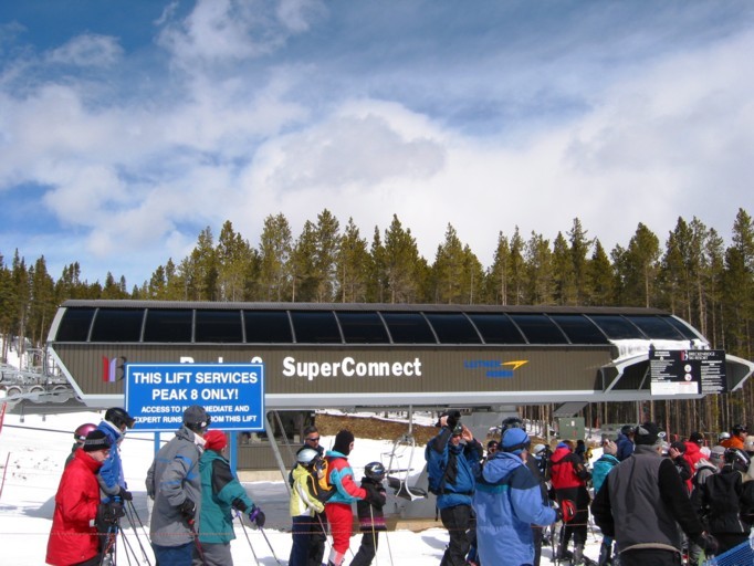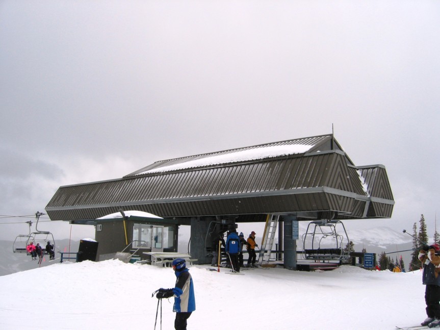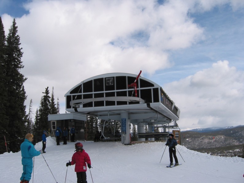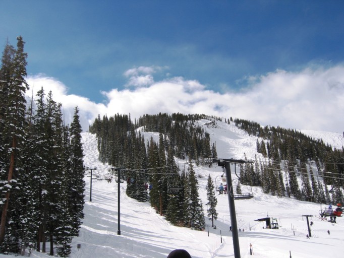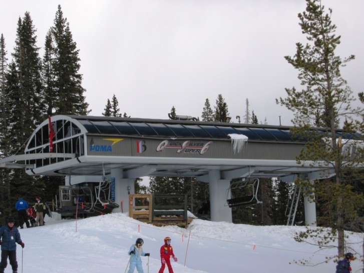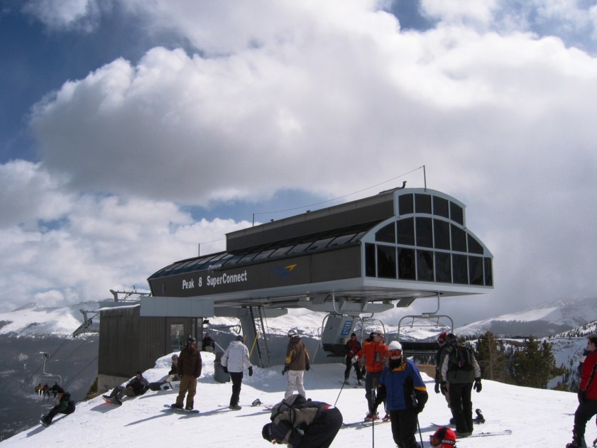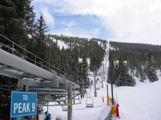 Peak 9: schwierig auf den Punkt zu bringen, höchster Punkt 3494 m, Bergstation 4KSB Mercury Super Chair. Ganz unten ist es sehr flach, die 6KSB Quicksilver Super 6 ersetzte 1999 die erste 4KSB der Welt (1981) gleichen Namens, der Hauptzubringer ins Skigebiet, hat Double Embarquement und schafft 3600 p/h. Hier sehr viele Anfänger und Skikurse, sehr voll. Im oberen Bereich wird diese Bahn von der 3SB Chair A gedoppelt, von der Charakteristik sehr ähnlich. Von der Bergstation Quicksilver kann man durch eine kurze Querfahrt den Peak 10 und die 4KSB Falcon erreichen. Einige Meter höher als die 6KSB startet die Hauptbahn des Peak 9, die 4KSB Beaver Run Super Chair, die beeindruckende 2,8 km den breiten Berg hinaufdonnert, aber nur 485 Hm überwindet. Diese Bahn bedient praktisch alle Hauptabfahrten (Bonanza, Columbia, American, Cashier), die alle ähnliche Eigenschaften aufweisen: breit, ganz oben flache Ouvertüre, dann ein toller mittelsteiler Hang, ab der Hälfte aber immer flacher auslaufend, viele Kreuzungen und Speed Control. Als Entsatz-Anlagen laufen hier noch die 4KSB Mercury Super Chair (auch nur 2,3 km lang) und die DSB Chair C nicht parallel und um einige Meter versetzt. Die schönsten Pisten sind hier wieder die „more difficult trails“ wie „Upper American“, „Peerless“ oder die einsame „Upper Lehmann“, die weiter unten flott einem Taleinschnitt folgt. Auch ein bisschen Tree-Skiing-Gelände gibt es hier, an der DSB Chair E (Nordhang). Als letzter Lift in diesem Bereich startet im unteren Flachteil des Peak 9 die 4KSB Peak 8 Super Connect (2002), eine der seltenen KSBs mit Mittelstation. Mit 2,5 km Länge verbindet sie die beiden Hauptskiberge, an der Mittelstation besteht Zusteigemöglichkeit für Wiederholungsfahrten an der skifahrerisch interessanten 2.Sektion (hier double diamond Buckelpisten). Die Verbindung in Gegenrichtung (also Peak 8 zu Peak 9) stellen die DSBs Chair E und C dar, oder man fährt recht lange Ziehweg.