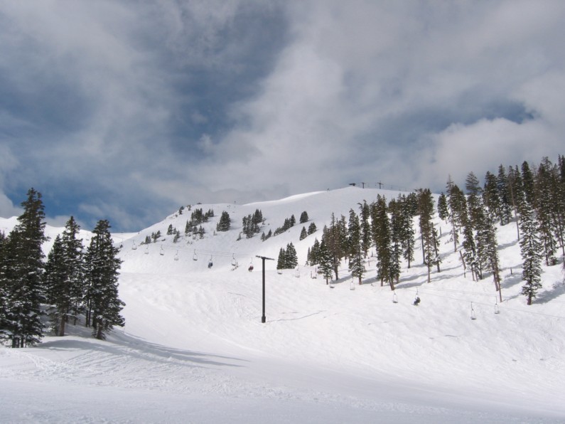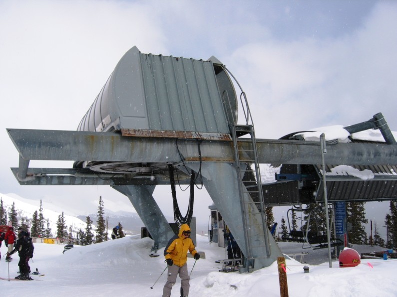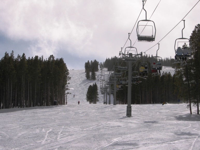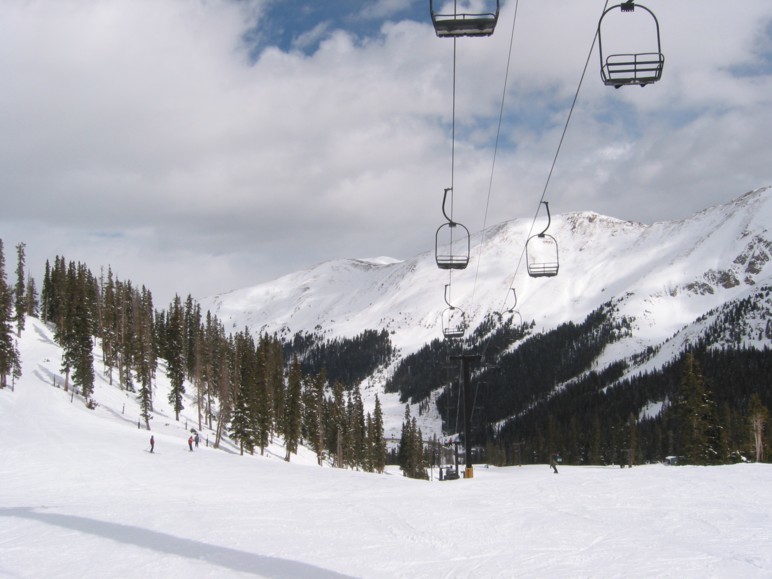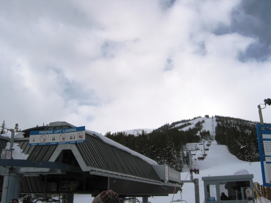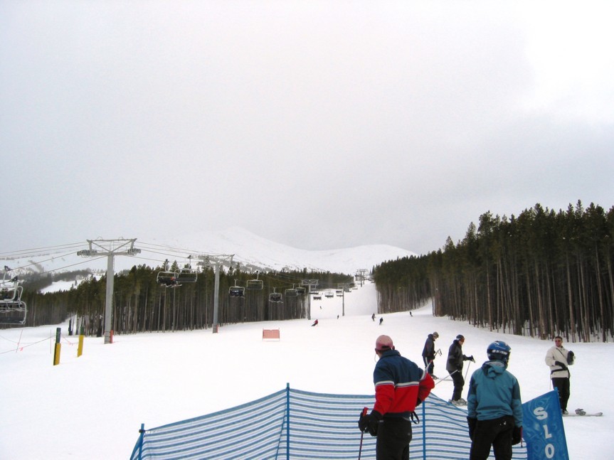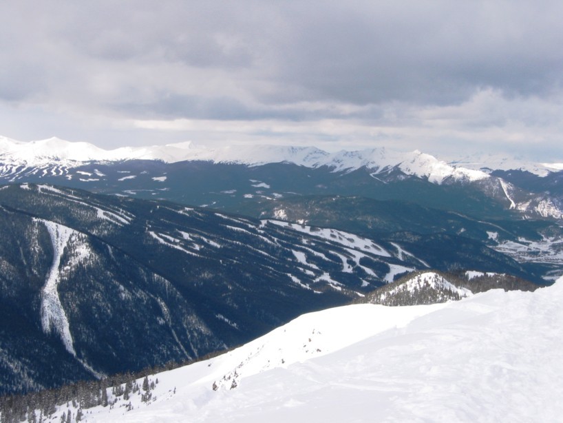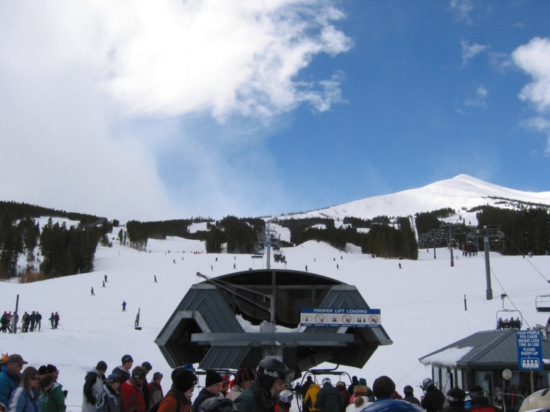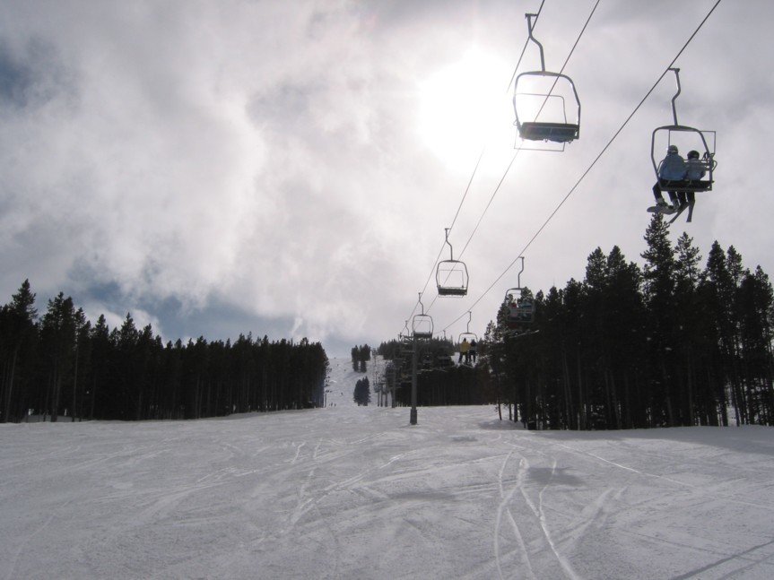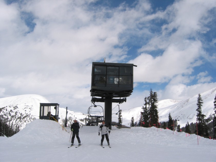 Peak 9: schwierig auf den Punkt zu bringen, höchster Punkt 3494 m, Bergstation 4KSB Mercury Super Chair. Ganz unten ist es sehr flach, die 6KSB Quicksilver Super 6 ersetzte 1999 die erste 4KSB der Welt (1981) gleichen Namens, der Hauptzubringer ins Skigebiet, hat Double Embarquement und schafft 3600 p/h. Hier sehr viele Anfänger und Skikurse, sehr voll. Im oberen Bereich wird diese Bahn von der 3SB Chair A gedoppelt, von der Charakteristik sehr ähnlich. Von der Bergstation Quicksilver kann man durch eine kurze Querfahrt den Peak 10 und die 4KSB Falcon erreichen. Einige Meter höher als die 6KSB startet die Hauptbahn des Peak 9, die 4KSB Beaver Run Super Chair, die beeindruckende 2,8 km den breiten Berg hinaufdonnert, aber nur 485 Hm überwindet. Diese Bahn bedient praktisch alle Hauptabfahrten (Bonanza, Columbia, American, Cashier), die alle ähnliche Eigenschaften aufweisen: breit, ganz oben flache Ouvertüre, dann ein toller mittelsteiler Hang, ab der Hälfte aber immer flacher auslaufend, viele Kreuzungen und Speed Control. Als Entsatz-Anlagen laufen hier noch die 4KSB Mercury Super Chair (auch nur 2,3 km lang) und die DSB Chair C nicht parallel und um einige Meter versetzt. Die schönsten Pisten sind hier wieder die „more difficult trails“ wie „Upper American“, „Peerless“ oder die einsame „Upper Lehmann“, die weiter unten flott einem Taleinschnitt folgt. Auch ein bisschen Tree-Skiing-Gelände gibt es hier, an der DSB Chair E (Nordhang). Als letzter Lift in diesem Bereich startet im unteren Flachteil des Peak 9 die 4KSB Peak 8 Super Connect (2002), eine der seltenen KSBs mit Mittelstation. Mit 2,5 km Länge verbindet sie die beiden Hauptskiberge, an der Mittelstation besteht Zusteigemöglichkeit für Wiederholungsfahrten an der skifahrerisch interessanten 2.Sektion (hier double diamond Buckelpisten). Die Verbindung in Gegenrichtung (also Peak 8 zu Peak 9) stellen die DSBs Chair E und C dar, oder man fährt recht lange Ziehweg.