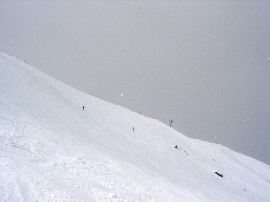 - DSB Pallavicini (405 Hm): nachdem es mit der East Wall gut funktioniert hat, wollen wir bevor wir aus Fitness-Gründen und dem immer mieseren Wetter aufhören für heute, noch eine Steilabfahrt am Pali machen. Fahren die „Pali Main Street“, wirklich übel steil, aber gut zu fahren, teilweise Tiefschnee, kaum Eis, unten ziemlich buckelig und dann als Ziehweg zur Station gewalzt. Sind stolz, tolle Leistung. Sonne kommt kurz wieder heraus.