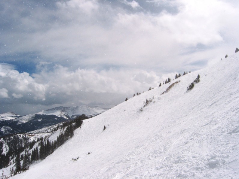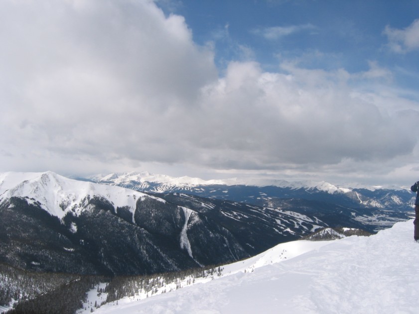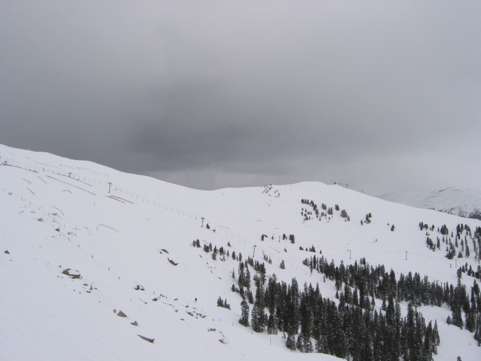 - DSB Norway (284 Hm), Yan ohne Sicherheitsbügel. Das obere Basin ist baumfrei und sehr abwechslungsreich reliefiert mit etlichen präparierten Varianten. Steigen die letzten 10 Hm bis auf den 3800 m hohen Gipfelgrat, dort schon starker Wind, der eine Vielzahl von Wolken vor sich her treibt, toller Blick auf die Continental Divide und die Passstraße zum Loveland-Pass, das Dillon Reservoir und die Skigebiete von Keystone und Breckenridge. Abfahrt „Norway Face“/“Dercum´s gulch“/“Wrangler“. Ganz schöne leichte Abfahrten, leider nur 500 Hm und die recht langsamen fixgeklemmten Sessellifte, eine KSB/EUB von unten mit Mittelstation wäre hier ideal und könnte das gesamte Gebiet erschließen.