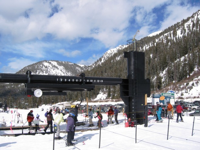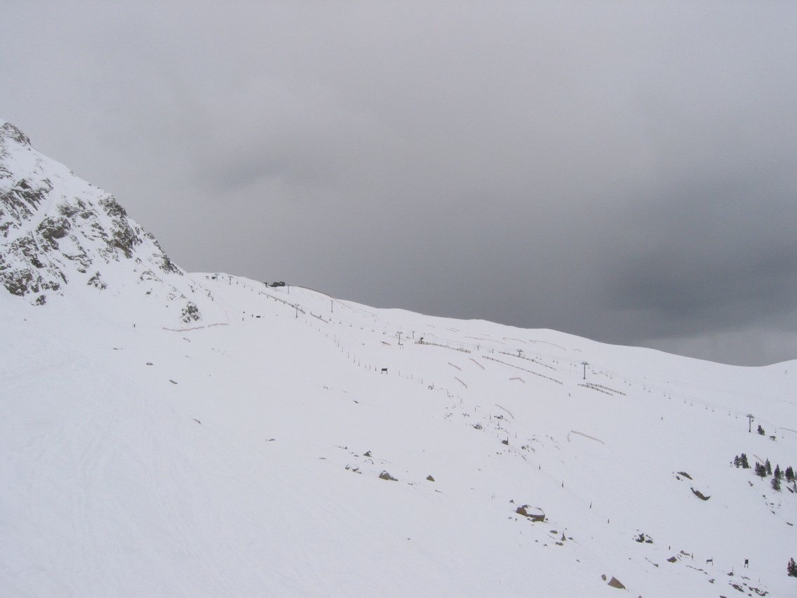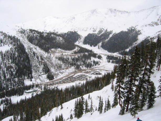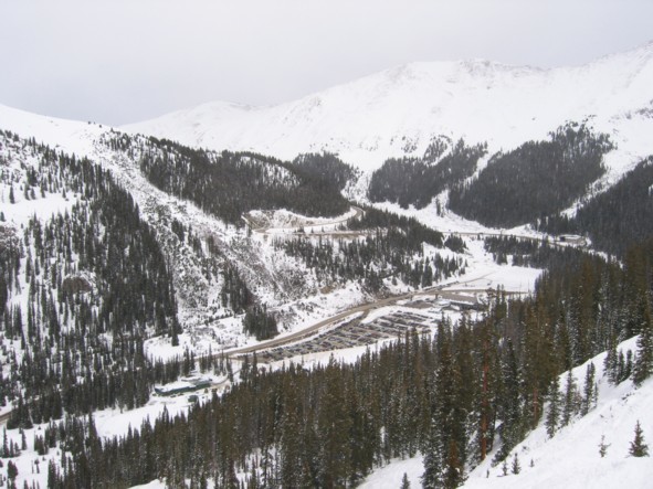 Heute mal etwas länger ausschlafen, das A-Basin öffnet ja erst um 9.00 Uhr. Wetter zunächst viel besser als vorhergesagt, kaum Wolken, viel Sonne. Das A-Basin liegt am Rand des Highway 6, der sich gut ausgebaut hinauf zum 3640 m hohen Loveland-Pass schlängelt. Riesige Trucks fahren dort problemlos hinauf (um die Höhenbeschränkung und Sicherheitsbestimmungen des Eisenhower-Tunnels zu umgehen). Von Keystone sind es nur noch 7 miles. Die Skistation selbst besteht aus drei Parkplätzen, von denen heute nur der „Early Riser“ voll belegt war. Endlich mal „ski à voiture“. Dann gibt es ein Restaurant, ein Liftkartenbüro und drei Sessellifte, wobei die 3SB Exhibition die Hauptarbeit übernimmt. Das Wetter hat dann leider sehr rasch eingetrübt, in den Gipfelbereichen stürmt es, Schneeschauer ziehen durch, teilweise zeigt sich wieder die Sonne, aber generell ist die Sicht im oberen Basin problematisch zu nennen, weil baumfreie Hänge.