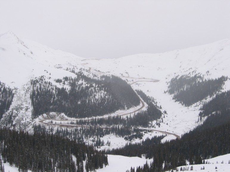 Fahren aus Interesse noch zum 3640 m hohen Loveland-Pass hinauf, viel Schnee aber auch viel verblasen, kein Vergleich zu Schneehöhen in den Alpen in dieser Höhe. Trotzdem krass so hoch mit dem Auto hinauffahren zu können, ebenso die riesigen Trucks.
