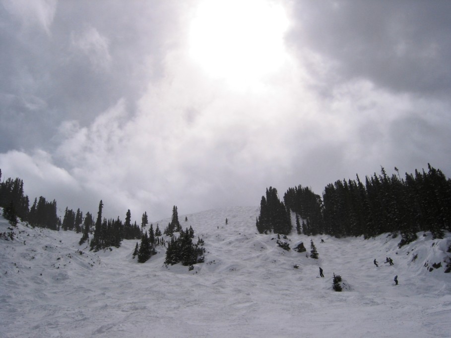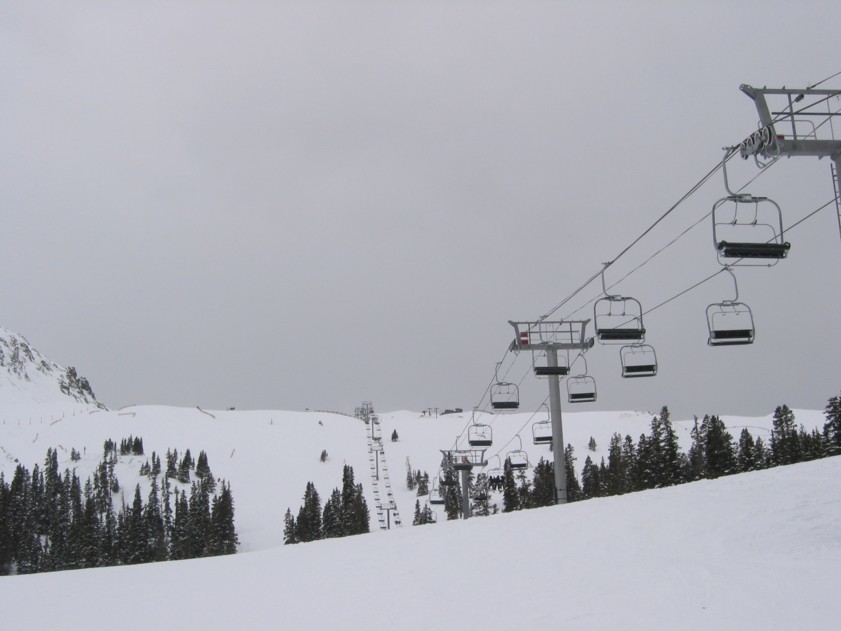 Im A-Basin erschließen ganze vier fixgeklemmte Sessellifte sage und schreibe 69 Abfahrten, es wird also nicht so schnell langweilig. Das Problem ist, wie so häufig, das die überwiegende Mehrzahl davon Buckel- oder Tiefschneehänge sind – was passiert, wenn diese den ganzen Tag fährt, haben wir zur Genüge an unseren an diesem Tag doch sehr müden Füßen spüren können. Die Waldabfahrten an der 3SB Exhibition sind, wie nicht anders zu erwarten, sehr schön, teilweise flott, teilweise gemütlich, nie überlaufen. Im oberen Bereich erweist sich die Baumfreiheit dann aber gleich als dickes Minus, wenn nämlich das Wetter, wie bei unserem Besuch eher bescheiden ist – Sicht gleich sehr schlecht, was sich auf nicht gewalzten Hängen gleich doppelt bemerkbar macht.