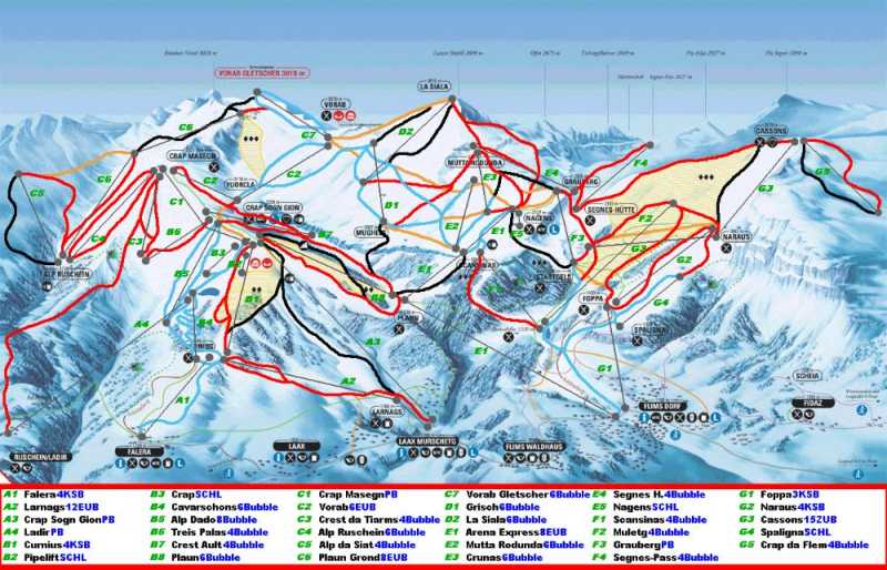 Zu B4: Ich dachte, wenn von Laax Murschetg eine 12 Gondelbahn hochführt und von Falera eine 4 Sesselbahn, dann ist eine 4 Sesselbahn ein bisschen wenig, um ohne viel anstehen ist Skigebiet zu gelangen. Außerdem können Anfänger die Pisten Val Marina und Kids Trail hoch und runter fahren.